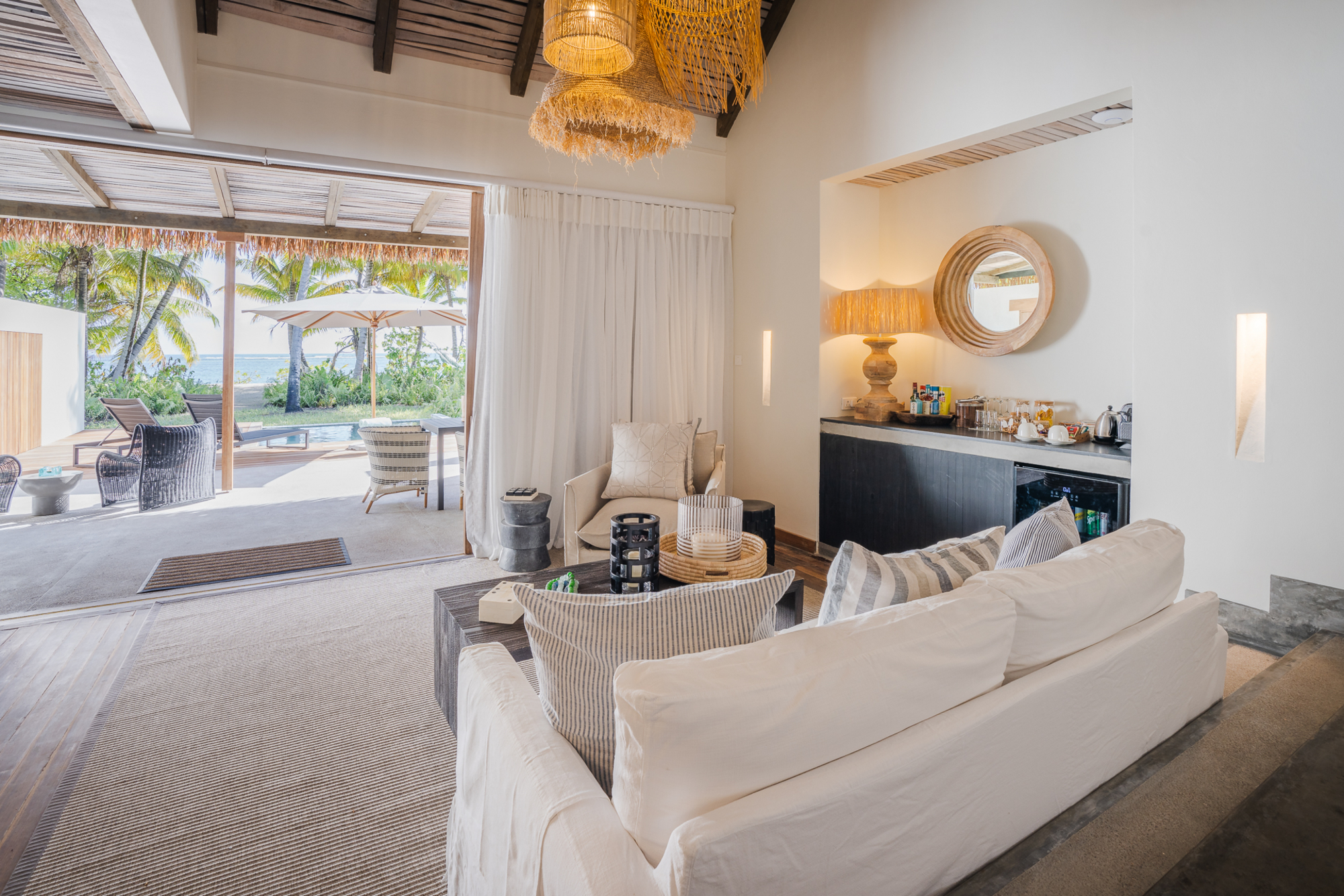 Die Lodge bietet 22 Beach Bungalows, 5 Beach Villas und 2ein Beach Retreat. Die Bungalows sind einzeln stehende Einheiten mit 58 m² Wohnfläche, möblierter Veranda, Schlafzimmer mit Doppelbett oder Twin-Betten, Sitzbereich, Schreibtisch, Minibar, Ventilator und Klimaanlage. Die Bäder verfügen über Dusche, Waschbecken, WC sowie fließend Warm- und Kaltwasser. Die Suiten und Villen bieten zusätzlichen Wohnraum, Innenlounge und teilweise eigene Gärten. Die Unterkünfte stehen in Strandnähe unter Palmen, sind über befestigte Wege mit dem Zentrum verbunden und verfügen über Privatsphäre, aber keine Abgrenzung zum Gelände. Moskitonetze und WLAN sind vorhanden.