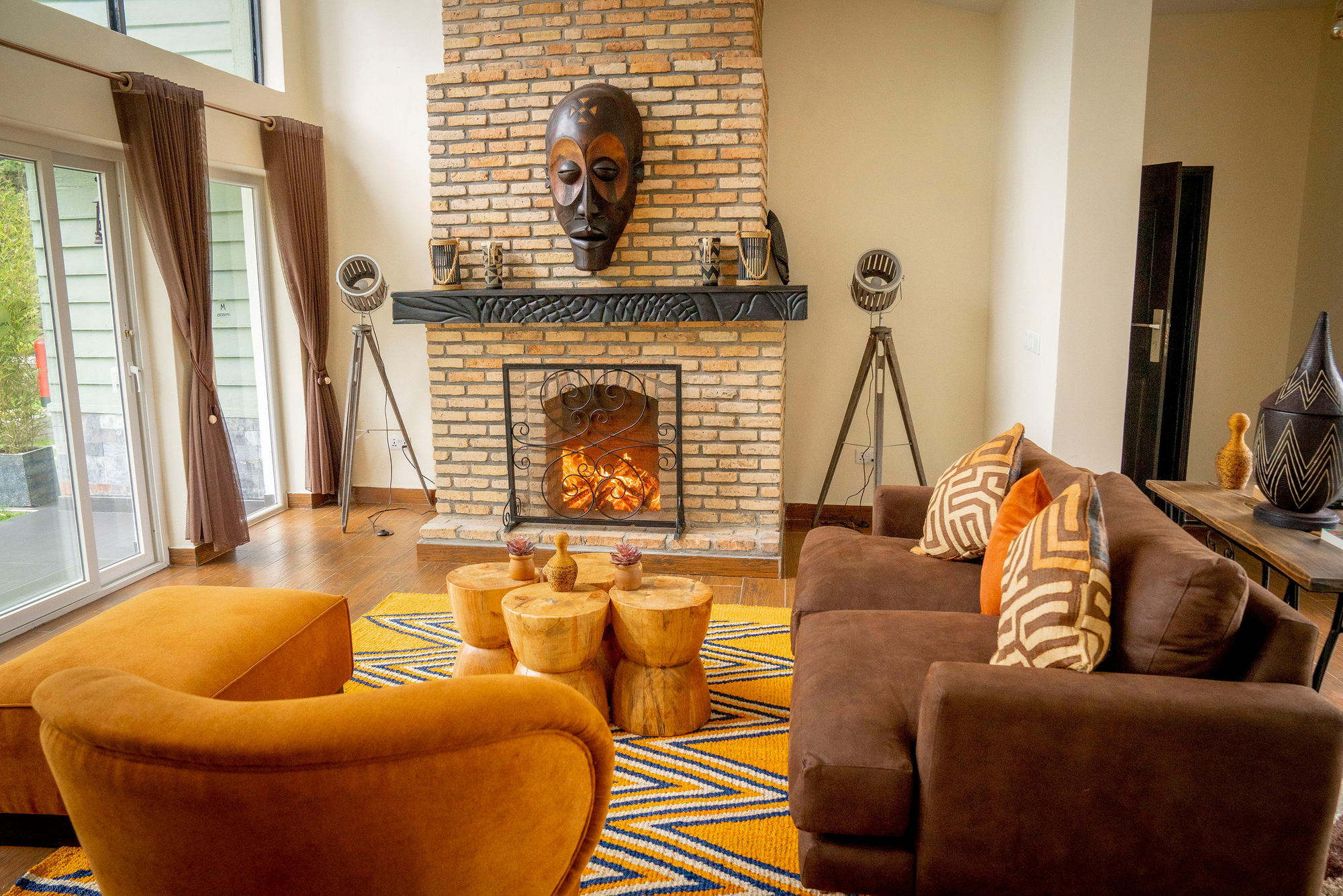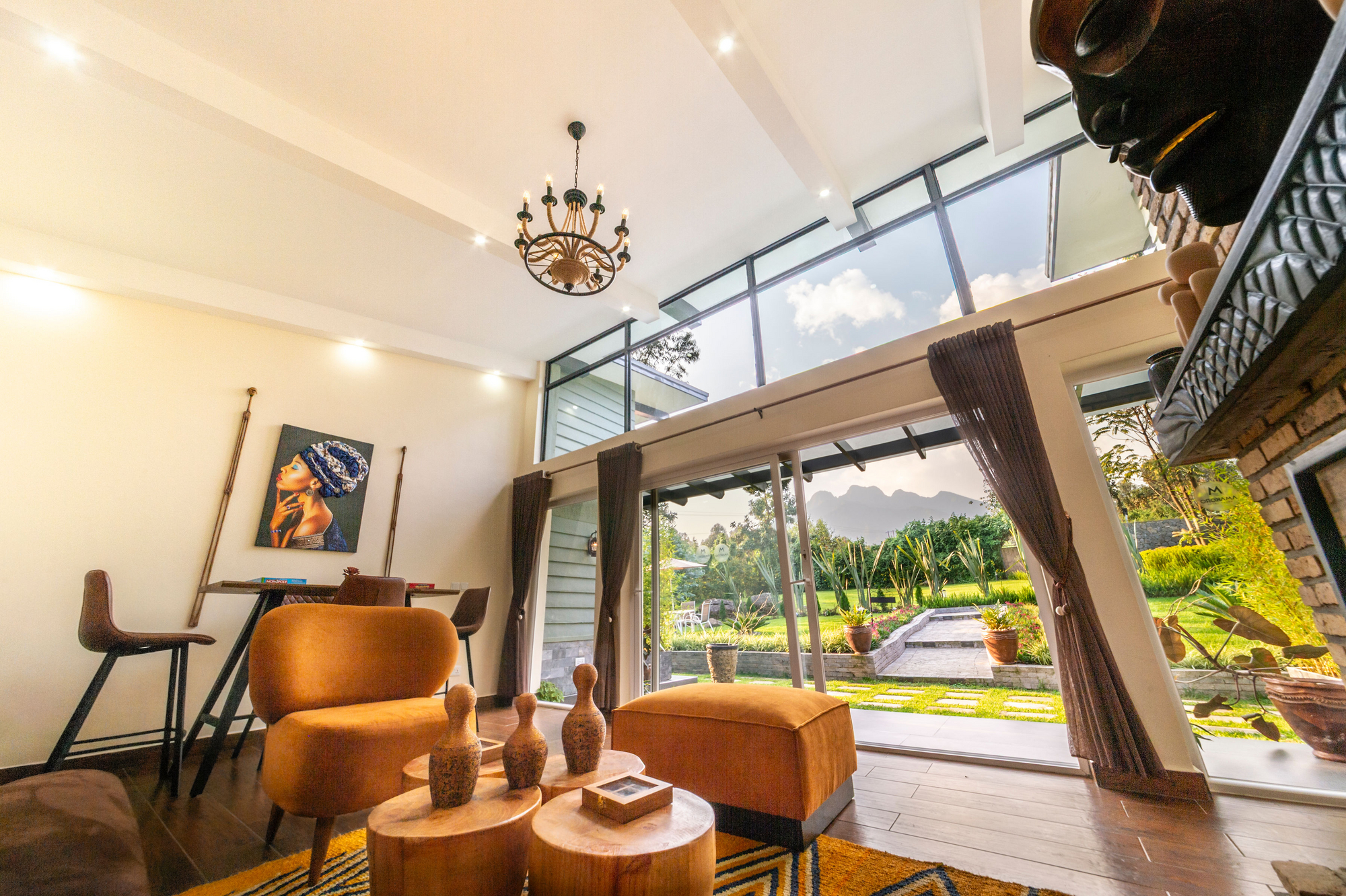 Die sechs individuell gestalteten Gästezimmer der Lodge verteilen sich auf separate Gebäude, die durch den Garten zugänglich sind. Jedes Zimmer bietet eine private Terrasse mit Sitzgelegenheiten, die einen malerischen Ausblick auf den Garten und die Vulkanlandschaft des nahegelegenen Nationalparks ermöglicht. Die Zimmer sind rustikal eingerichtet, mit Naturholzmöbeln und ethnischen Dekorationen, und verfügen über einen Wohnbereich, ein Bett mit Nachttischen sowie ein privates Bad mit fließend warmem Wasser, Waschbecken und Badewanne. Ein Tisch mit Stühlen rundet die Ausstattung ab.