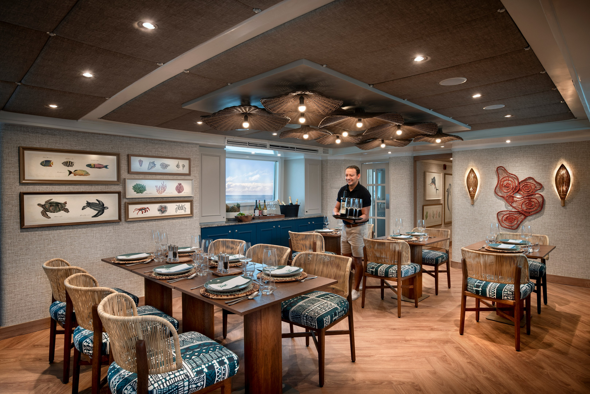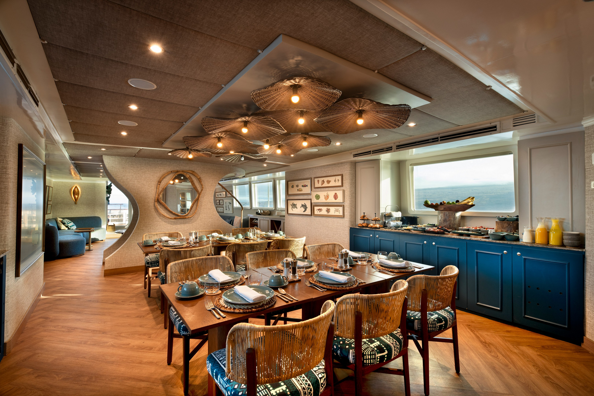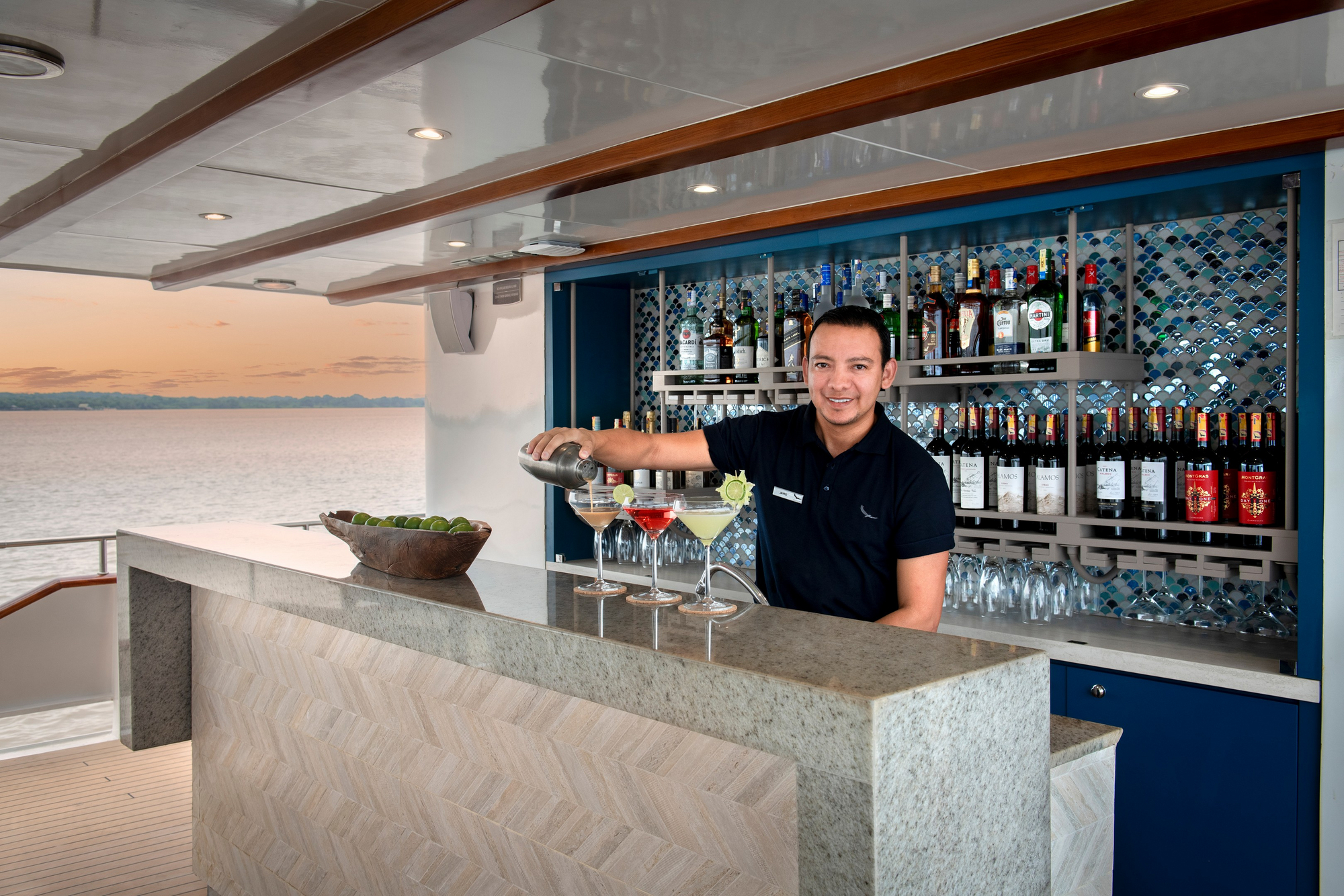 Vollpension an Bord mit täglich frisch zubereiteten Mahlzeiten. Frühstück und Mittagessen häufig in Buffetform, Abendessen als mehrgängiges Menü. Internationale Küche mit regionalen Einflüssen aus Ecuador. Getränkeauswahl entsprechend gehobenem Expeditionsstandard.
