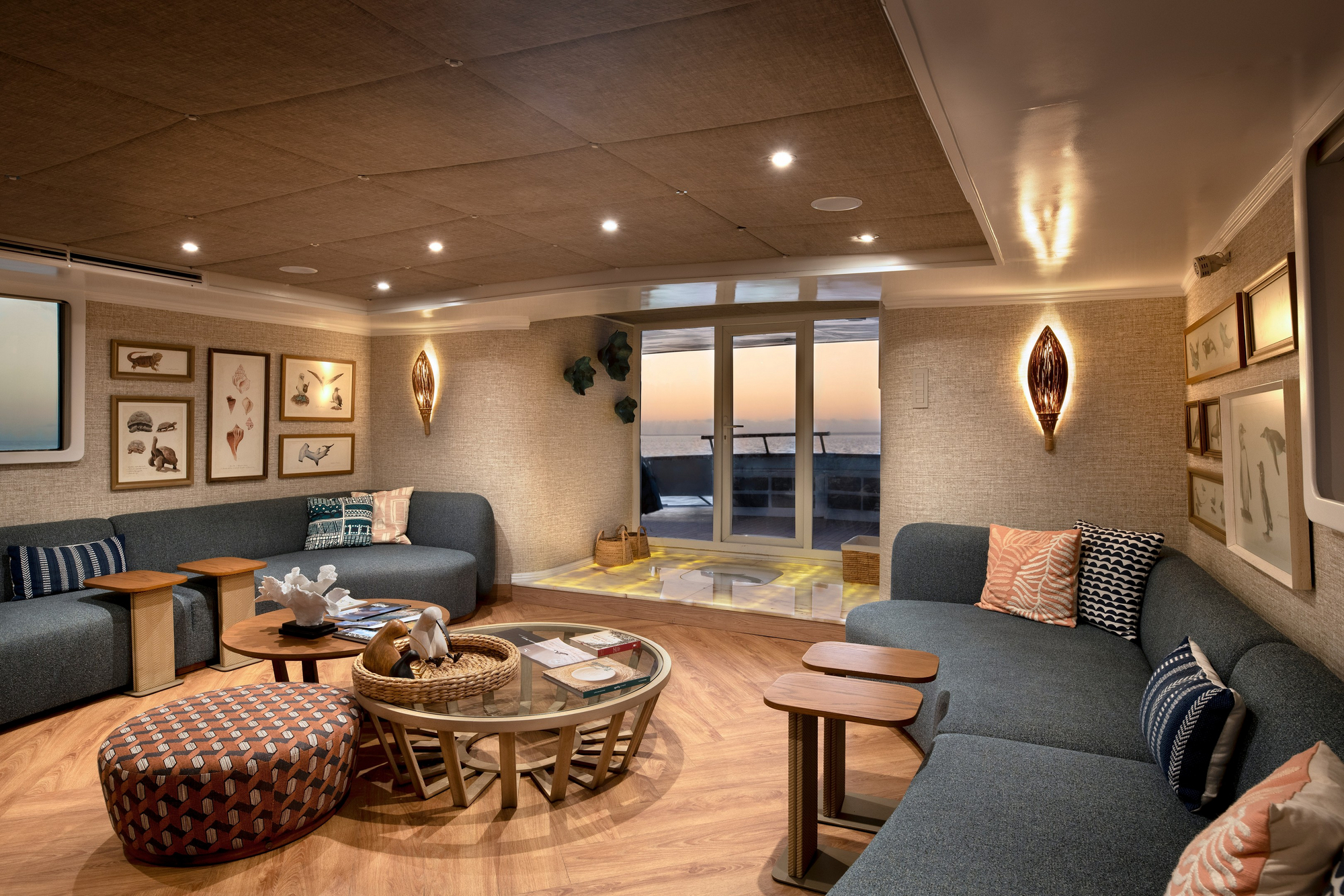 Die Galapagos Explorer ist eine motorisierte Expeditionsyacht mit mehreren Decks. An Bord befinden sich ein großzügiger Salon mit Lounge- und Essbereich, eine Bar, Außendecks mit Sitz- und Liegebereichen sowie ein teilweise überdachtes Sonnendeck. Das Design ist modern und maritim, mit hellen Holzelementen, großen Fensterflächen und klarer Linienführung. Die Yacht ist stabil gebaut und für Küstennavigation zwischen den Inseln konzipiert. Ein separater Bereich dient der Vorbereitung von Landgängen und Schnorchelausflügen.