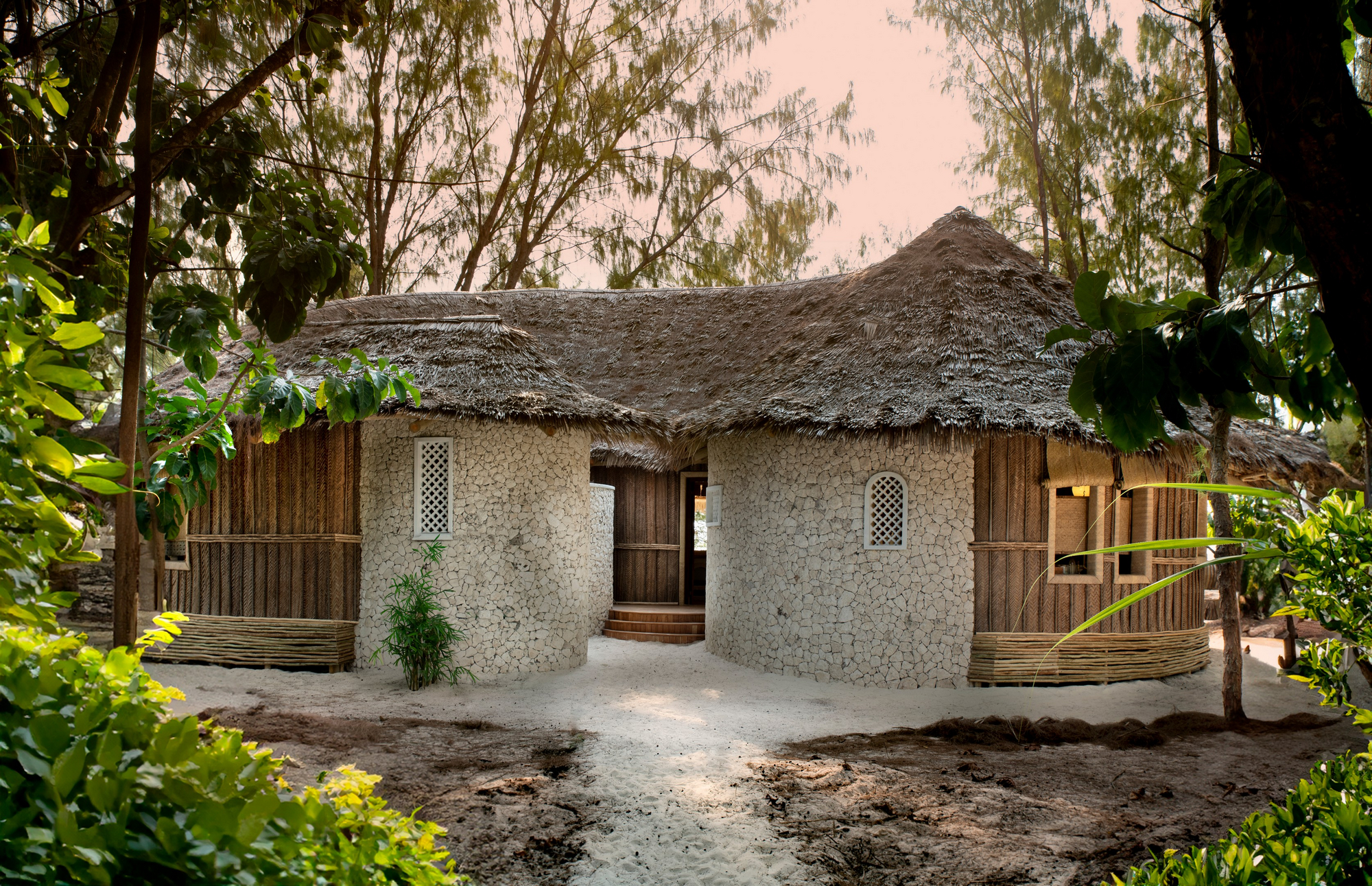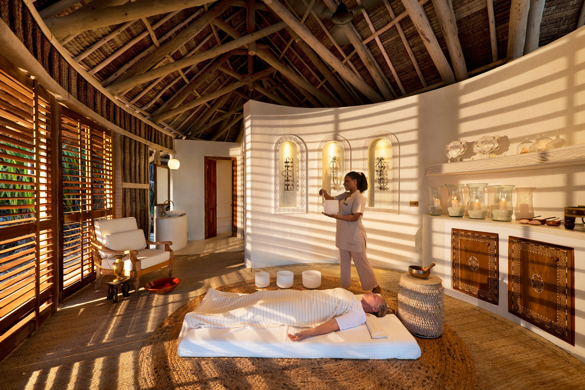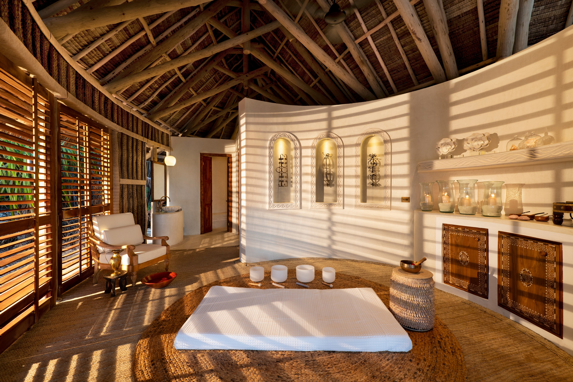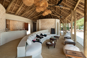 Die zentralen Bereiche der Lodge sind offen, luftig und bewusst zurückhaltend gestaltet, um den Blick stets auf das Meer und den Strand zu lenken. Lounge, Bar und Essbereich gehen fließend ineinander über und sind unter Makuti-Dächern angeordnet. Natürliche Materialien wie Holz, Korbgeflecht, Leinen und Baumwolle dominieren das Design, ergänzt durch helle Sand-, Creme- und Blautöne, die das Licht reflektieren und die Farben von Strand und Ozean aufgreifen. Der Hauptbereich öffnet sich direkt zum Strand und zum Indischen Ozean, sodass Mahlzeiten, Sundowner und Aufenthaltsbereiche stets von Meeresrauschen und freiem Blick begleitet werden. Ergänzt wird dies durch diskrete Rückzugsorte, schattige Sitzbereiche und offene Terrassen. Der Wellnessbereich bietet Massagen und Behandlungen in ruhiger Strandnähe, oft mit Blick auf das Meer. Yoga-Sessions finden in offenen, luftigen Bereichen statt und sind auf Entspannung und Achtsamkeit ausgerichtet.