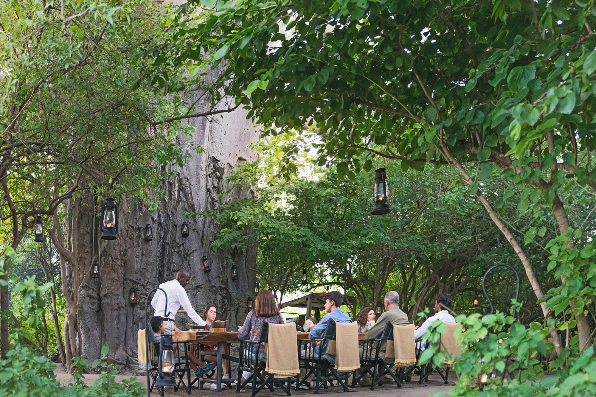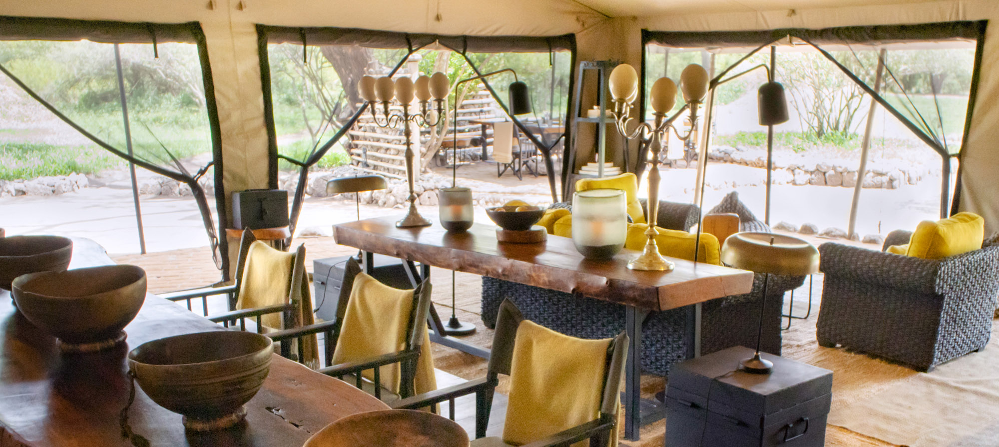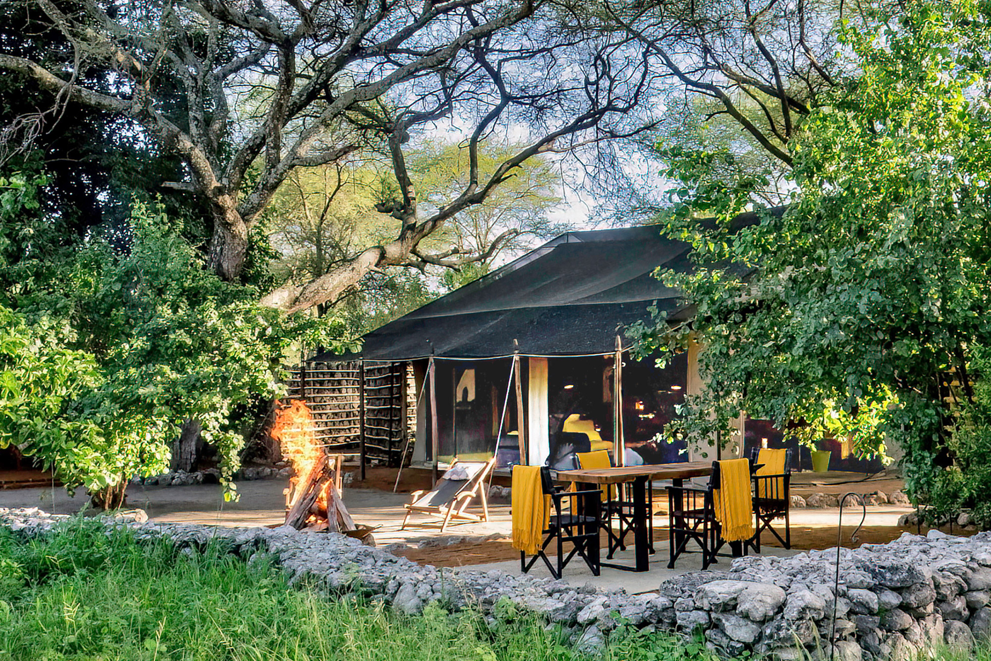 Das Camp kann man nur als Ganzes buchen. Hauptbereich unter Fieberbäumen mit Lounge, Bar, Speisezelt, Swimmingpool und Feuerstelle. WLAN in Hauptbereich und Zelten verfügbar.