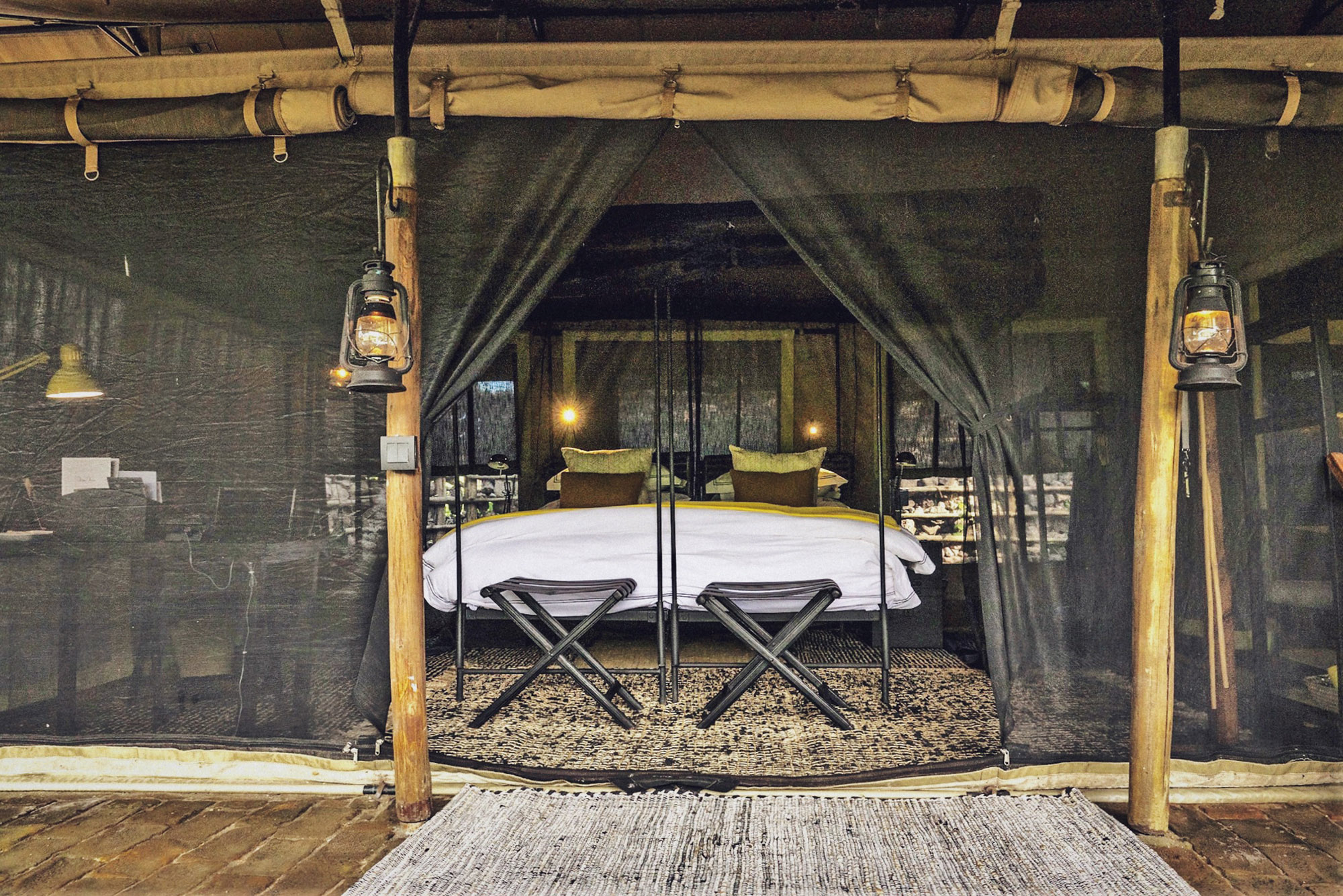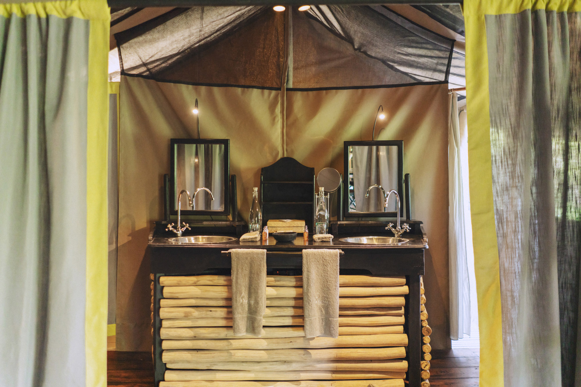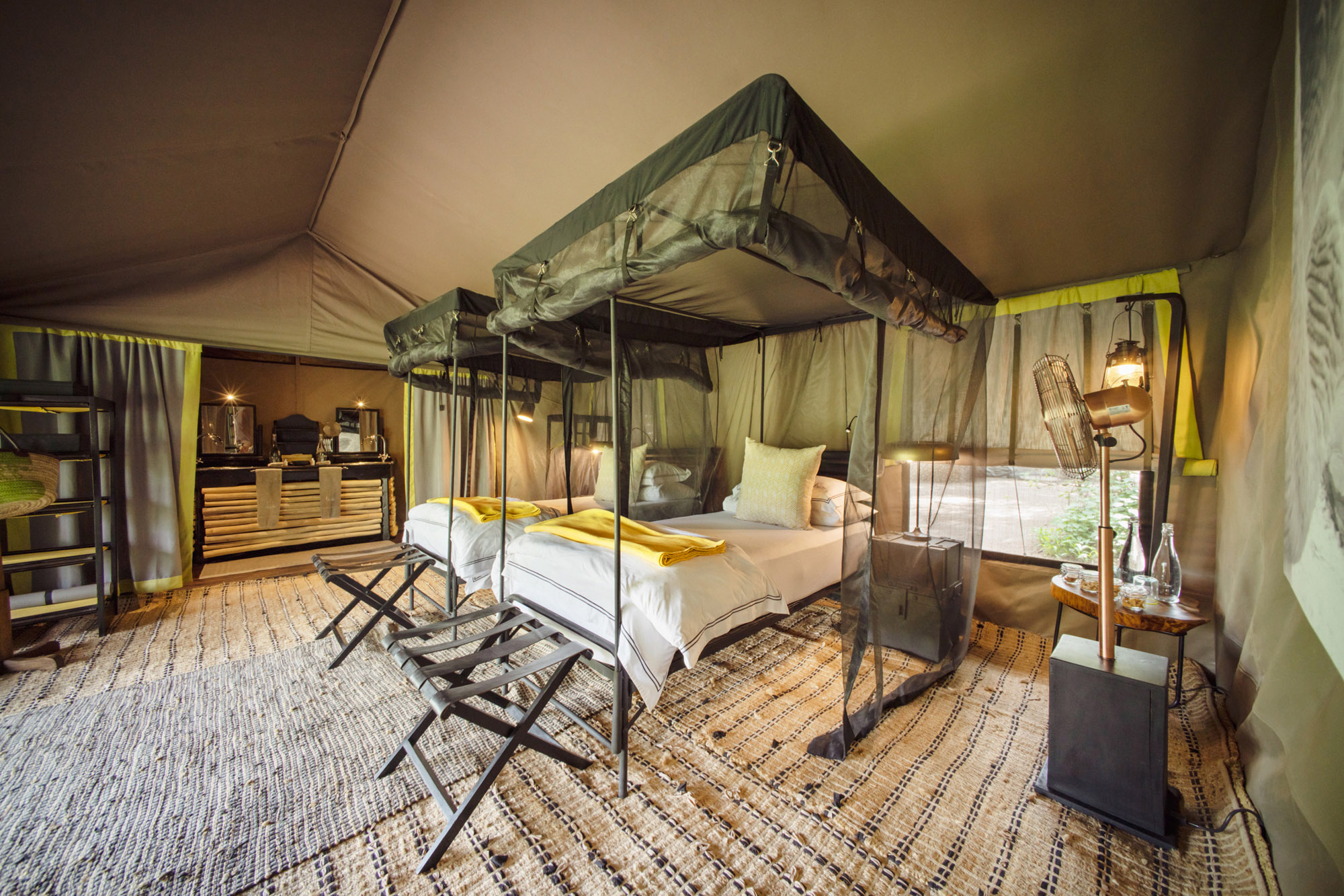 Vier Zeltunterkünfte – drei klassische Suiten und eine Familien-Suite mit zwei Schlafzimmern und zwei Badezimmern. Jede Einheit bietet Terrasse, Innen- und Außendusche, Moskitonetz und hochwertigen Safari-Stil.