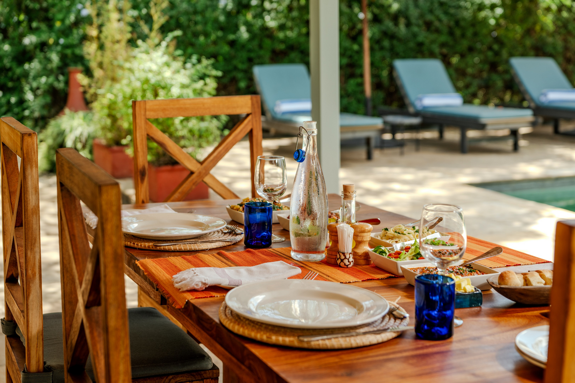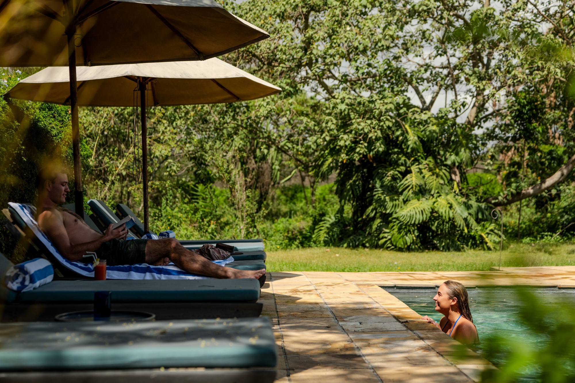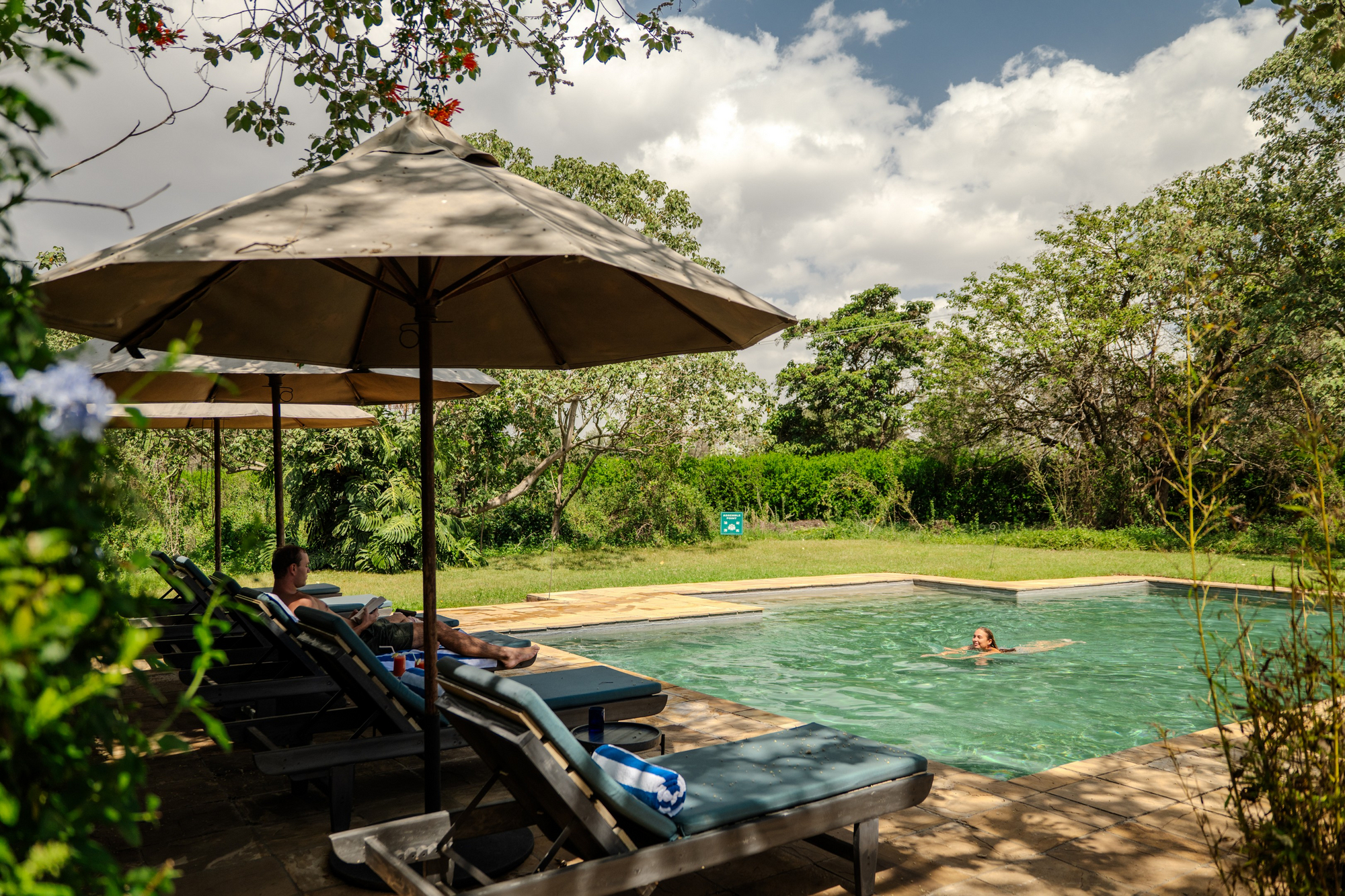 Das Haus verfügt über einen offenen Lounge- und Essbereich mit Blick in den Garten. Ein Swimming Pool mit Liegebereich ist zentral in die Anlage integriert. Die Architektur verbindet kolonial inspirierte Elemente mit moderner Zurückhaltung. Holz, Naturstein und gedeckte Farbtöne prägen das Erscheinungsbild. Die Atmosphäre ist ruhig und wohnlich, nicht hoteltypisch anonym.