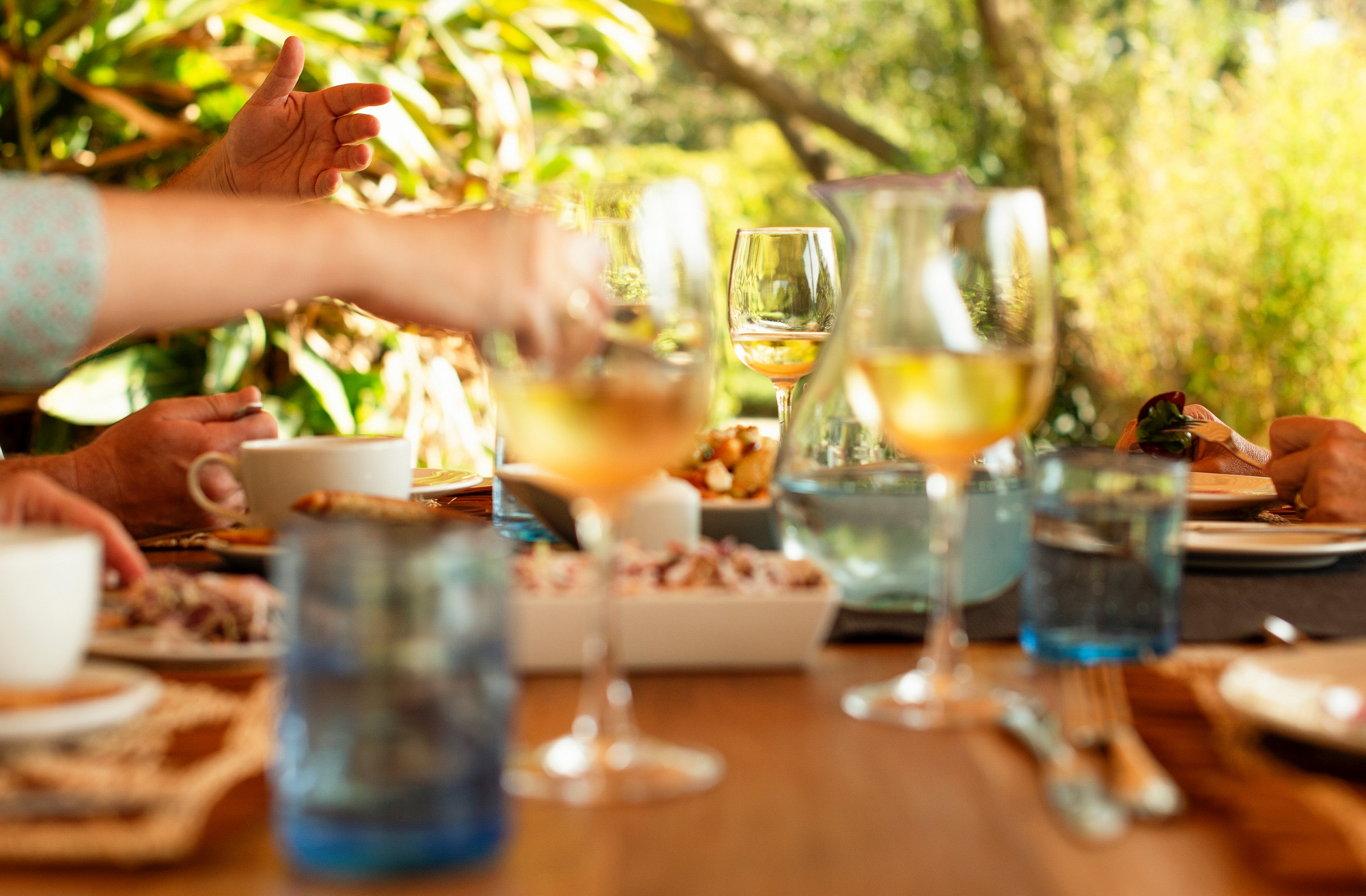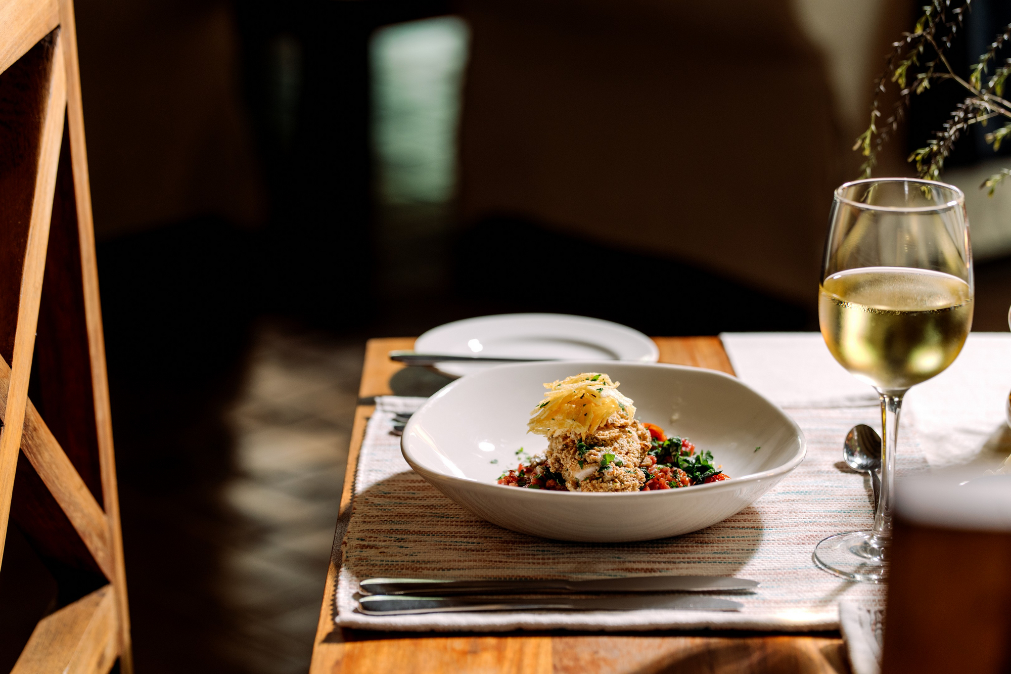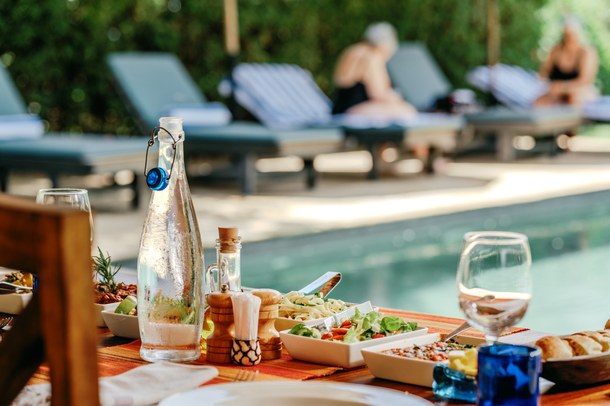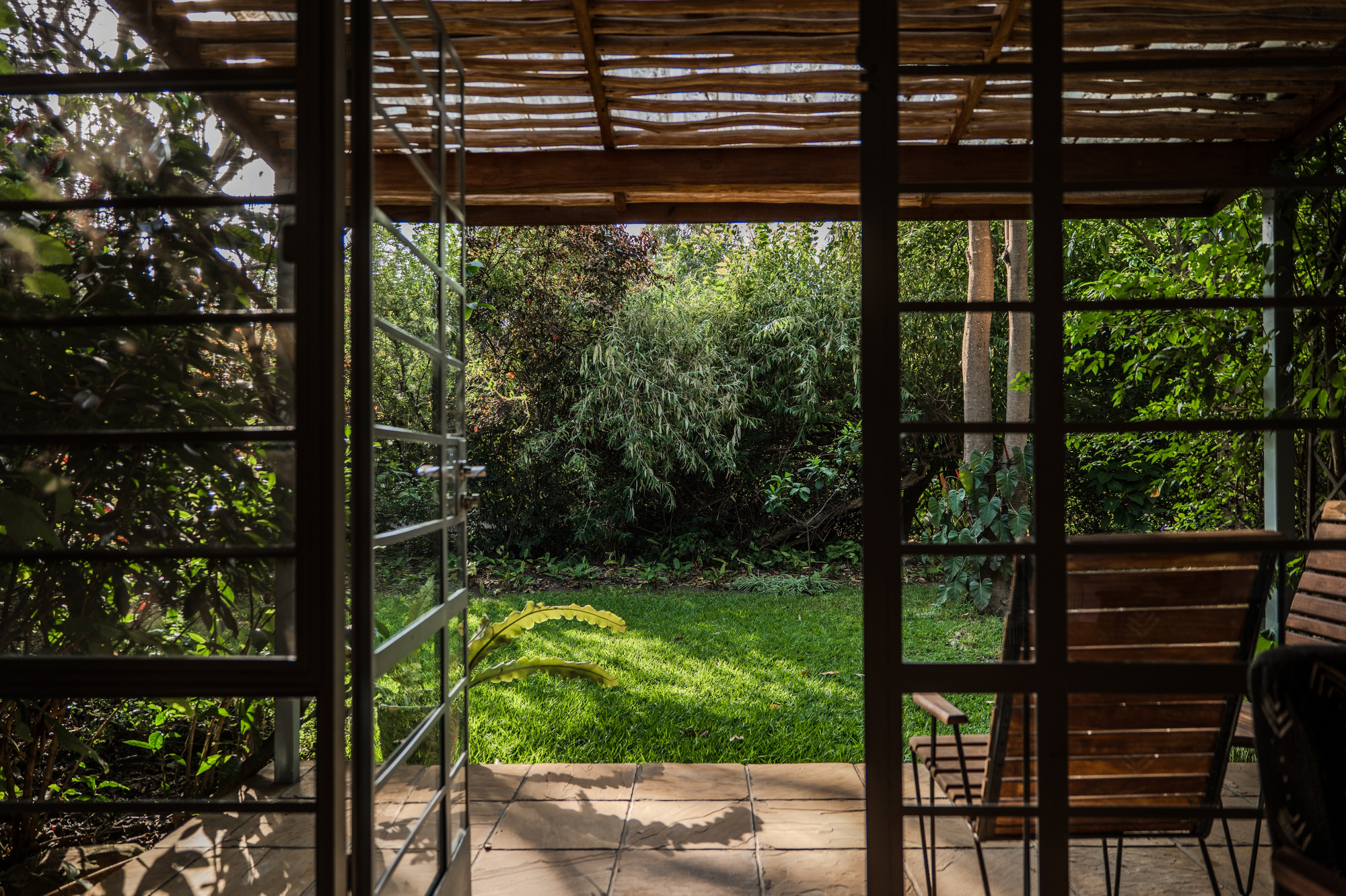 Das Haus verfügt über einen offenen Lounge- und Essbereich mit Blick in den Garten. Ein Swimming Pool mit Liegebereich ist zentral in die Anlage integriert. Die Architektur verbindet kolonial inspirierte Elemente mit moderner Zurückhaltung. Holz, Naturstein und gedeckte Farbtöne prägen das Erscheinungsbild. Die Atmosphäre ist ruhig und wohnlich, nicht hoteltypisch anonym.