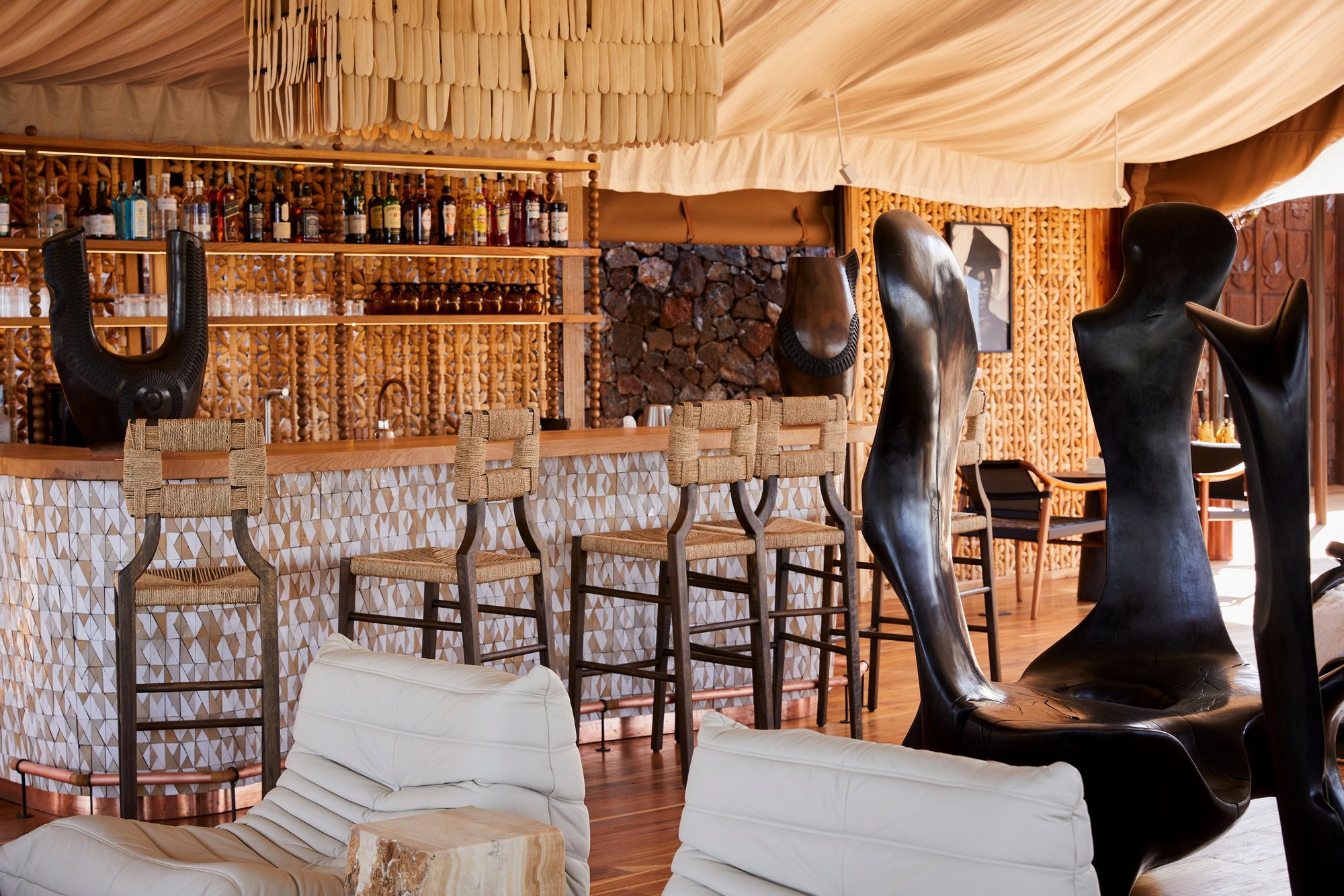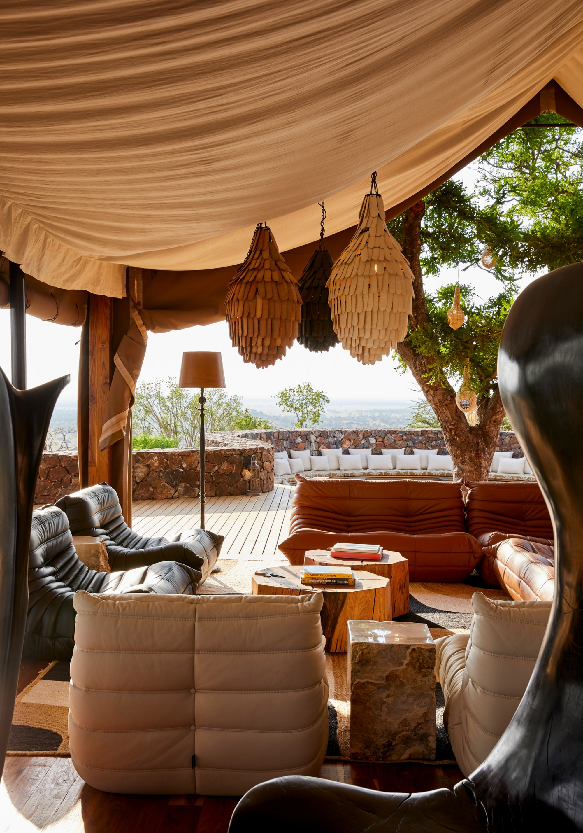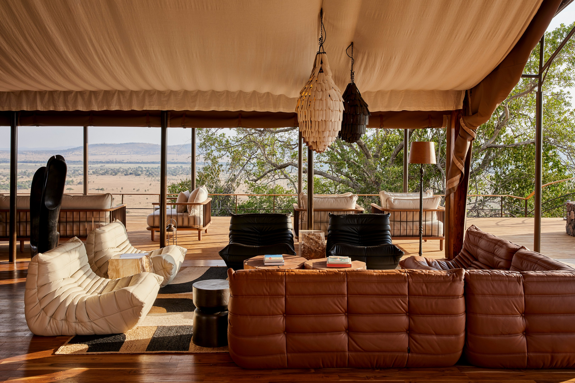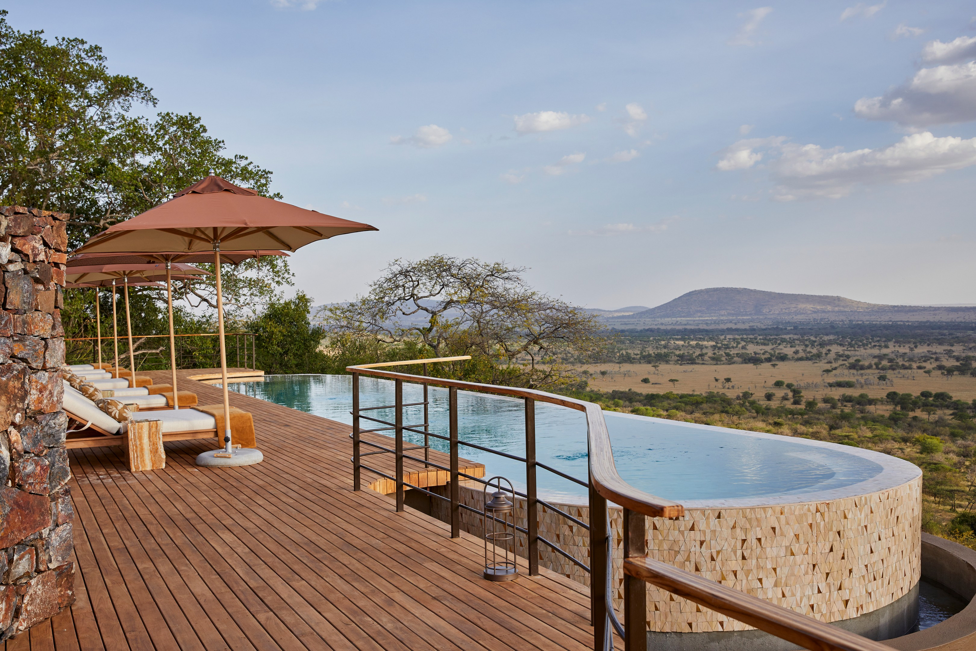 Großzügiger Innen-/Außen-Loungebereich mit Bar, Art-Gallery, Infinity Pool, Spa-Bereich, Fitnessraum (Technogym), kleiner Bibliothek und Dining-Terrasse mit Blick über die Serengeti. Alle Einrichtungen solar-und hybrid-energetisch betrieben.