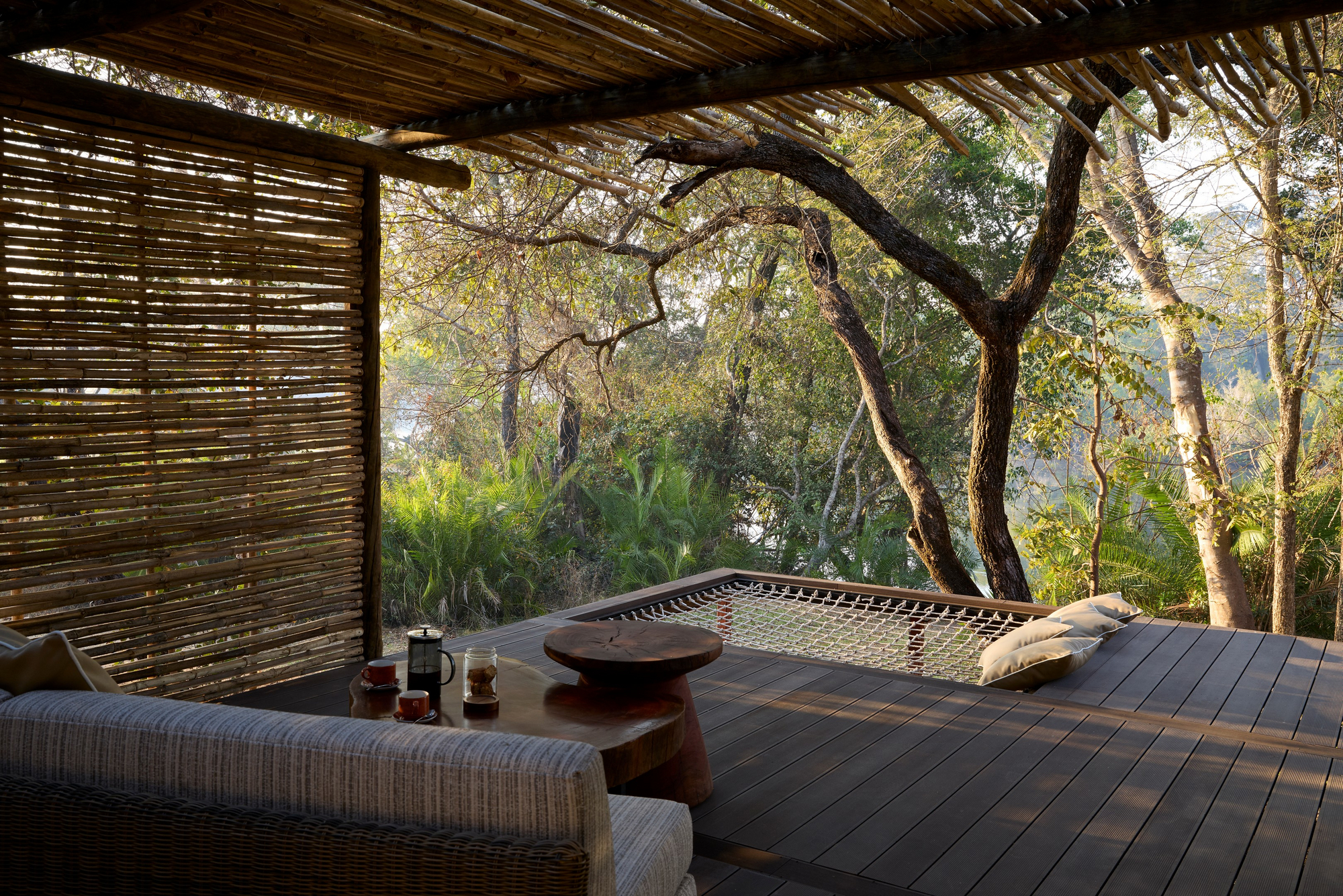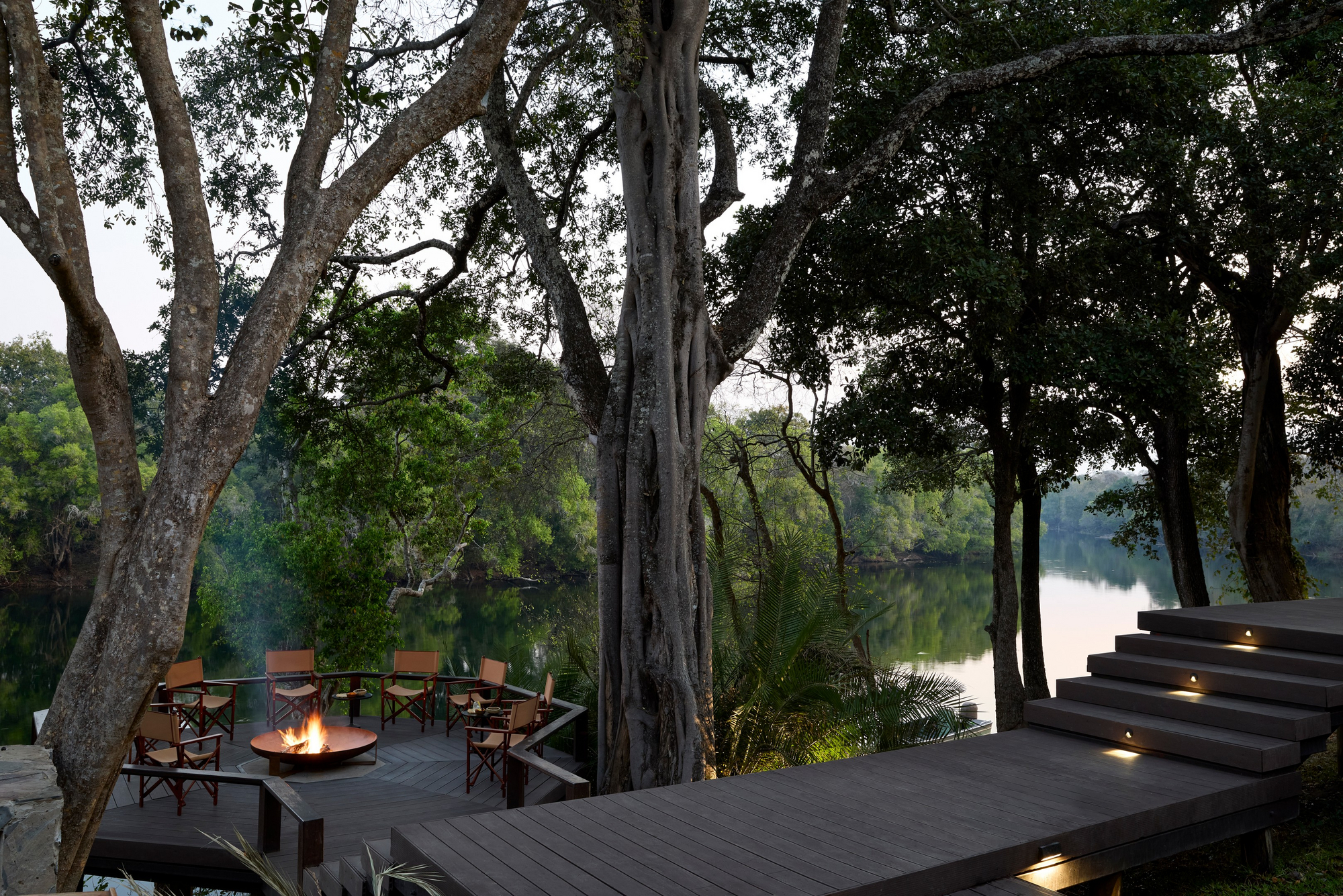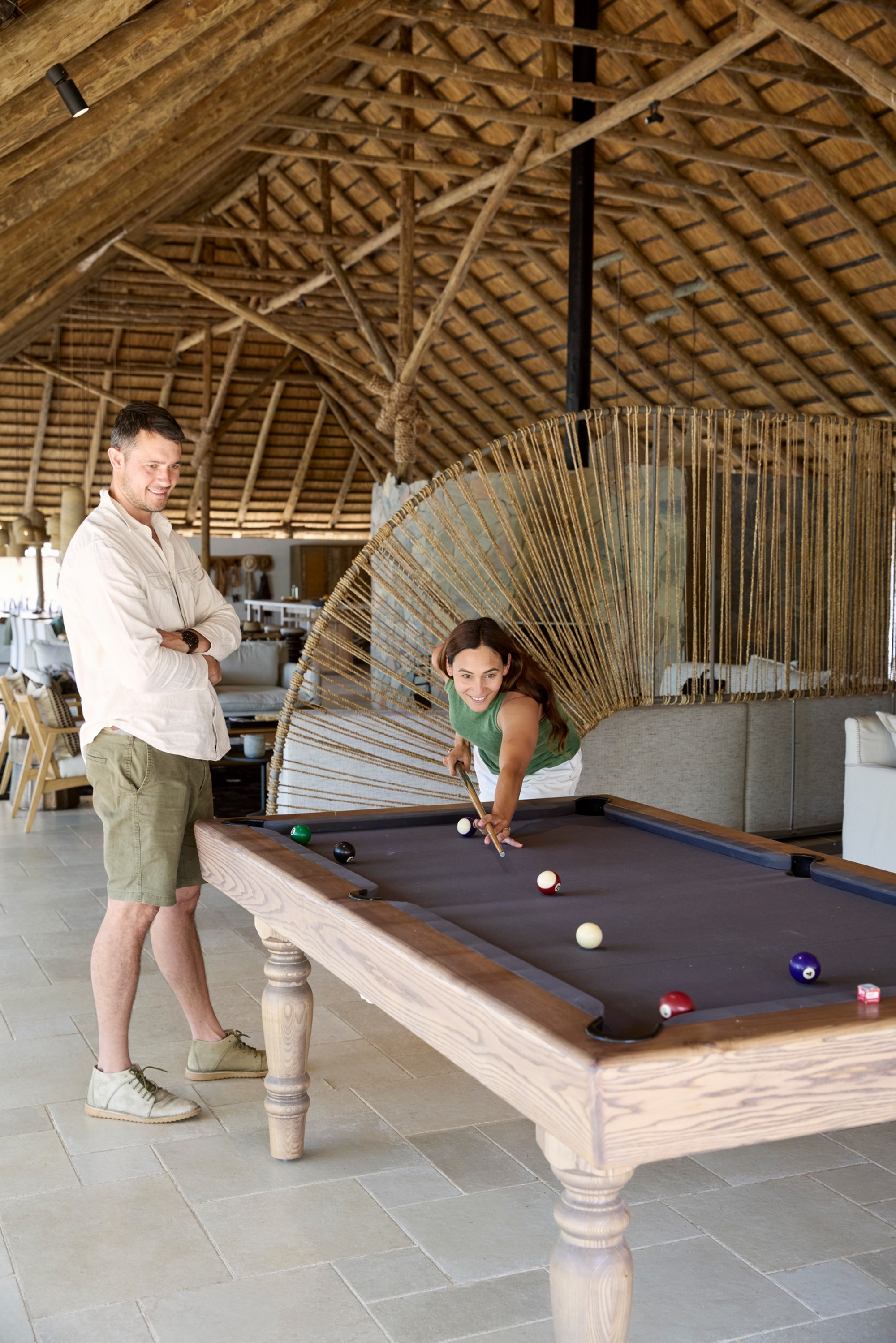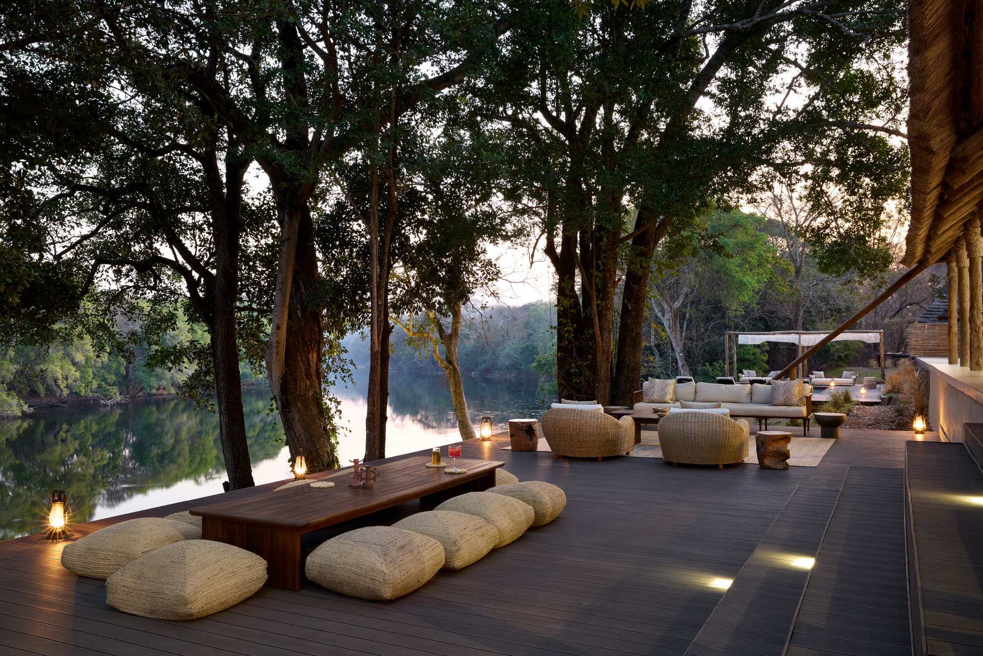 Im Herzen der Lodge befindet sich ein großzügiger Gemeinschaftsbereich, der als Treffpunkt für die Gäste dient. Hier können Besucher in entspannter Atmosphäre speisen, sich austauschen oder einfach die Ruhe der Umgebung genießen. Die offene Architektur und die Verwendung von organischen Elementen sorgen für eine einladende und warme Atmosphäre. Zudem verfügt die Unterkunft über einen ruhigen Pool am Flussufer, einen Essbereich mit Blick auf den faszinierenden Lunga River, einen voll ausgestatteten Fitnessraum und ein gut ausgestattetes Spa.
