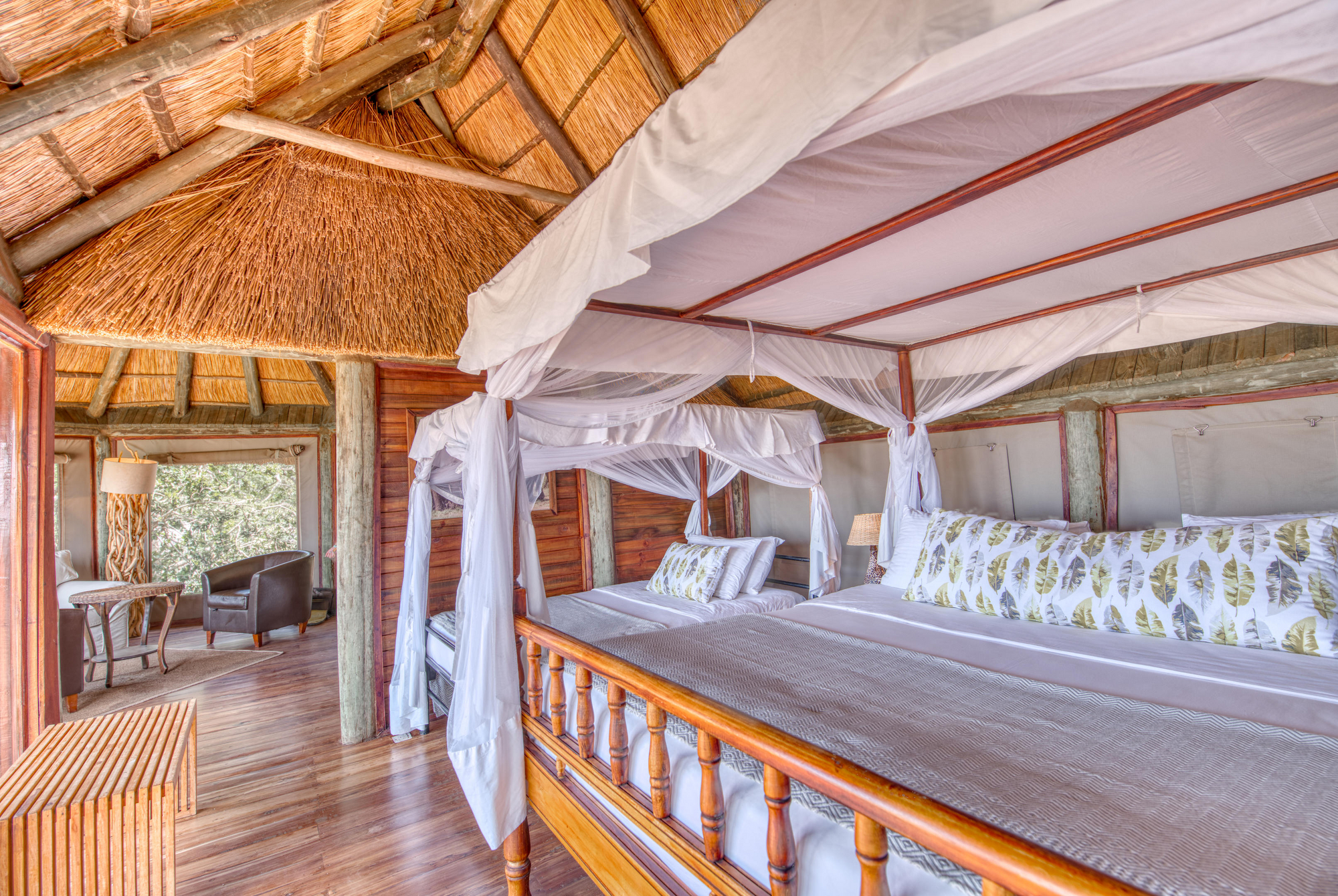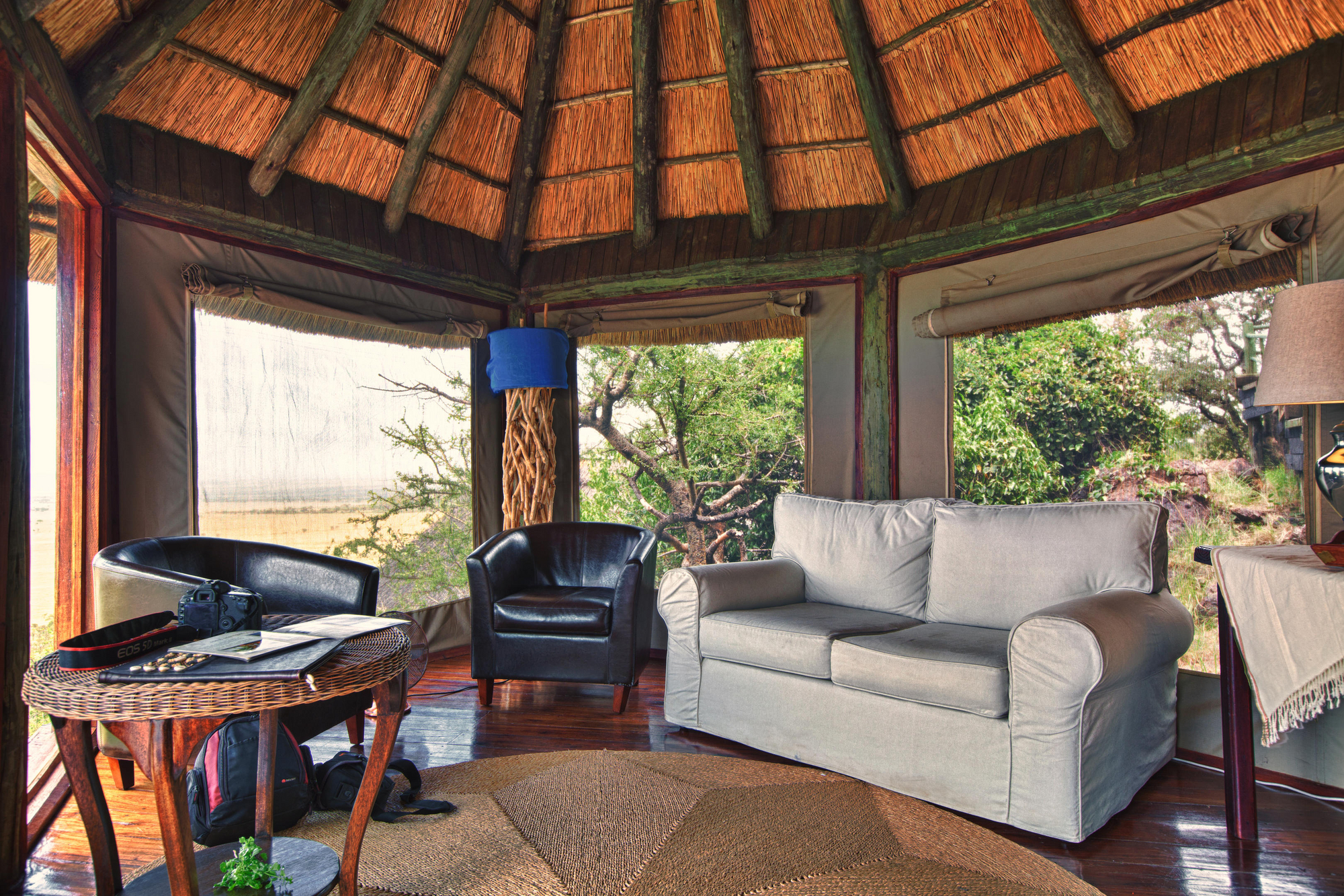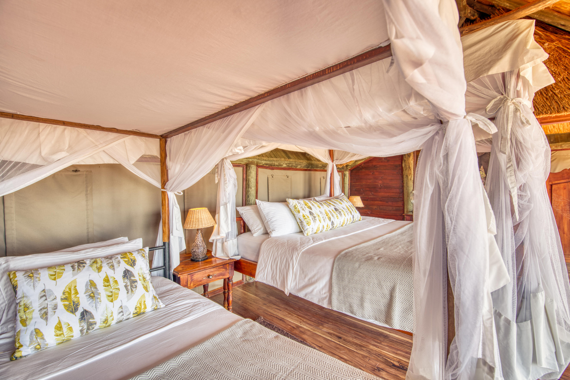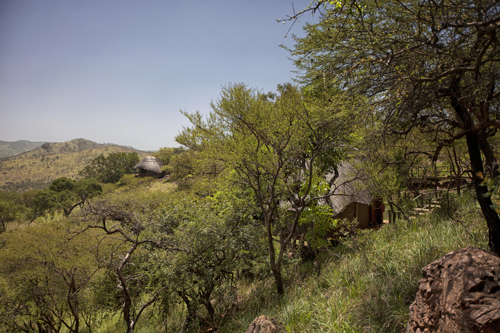 12 Doppelzimmern, 5 Zimmer mit 2 Einzelbetten, 3 Dreibettzimmern, 3 Familienzimmern für 4 Personen und 2 Honeymoon Safari Rooms . Die meisten Zimmer stehen auf Holzplattformen am Hang mit privater Veranda, Moskitonetz, Außendusche und Bad mit WC, Waschbecken sowie fließend Warm- und Kaltwasser. Veranda mit Lounge-Stühlen und Fernblick. Standventilatoren.