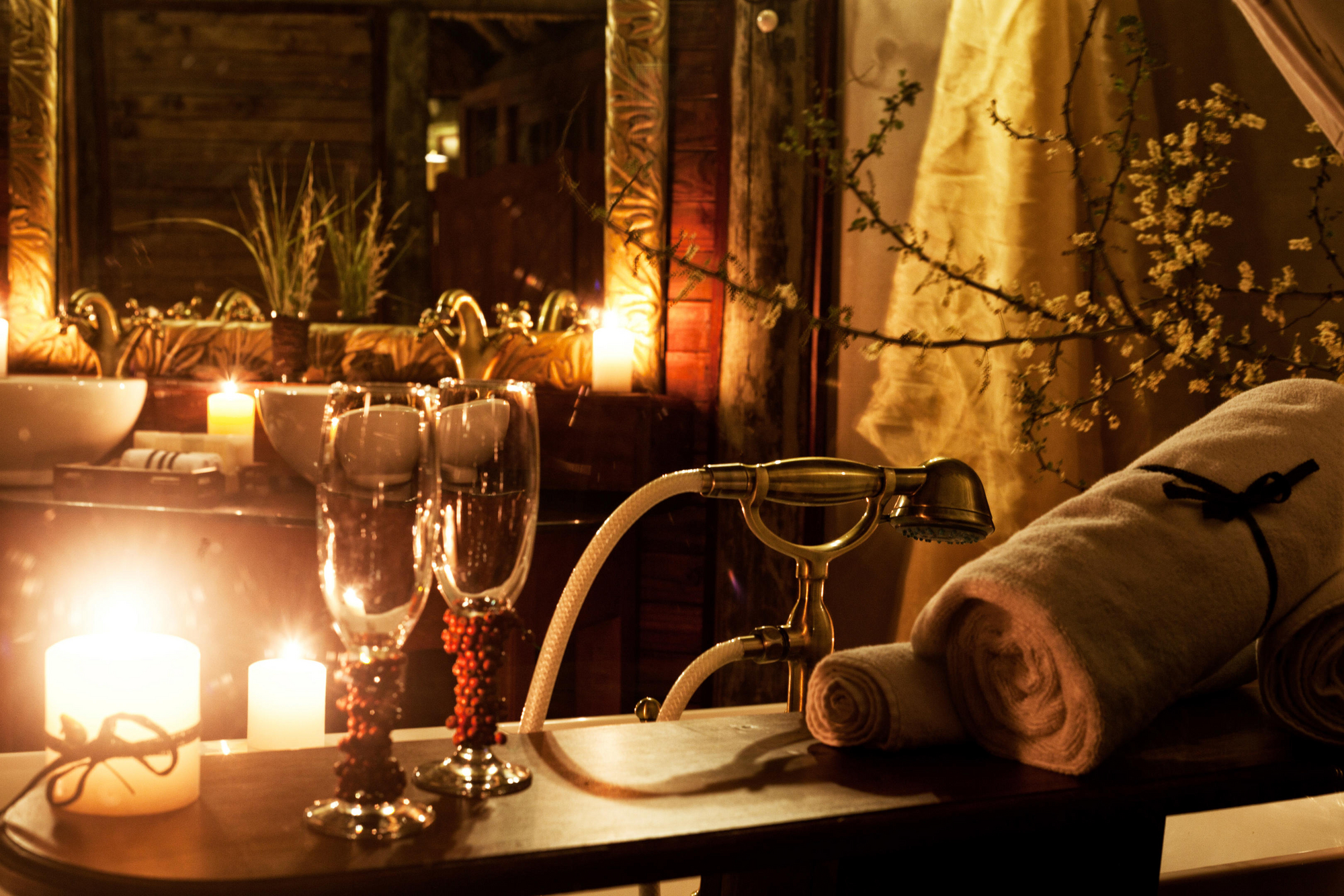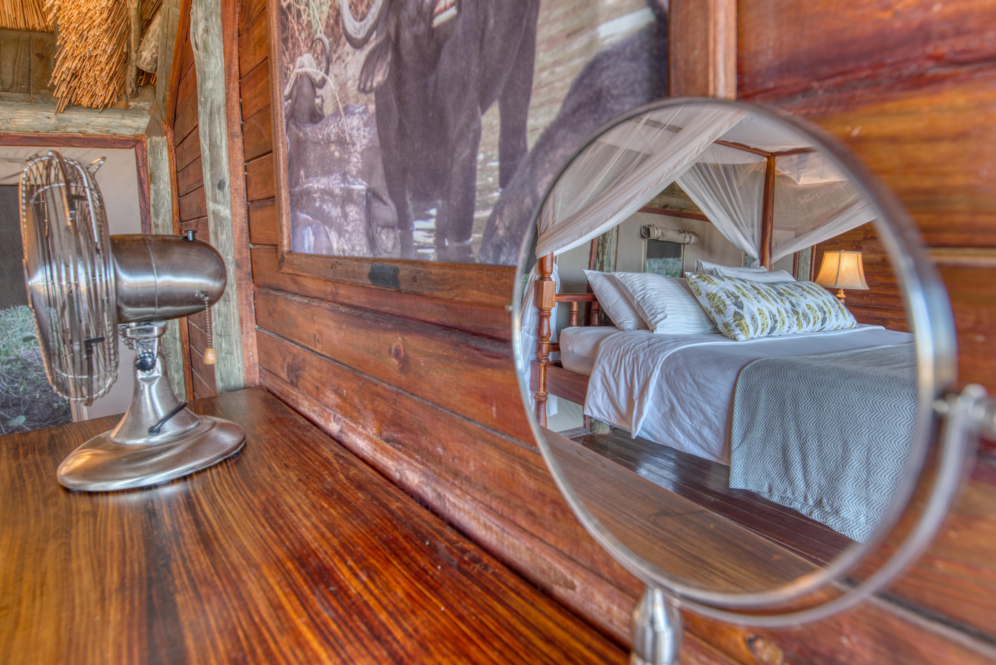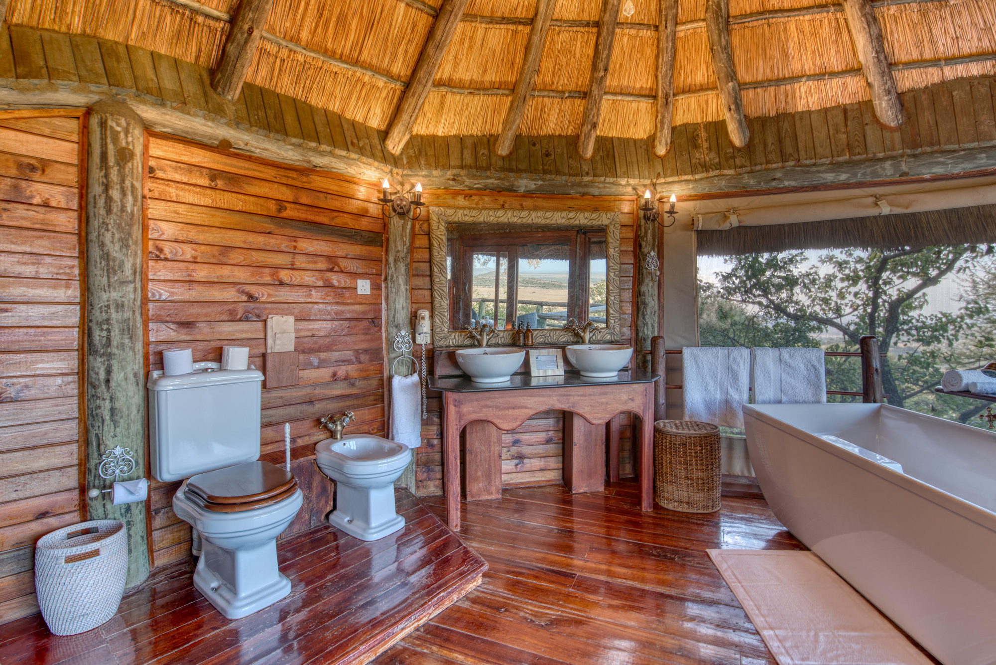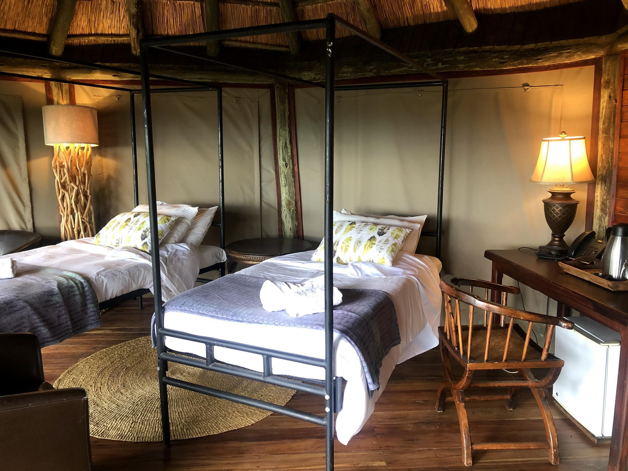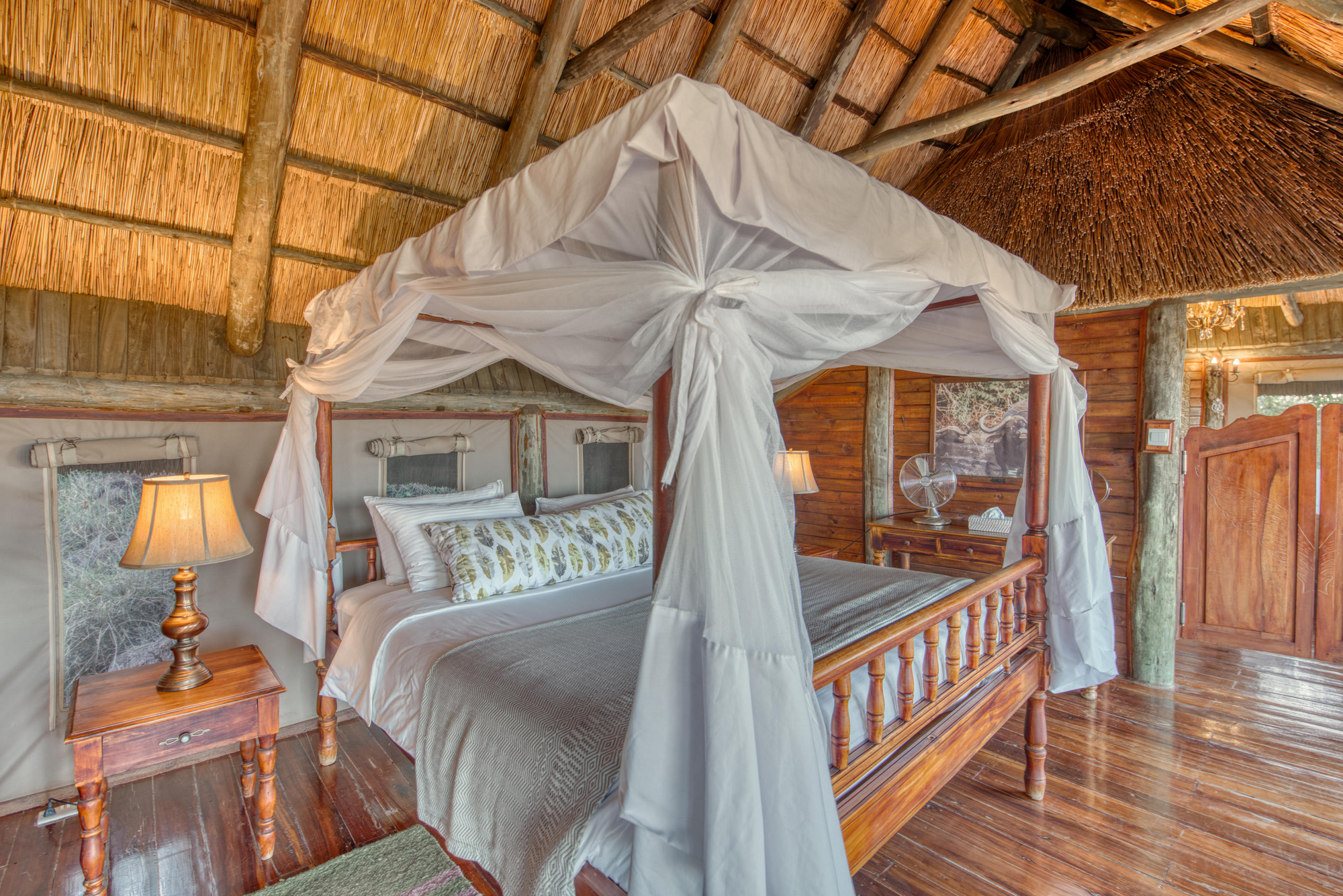 12 Doppelzimmern, 5 Zimmer mit 2 Einzelbetten, 3 Dreibettzimmern, 3 Familienzimmern für 4 Personen und 2 Honeymoon Safari Rooms . Die meisten Zimmer stehen auf Holzplattformen am Hang mit privater Veranda, Moskitonetz, Außendusche und Bad mit WC, Waschbecken sowie fließend Warm- und Kaltwasser. Veranda mit Lounge-Stühlen und Fernblick. Standventilatoren.