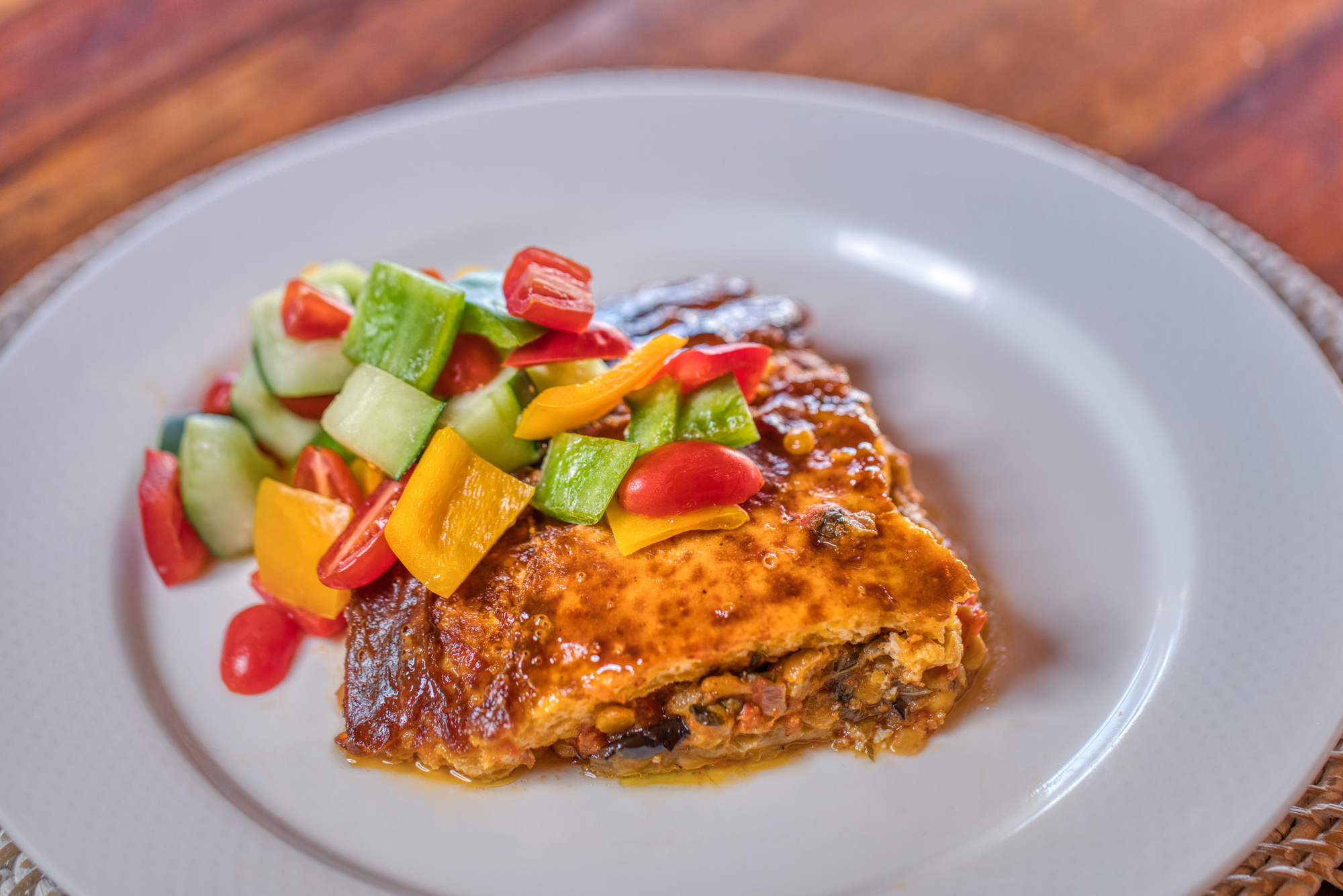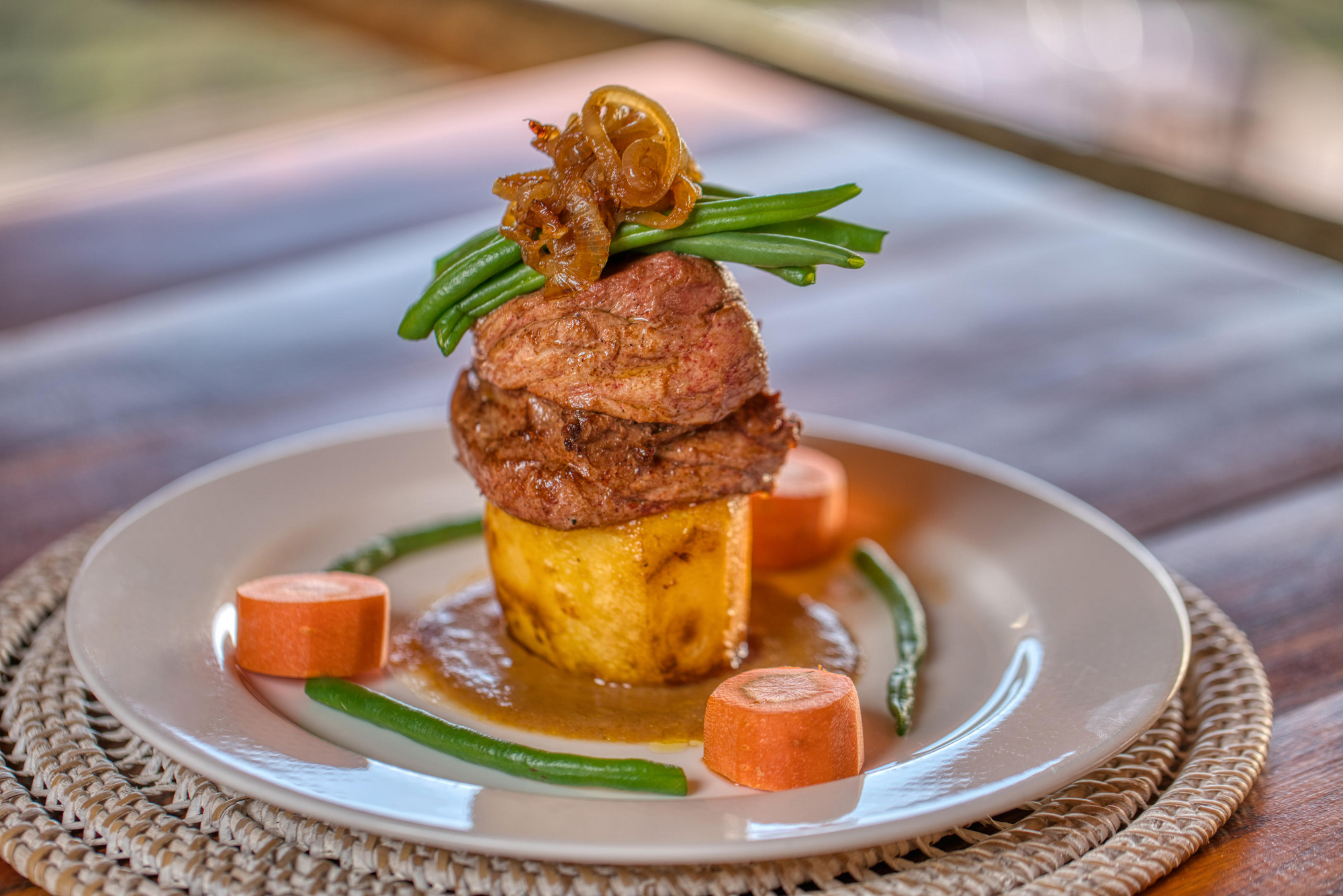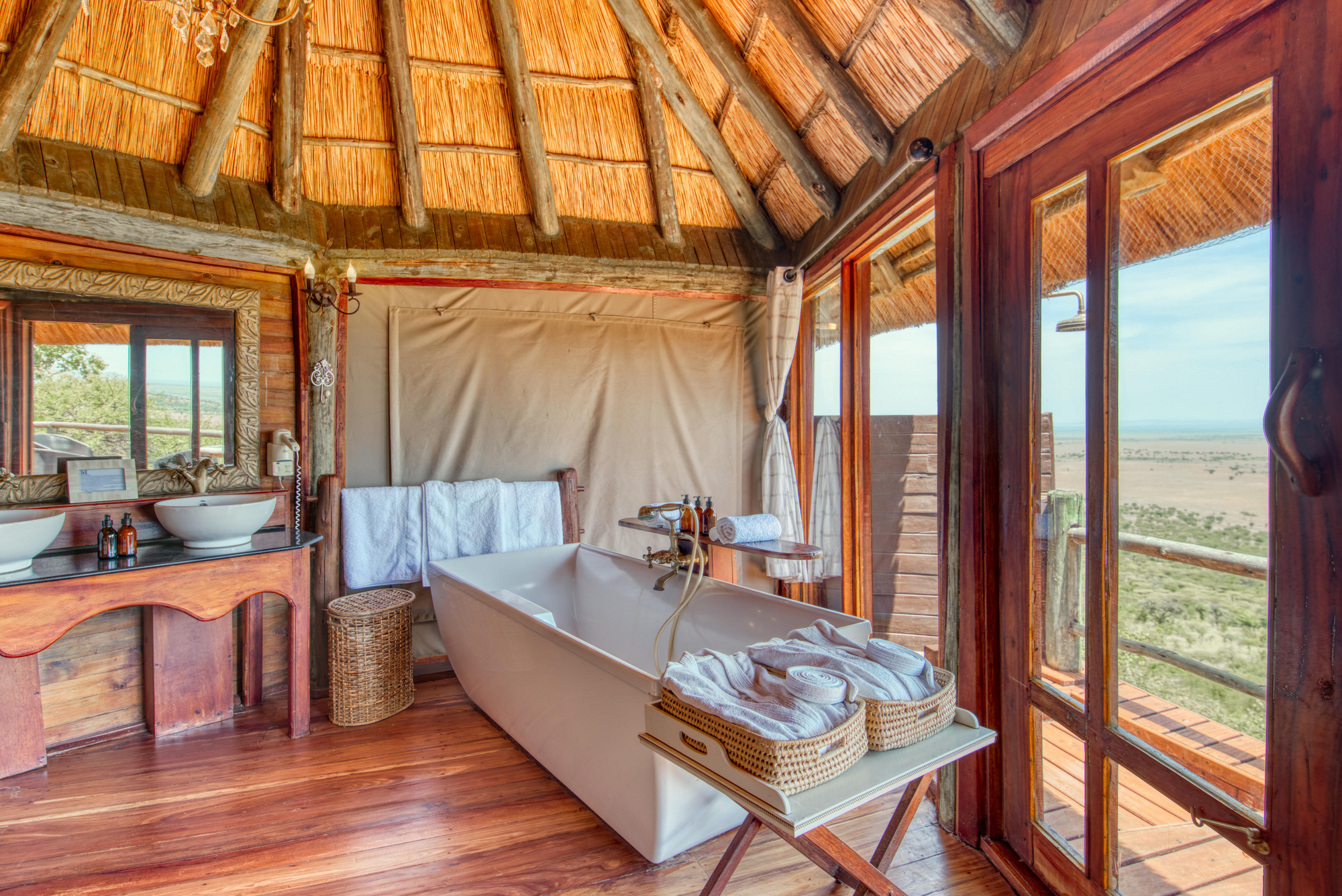 Das Hauptgebäude umfasst eine offene Lounge, Bar und Restaurant auf mehrstufigen Holzplattformen, durchsetzt mit lokalen Design-Elementen. Ein Infinity-Pool mit Blick über die Ebene, Feuerstelle am Hang und Souvenirshop sind vorhanden.