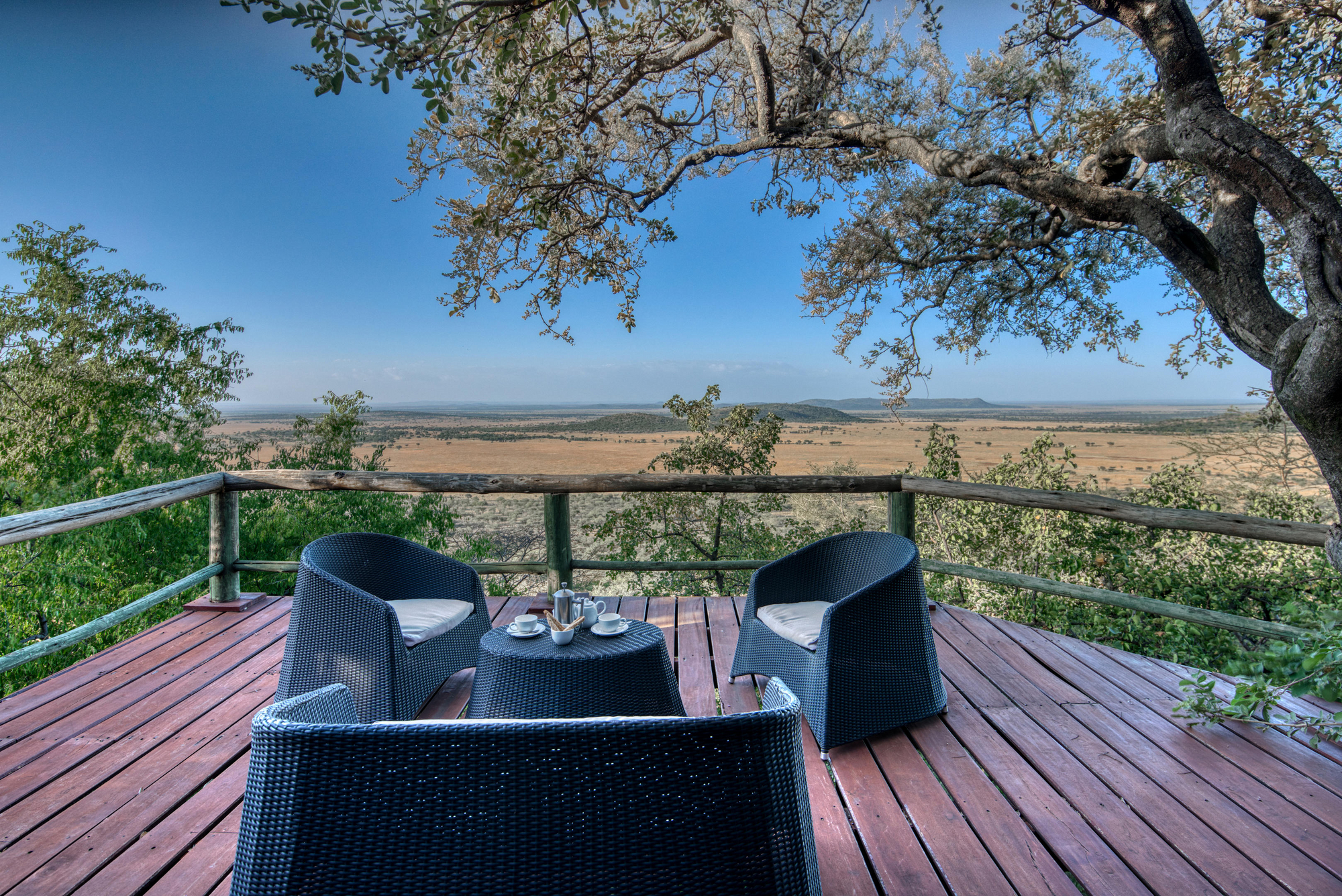 Ausblick auf die Migration und die reichhaltige Tierwelt – Gnus, Zebras, Elefanten, Löwen, Leoparden und weitere Antilopenarten sind häufig um die Ebene herum präsent.