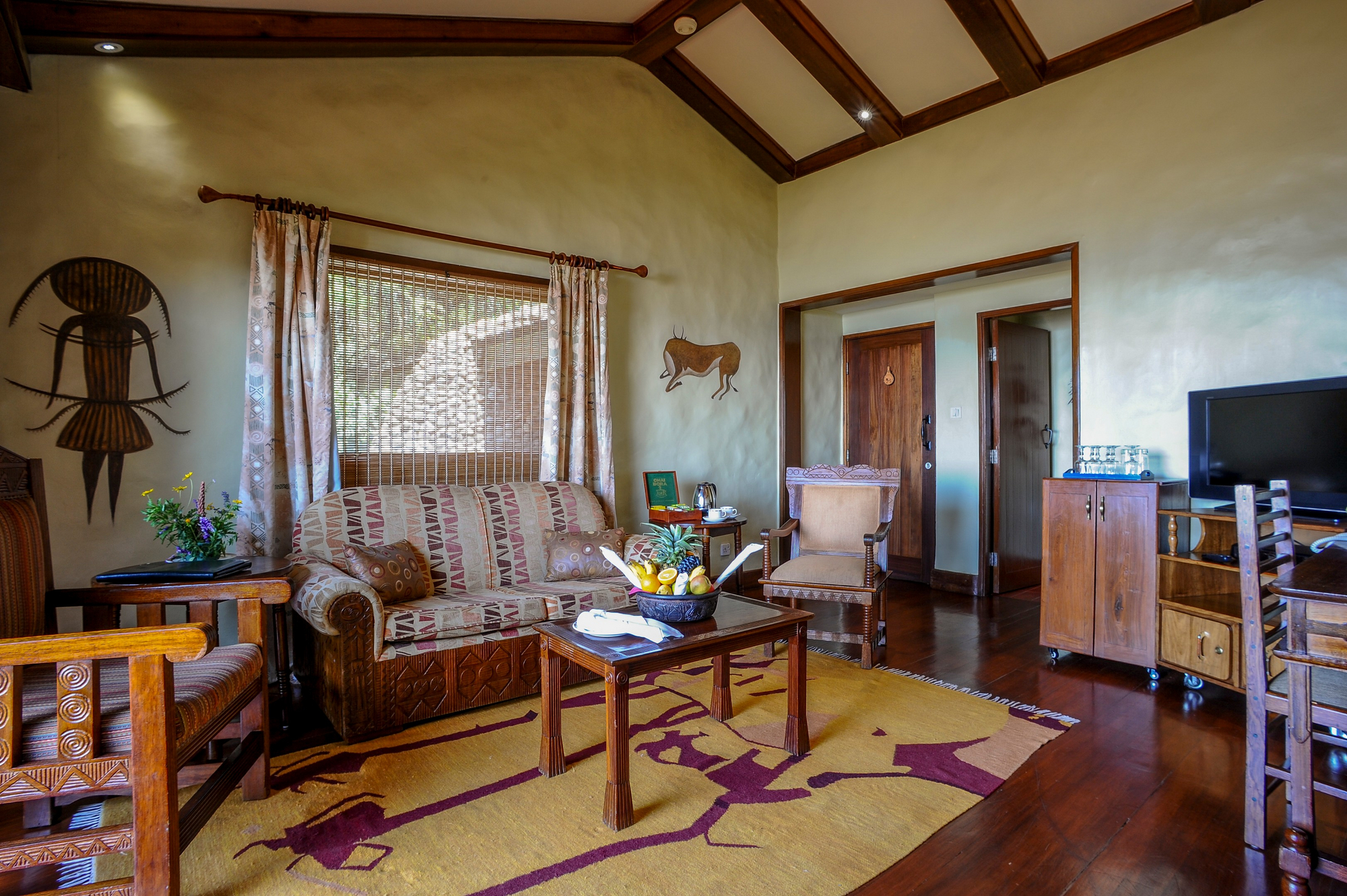 Gesicherte Lodgeanlage. Wildtiere bewegen sich außerhalb der Kernbereiche; klare Sicherheitsprotokolle für Gäste.