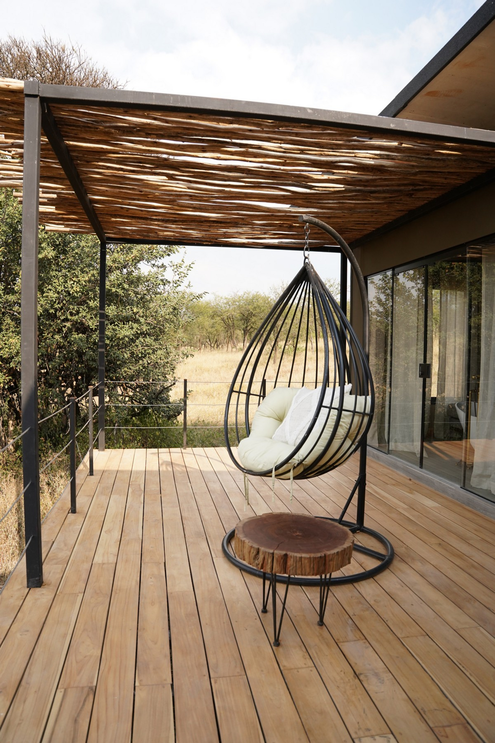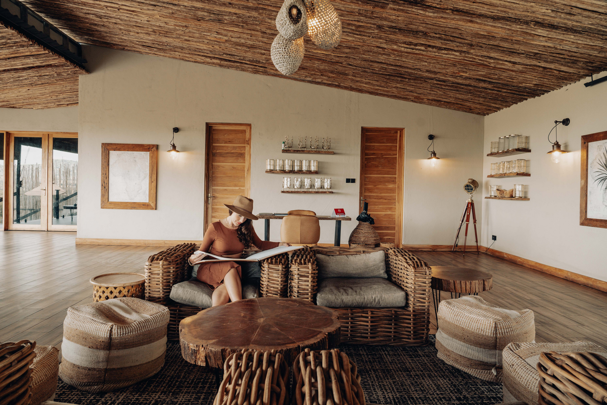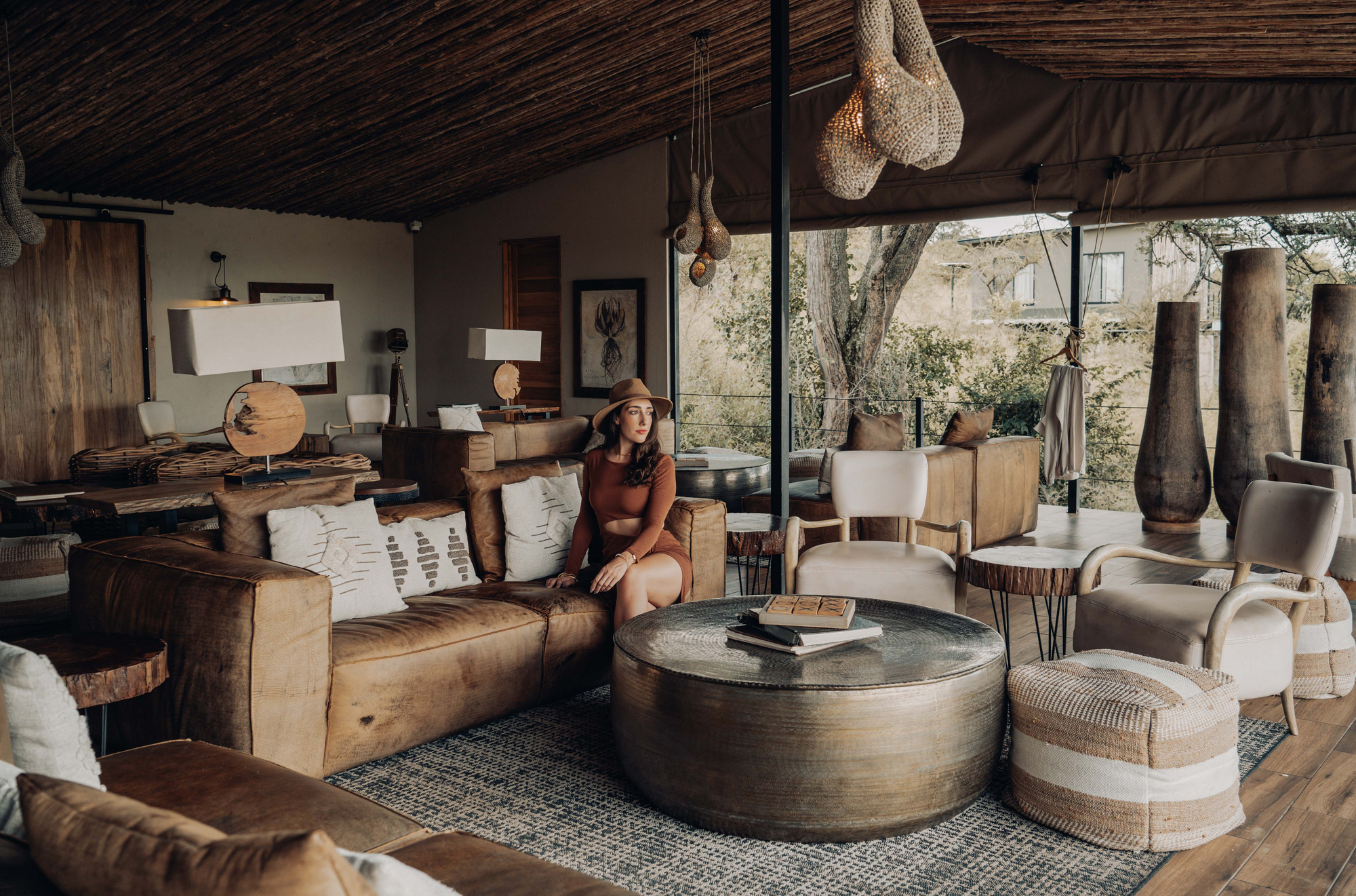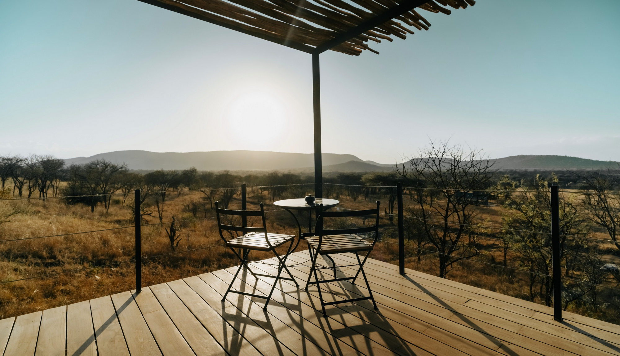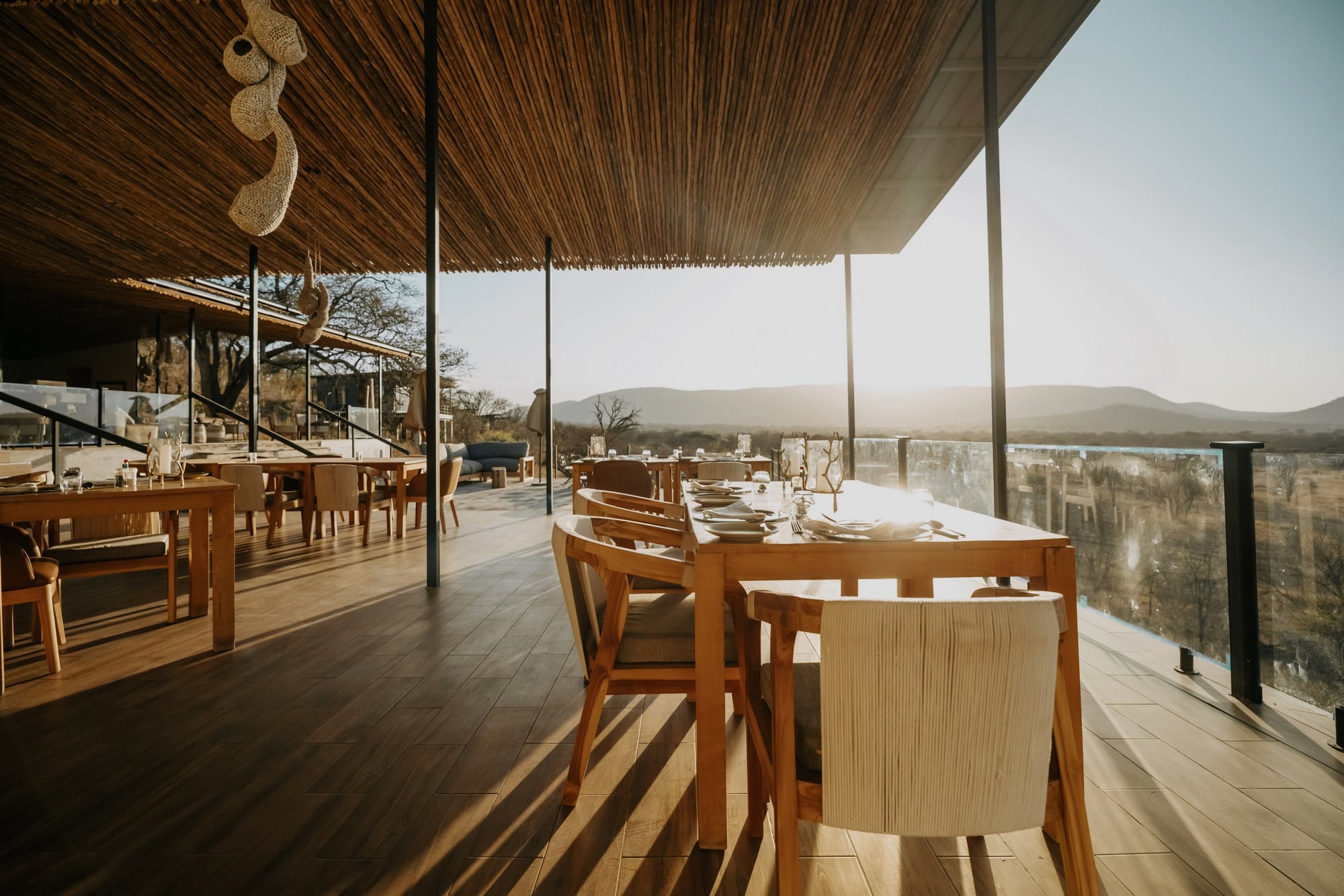 Zentrales Hauptzelt mit Lounge, Bar und Restaurantbereich, teilweise offen gestaltet mit Blick auf das Wasserloch. Großzügige Holzterrasse mit Feuerstelle. Kleiner Infinitypool mit Liegefläche zwischen den Felsen. Keine Bibliothek oder Shop, keine öffentlichen Toiletten. Die Anlage ist flach gebaut und gut strukturiert, mit natürlichen Materialien und stilvoller Ausstattung.