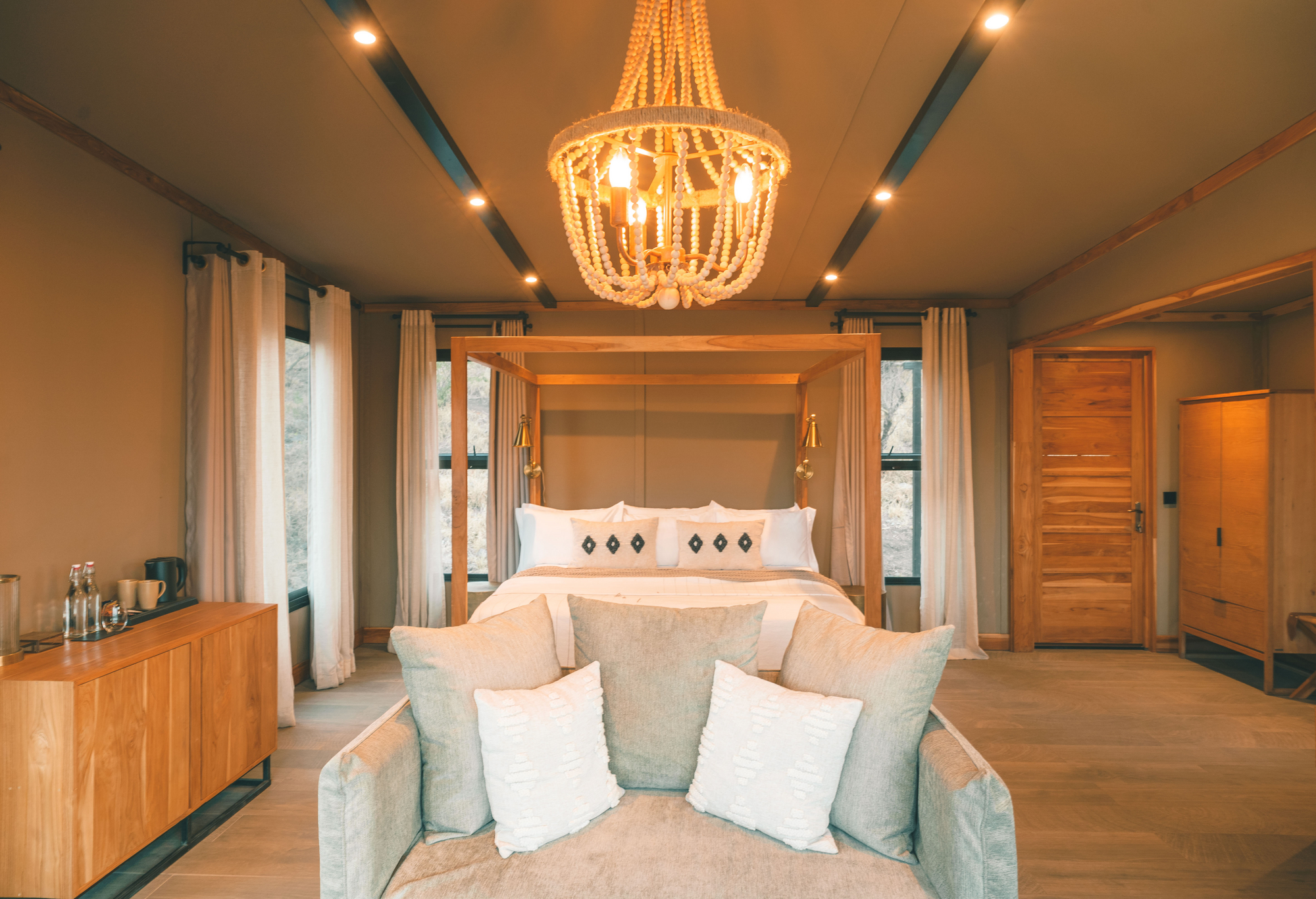 Zehn luxuriöse Zelte und zwei Familienzelte, alle mit Holzboden, Canvas-Wänden, festen Türen und großzügiger Veranda mit Sitzmöbeln. Innenausstattung mit Kingsize-Bett oder Twin, Schreibtisch, Loungeecke, Gepäckablage, Safe, Ventilator und Steckdosen mit Solarstrom. En-suite Badezimmer mit Doppelwaschtisch, Spültoilette, Innen- und Außendusche, fließend Warm- und Kaltwasser. Fenster mit Moskitonetzen. Keine Klimaanlage. Alle Unterkünfte sind durch Sandpfade mit dem Hauptbereich verbunden.