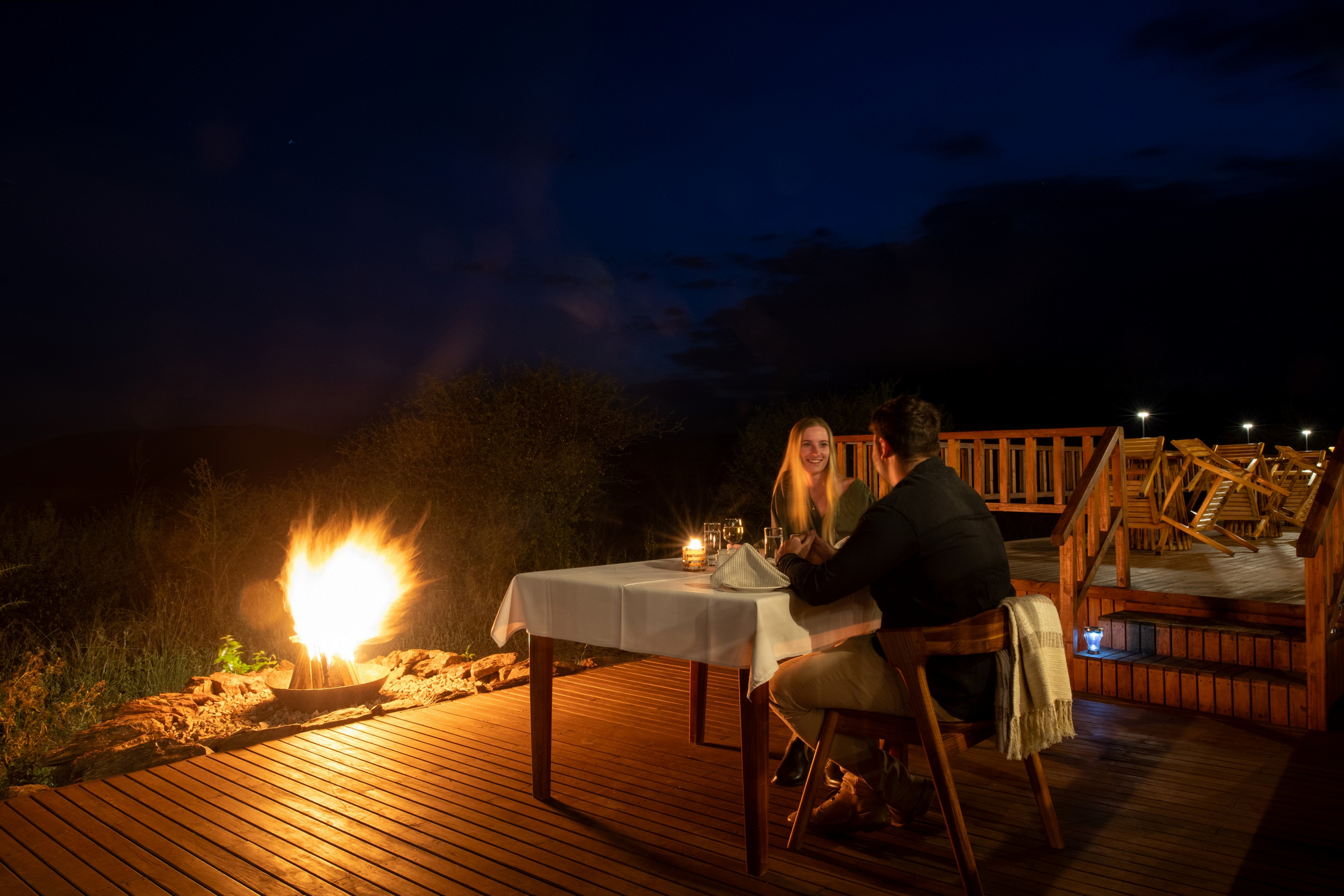 Das Nyikani Camp hat im Hauptbereich ein großes Speisezelt mit einem großen Esstisch. Im Loungezelt sind neben bequemen Sitzmöbeln und Tischen eine Bibliothek und eine Bar untergebracht. Die Inneneinrichtung besteht zum Großteil aus natürlichen Materialien. Der Speisebereich verfügt über separate Waschgelegenheiten. Zudem gibt es im Hauptbereich im Schatten liegende Terrassen, die die Beobachtung der umliegenden Landschaft mit ihren Wildtieren ermöglichen. Bei passendem Wetter wird abends an der Boma, der Feuerstelle, ein Lagerfeuer entzündet. Es ist eine Ladestation mit einem Universaladapter vorhanden.