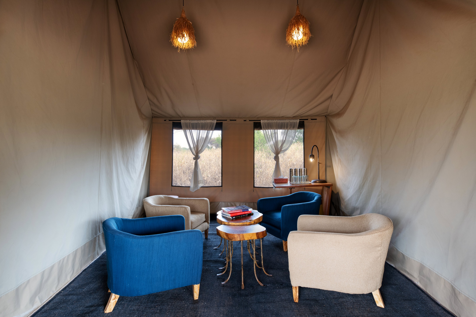 Zentraler Ess- und Aufenthaltsbereich unter Canvas mit Lounge-Sitzgelegenheiten und gemeinsamer Feuerstelle. Die Gestaltung ist funktional und safari-klassisch, mit Naturmaterialien, gedeckten Farben und offener Struktur. Kein Pool, kein Spa, keine festen Gebäude. Strom steht zeitweise über Generator oder Solarsysteme zur Verfügung.