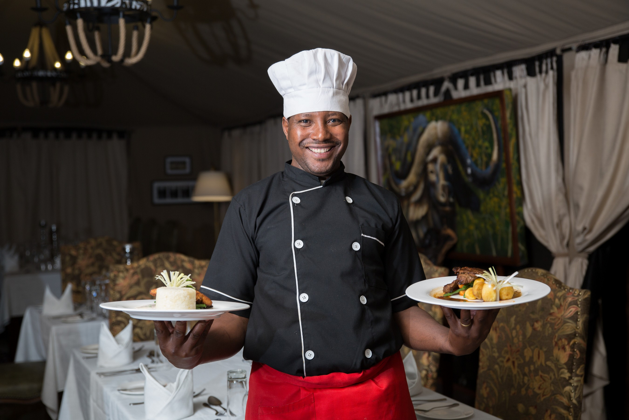 Vollpension mit Frühstück, Mittagessen und Abendessen inklusive – je nachdem gebuchtes Paket. Mahlzeiten werden im zentralen Speisebereich oder auf Wunsch auf der Terrasse serviert. Getränke sind je nach Arrangement enthalten. Besonderheiten wie Bush-Breakfast, Lagerfeuer-Dinner („Boma Dinner“) und Private Dining auf der Veranda sind möglich.