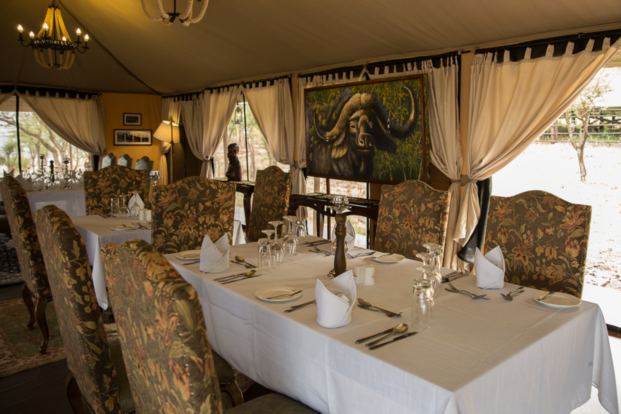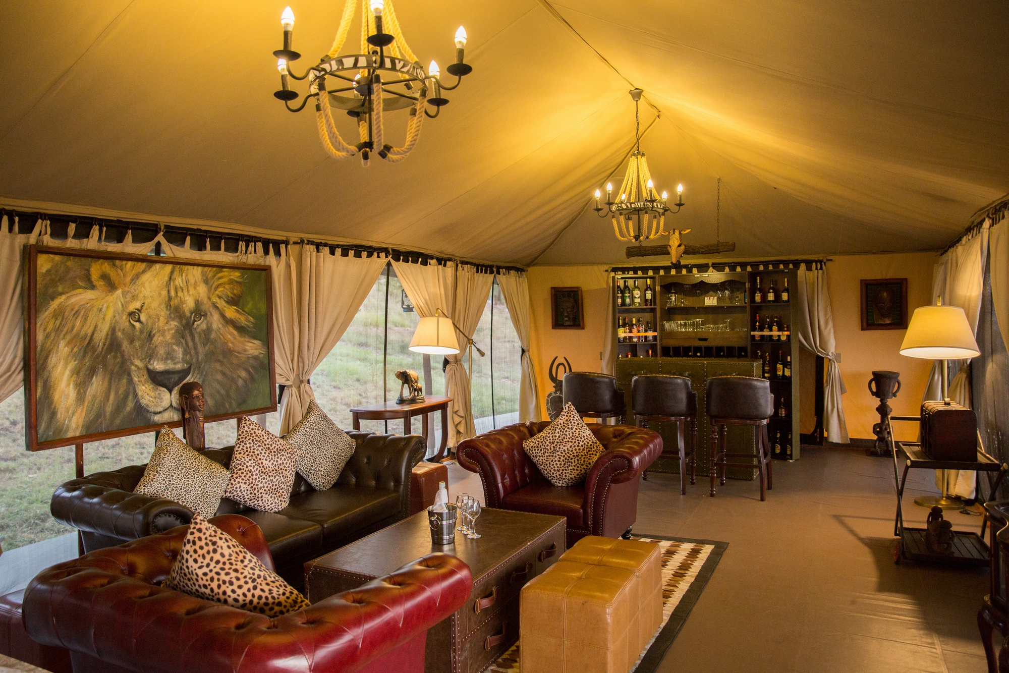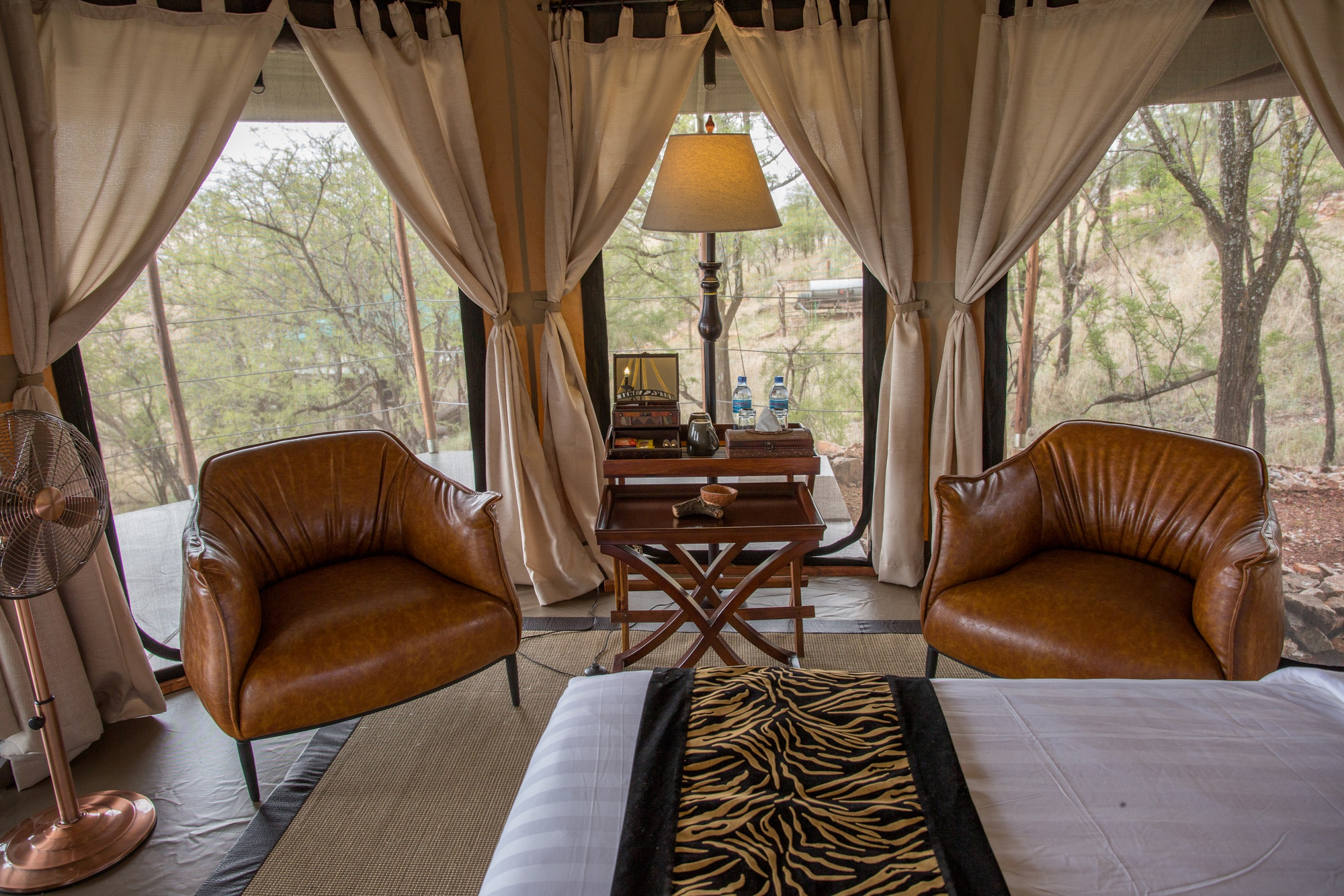Alle Gästezelte verfügen über ein Aussichtsdeck, Badezimmer und Ventilator. Die neun Zelte sind sehr großzügig und auf Holzplattformen errichtet, mit festem Zeltdach und Canvas-Seitenteilen, die sich öffnen lassen. Sie verfügen über Doppel- oder Zweibett-Konfiguration, Sitzmöbel im Innenraum, Safe, Tee/Kaffee-Station, private Terrasse mit Blick über die Savanne. Das Bad ist en-suite mit Dusche, WC und Waschbecken. Der Zugang erfolgt über kurze Naturpfade vom zentralen Bereich.