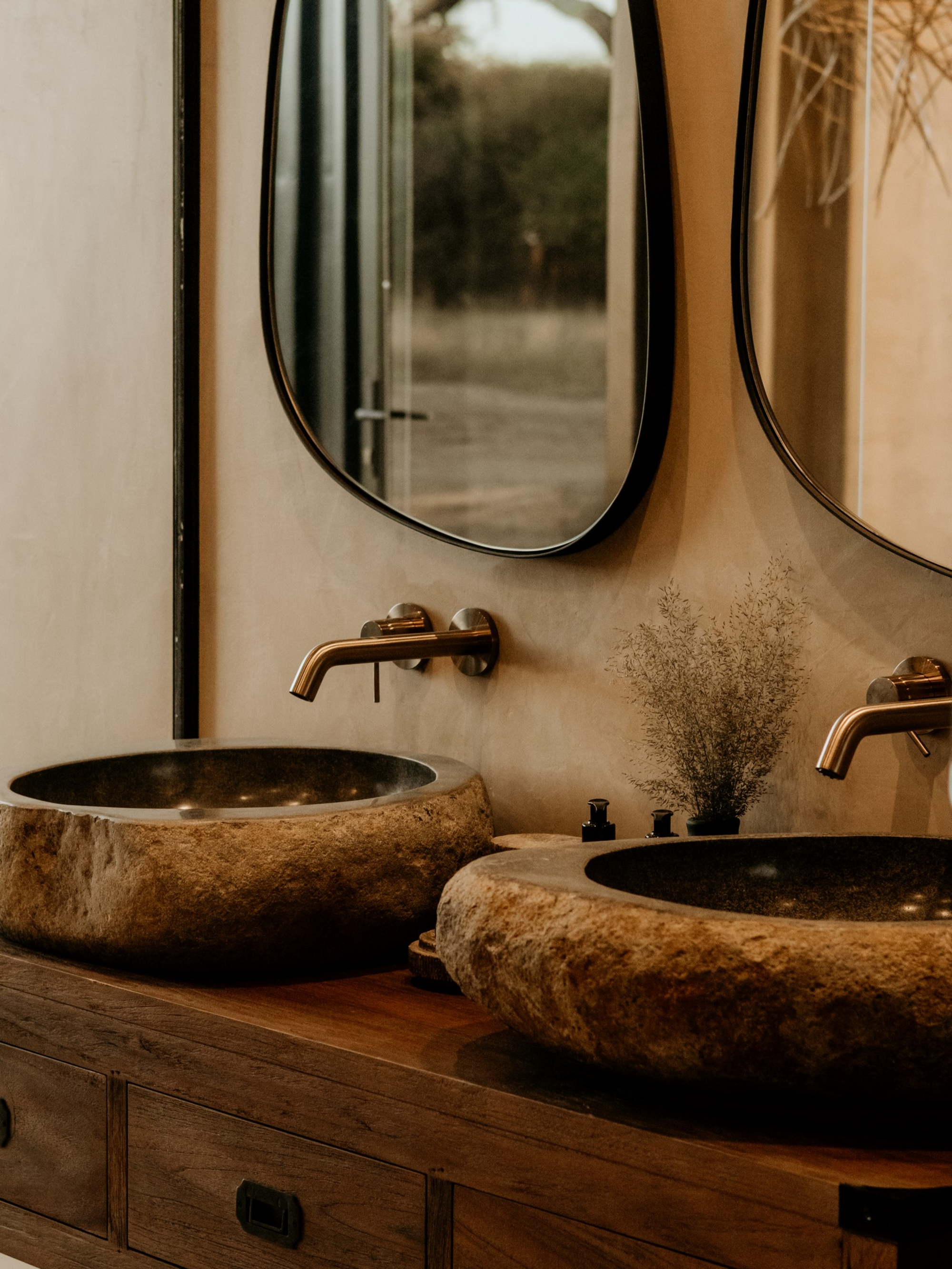 Die Villa verfügt über vier Schlafzimmer mit jeweils eigenem Bad. Drei Zimmer sind mit Doppelbetten ausgestattet, eines mit einem zusätzlichen Schlafbereich im Loft. Die Räume verfügen über Dusche, Waschbecken, WC sowie fließend Warm- und Kaltwasser. Die Einrichtung folgt einem naturinspirierten Stil mit hellen Farben, klaren Linien und hochwertigen Materialien. Ventilatoren, WLAN, Bettwäsche, Handtücher und Pflegeprodukte sind vorhanden. Klimaanlage und Moskitonetze sind nicht vorgesehen. Die Räume bieten direkten Zugang zur Terrasse oder zum Gartenbereich.