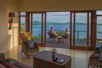 Am Hang gelegene Lodge mit einem großzügigen Deck und Blick auf den See. Die Architektur zeichnet sich durch geschwungene Strukturen aus. Die Einrichtungen umfassen eine Lounge, eine Bar, einen Speisebereich sowie einen beeindruckenden Infinity Pool mit Liegestühlen. Zusätzlich gibt es eine separate Lounge mit Bar am Strand, der über Fußwege und Treppen erreichbar ist.