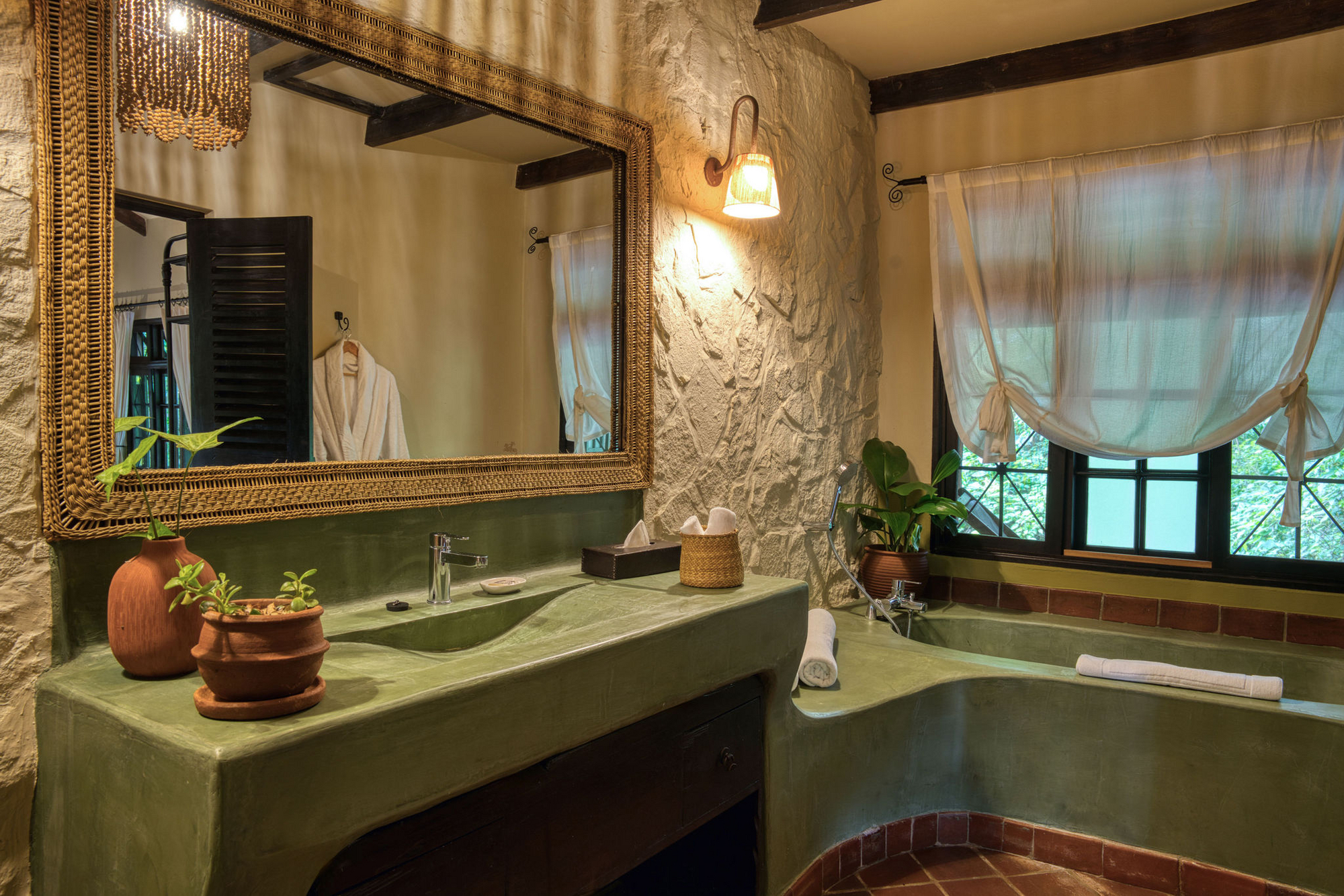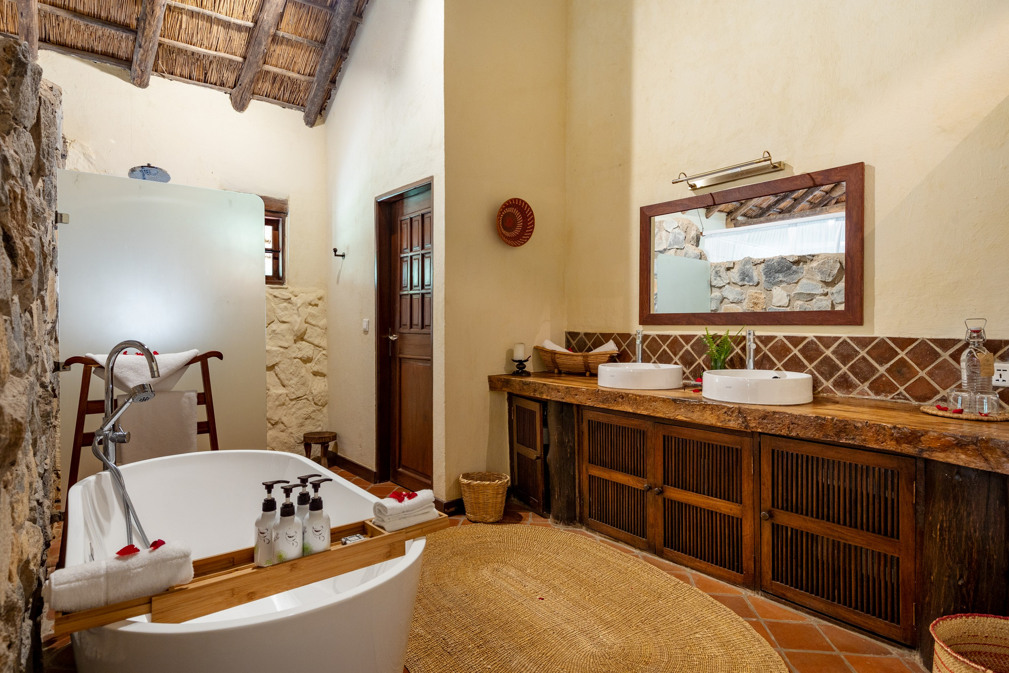 Das Rivertrees Country Inn hat Platz für bis zu 24 Gäste, die in einem River House, Gartenzimmern oder River Cottages übernachten können. Drei der Gartenzimmer sind im Farmhaus integriert. Die anderen Gartenzimmer befinden sich in der Nähe des Hauptbereichs. Die Unterkünfte haben alle ein oder zwei Schlafzimmer, Moskitonetze über den Betten, Grasmatten auf den Fußböden, einen Schrank, ein Tagesbett, einen Schreibtisch mit Stuhl und ein Bad mit Außendusche, WC. Und Badewanne. Eine kleine Veranda lädt mit einem Tisch und zwei Stühlen zum Verweilen ein. Die großzügigen River Cottages haben zudem jeweils eine eigene Feuerstelle und wurden in der Nähe des Flusses errichtet. Sie sind für Rollstuhlfahrer geeignet und verfügen über größere Bäder als die Gartenzimmer. Das River House am Fluss ist mit zwei großzügigen Schlafzimmern und einer privaten Veranda ausgestattet. Ein gemeinsames Wohnzimmer mit Satelliten-TV und eine private Küche verbinden die Schlafzimmer miteinander. Im River House sind Kinder nicht gestattet. Deswegen eignet es sich besonders gut für befreundete Pärchen. Pflegeprodukte und Bademäntel liegen in allen Bädern für die Gäste bereit.
