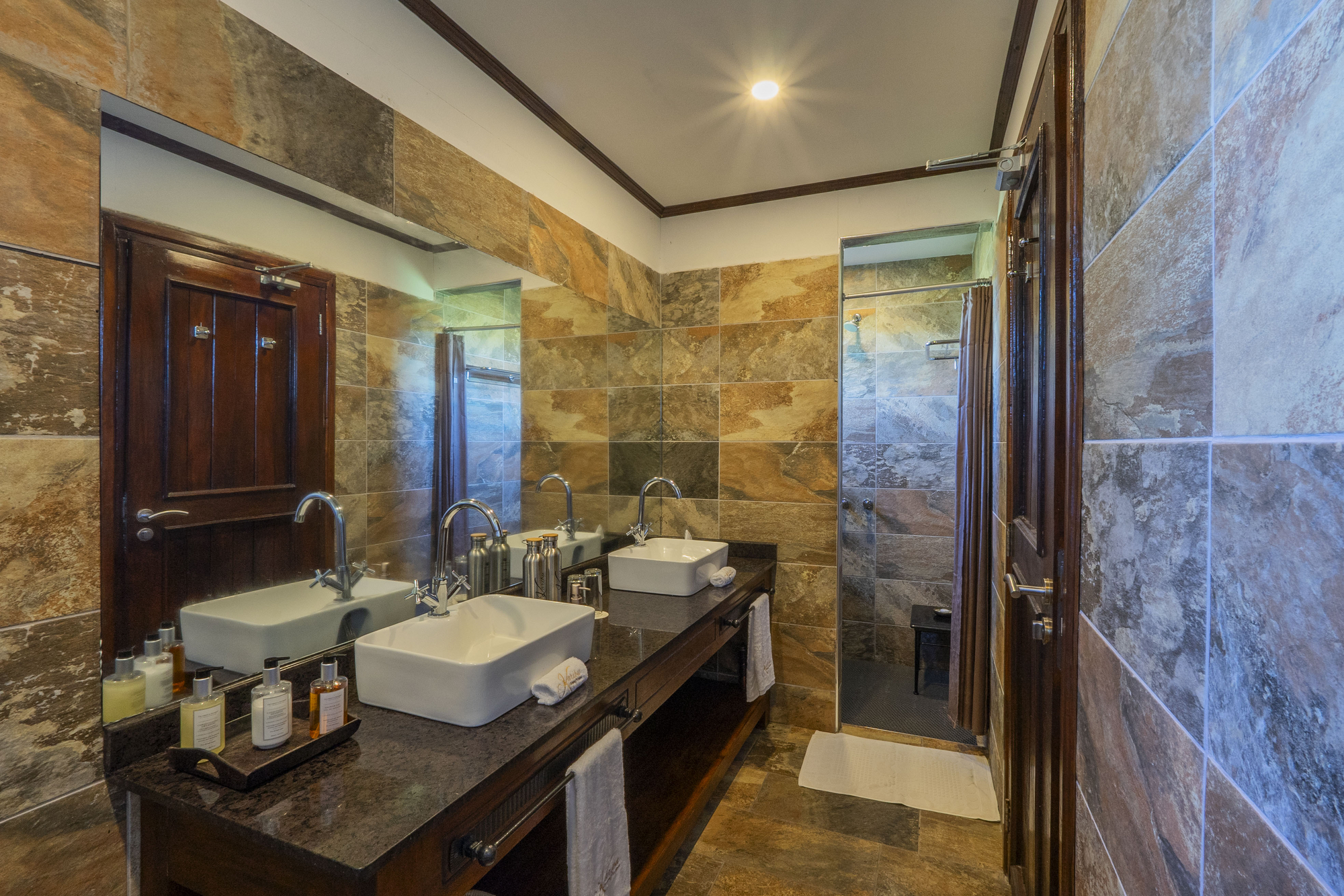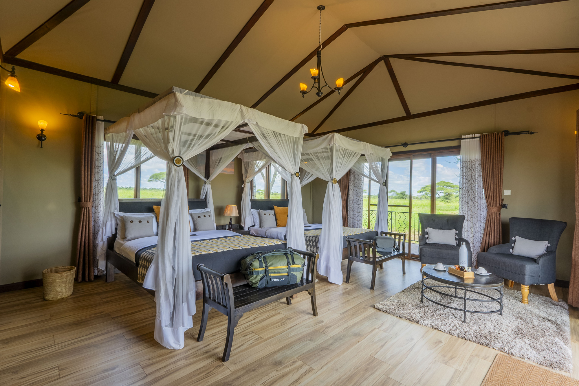 Zehn großzügige Zeltunterkünfte auf Plattformen mit Doppel- oder Twin-Betten, Sitzbereich, Schreibtisch, Gepäckablage und privater Veranda. Moskitonetze, Solarlicht, Steckdosen mit zeitweiser Stromverfügbarkeit. Badbereich im Zelt mit Spültoilette, Waschbecken, Dusche mit Warm- und Kaltwasser aus Solarspeicher. Zwei Zelte sind als Honeymoon- oder Familienzelte ausgelegt. Zelte aus Leinwand und Holz, geschlossen mit Reißverschluss, Fenster mit Moskitogittern. Keine Klimaanlage, aber Ventilator. Verbindung zum Hauptzelt über Sandpfade.