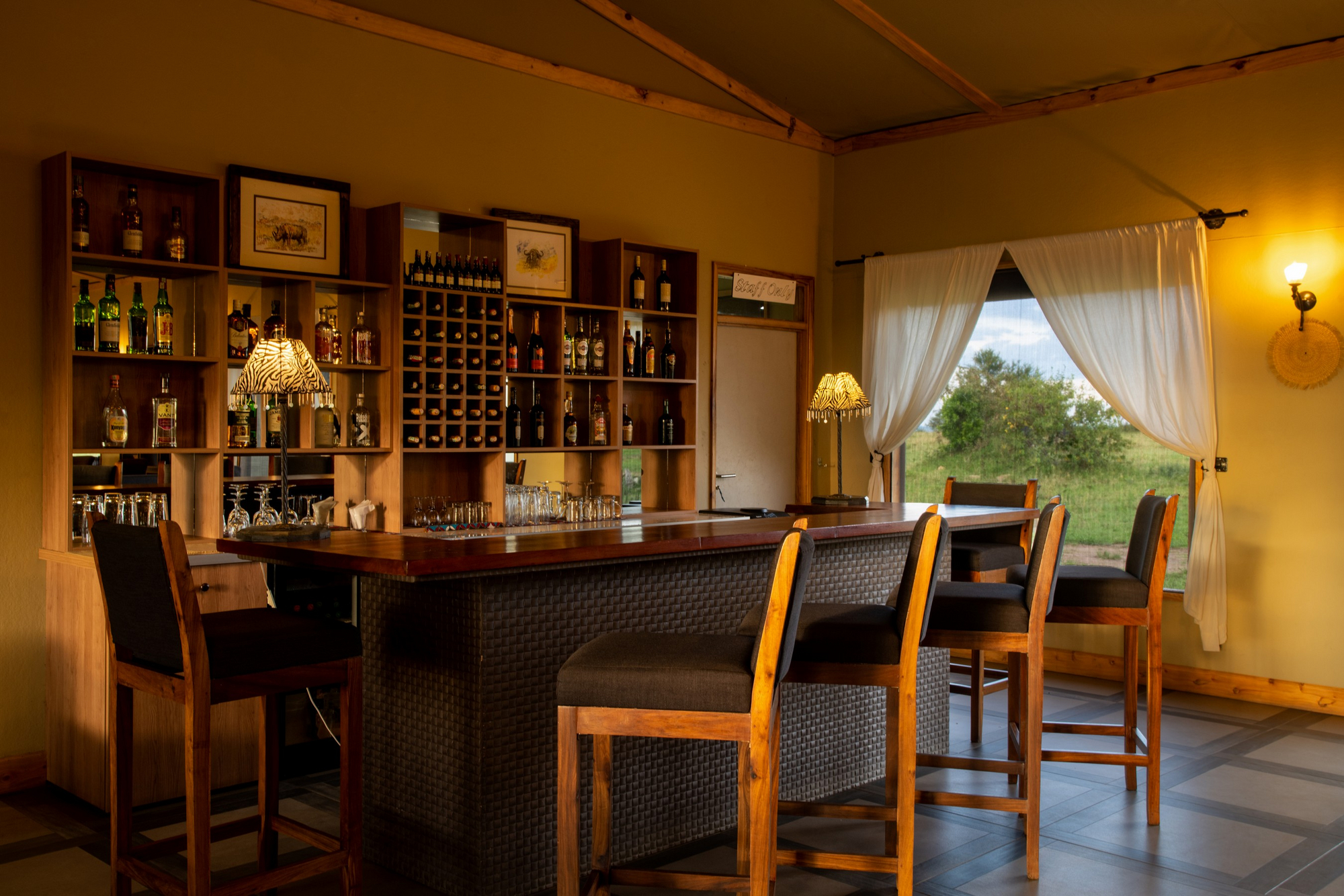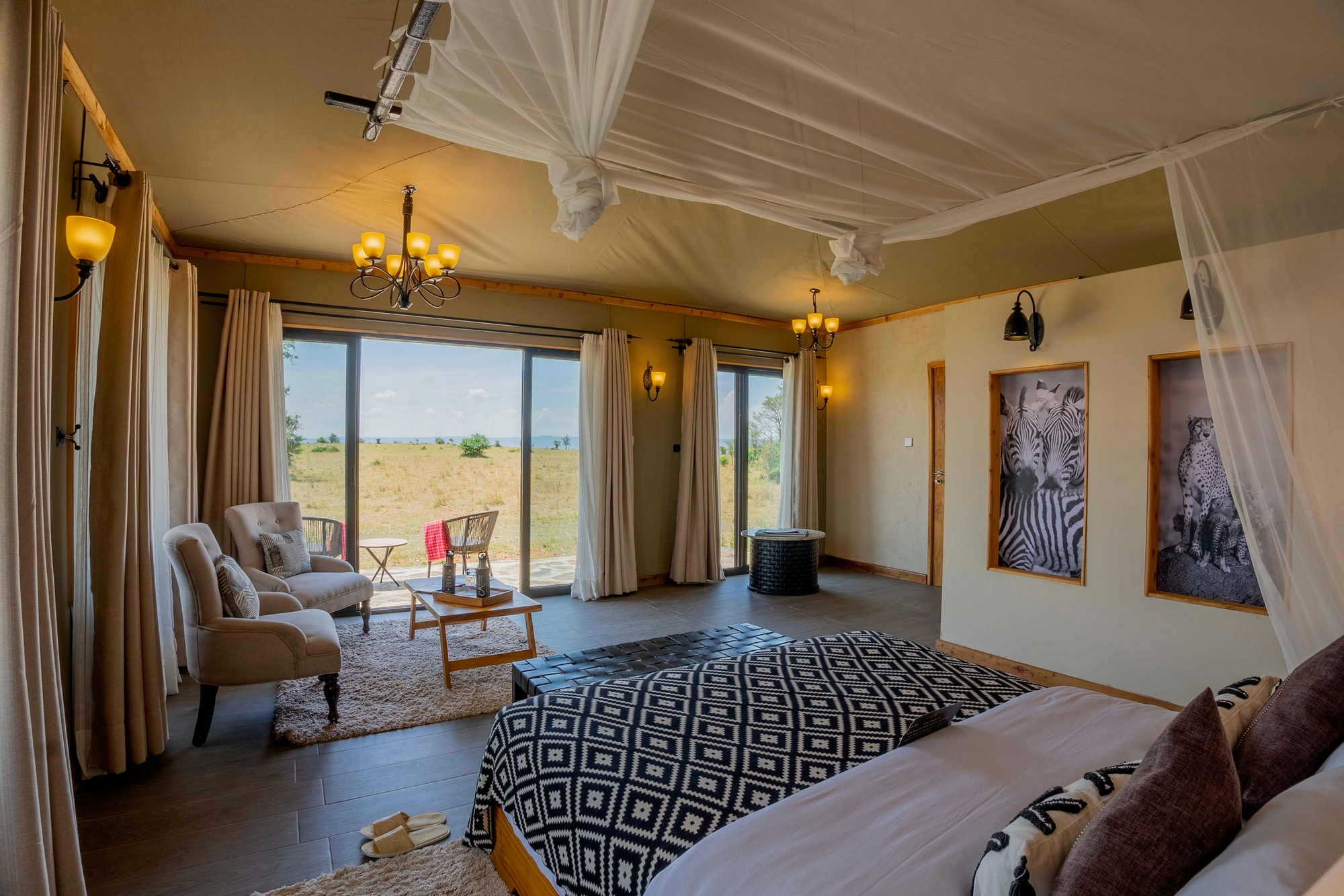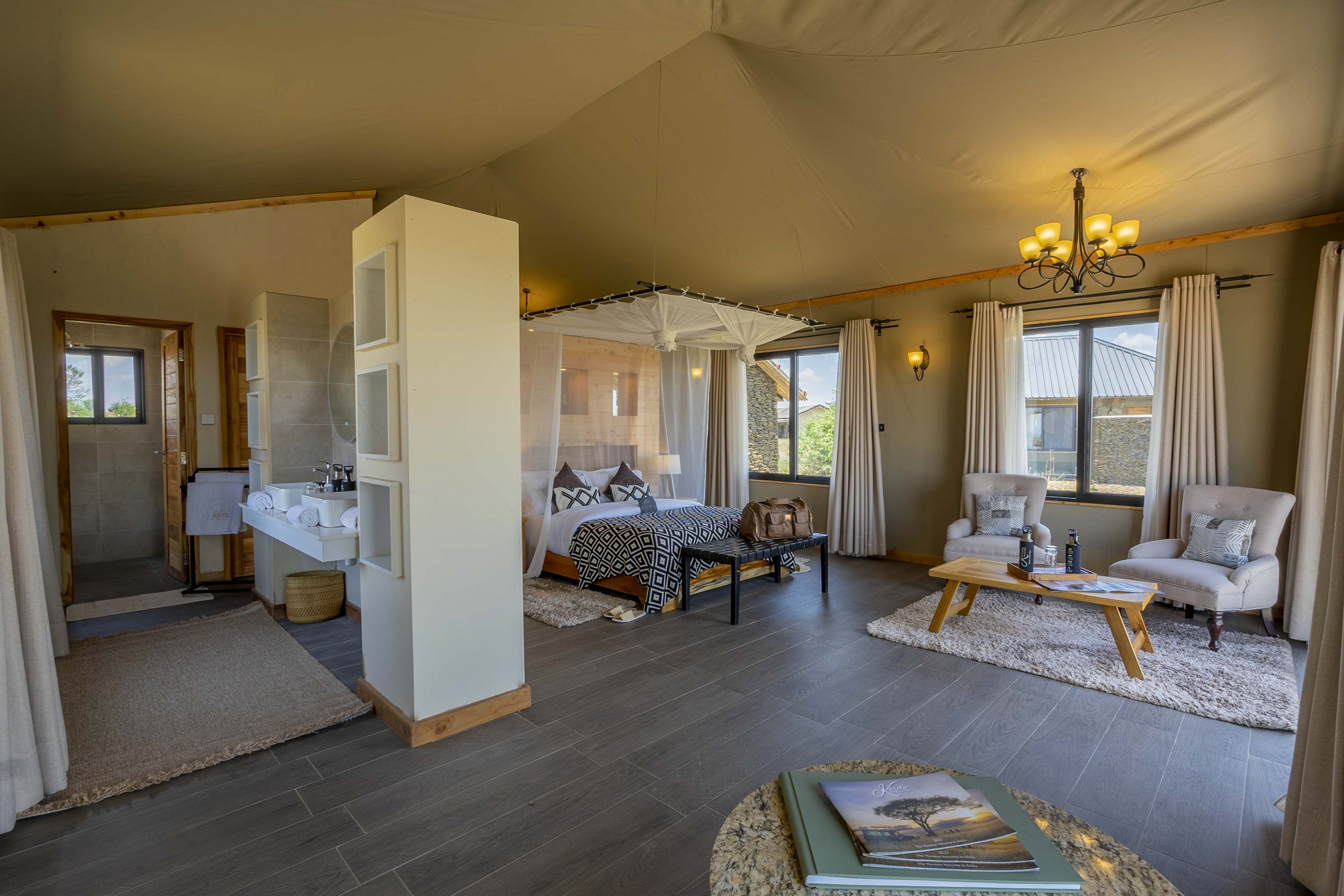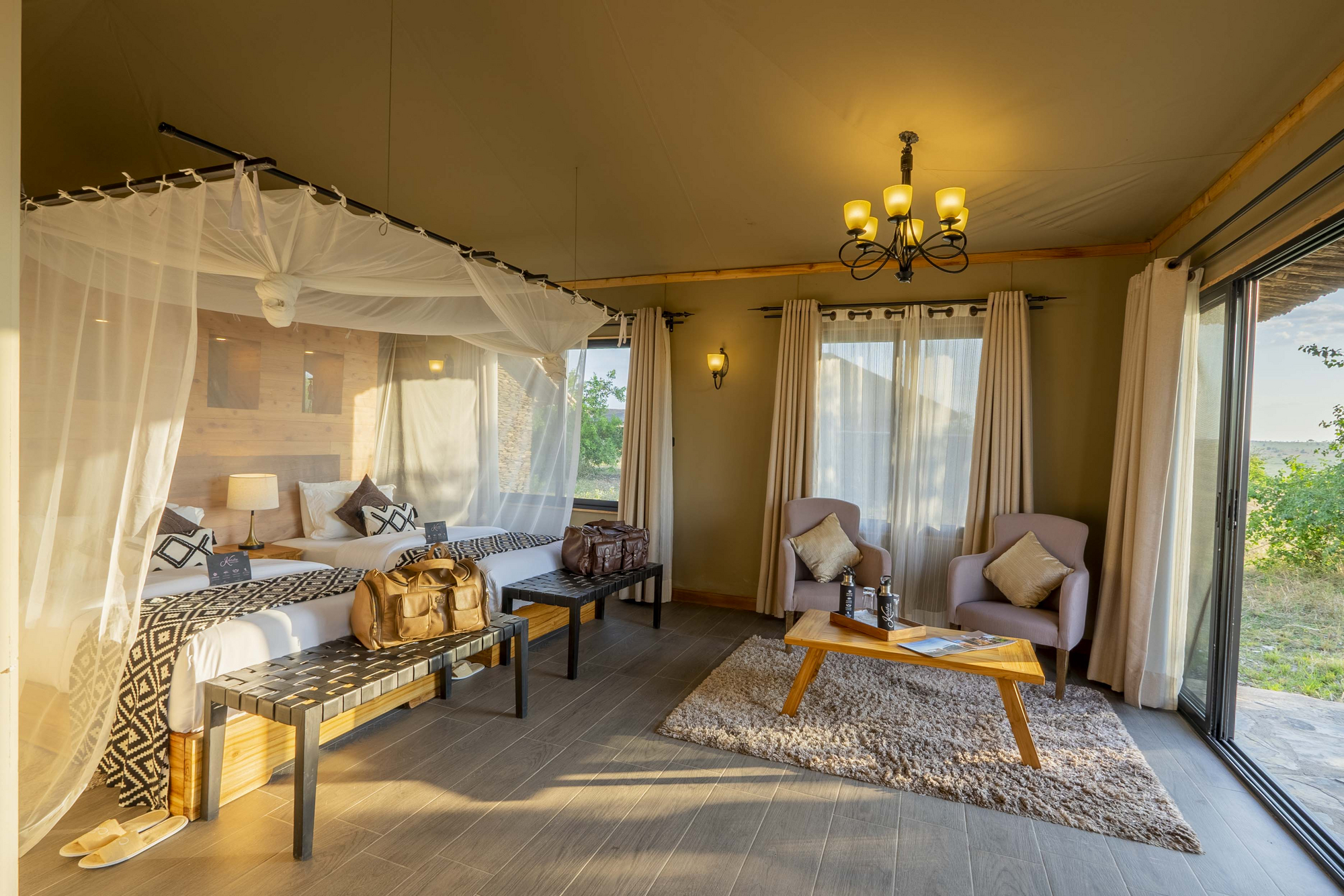 Die zehn Zeltsuiten sind jeweils mit Doppelbett oder zwei Einzelbetten ausgestattet. Jedes Zelt steht auf einer Steinplattform, mit Aussichtsterrasse. Das Badezimmer verfügt über eine Dusche, WC und Waschbecken. Die Zelte haben Moskitonetze über den Betten und die Einrichtung ist in Holztönen gehalten. Die Dächer sind fest, nicht aus Zeltplanen allein. Die Verbindung zum zentralen Bereich geschieht über kurze, natürliche Pfade.