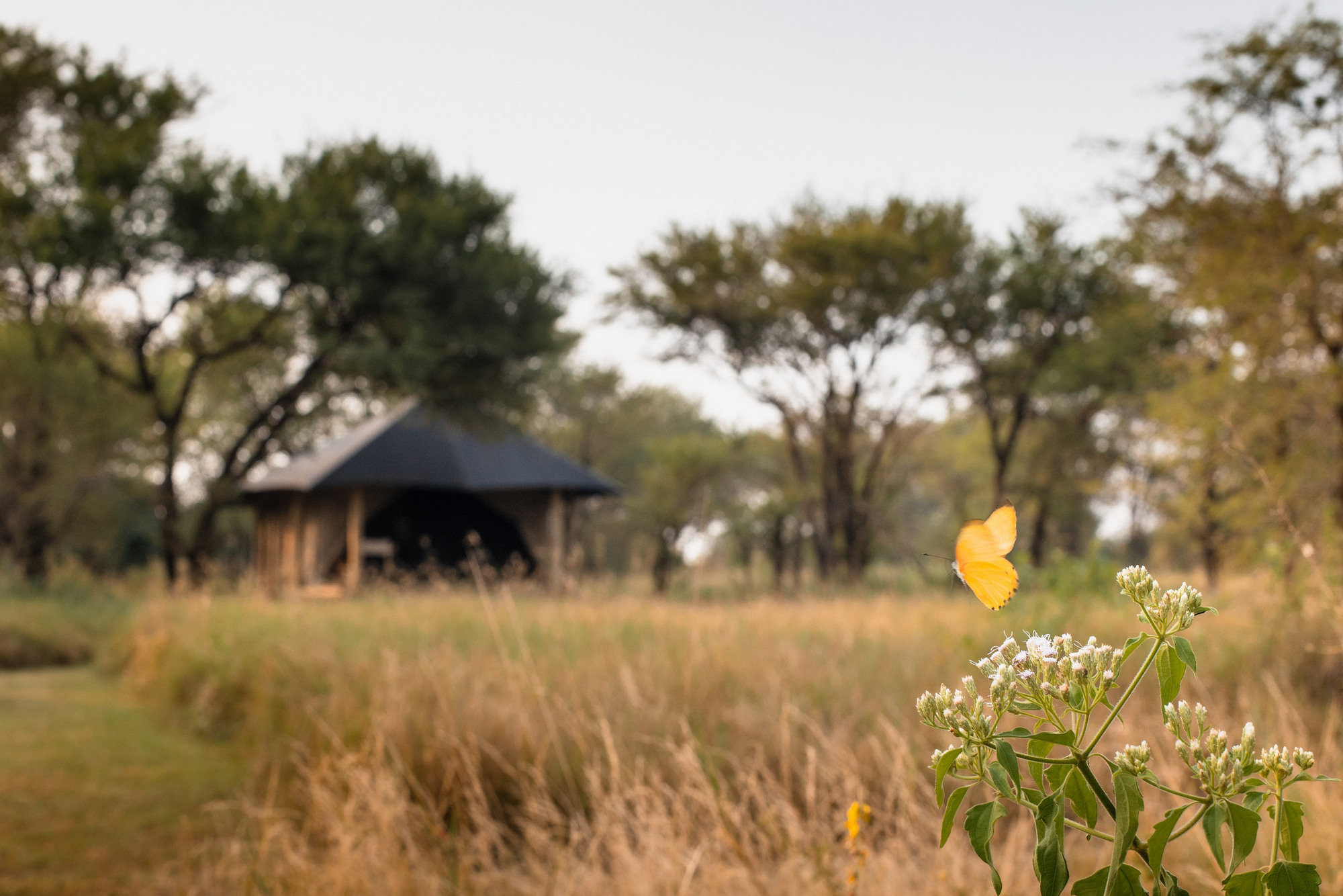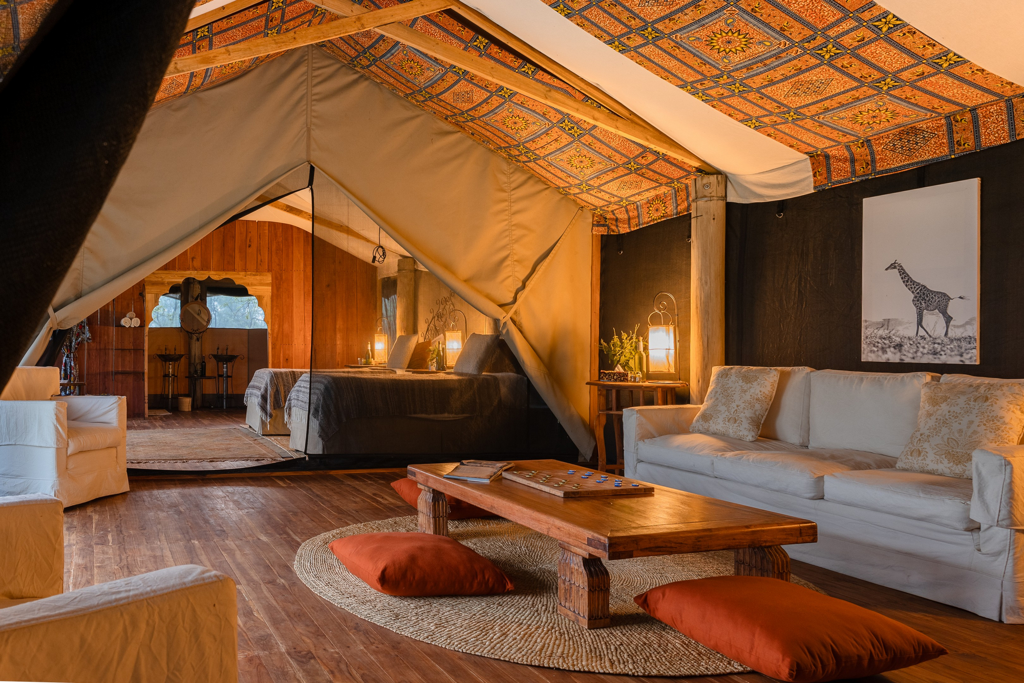 Großzügige Canvas-Zelte (4–6 Stück), einige Familien-Units. Jedes Zelt verfügt über Kingsize- oder Twin-Bett, Moskitonetz, Bucket-Shower, WC, private Veranda. Zugang ebenerdig oder über wenige Stufen. Stilvolle Deko ohne opulenten Luxus.