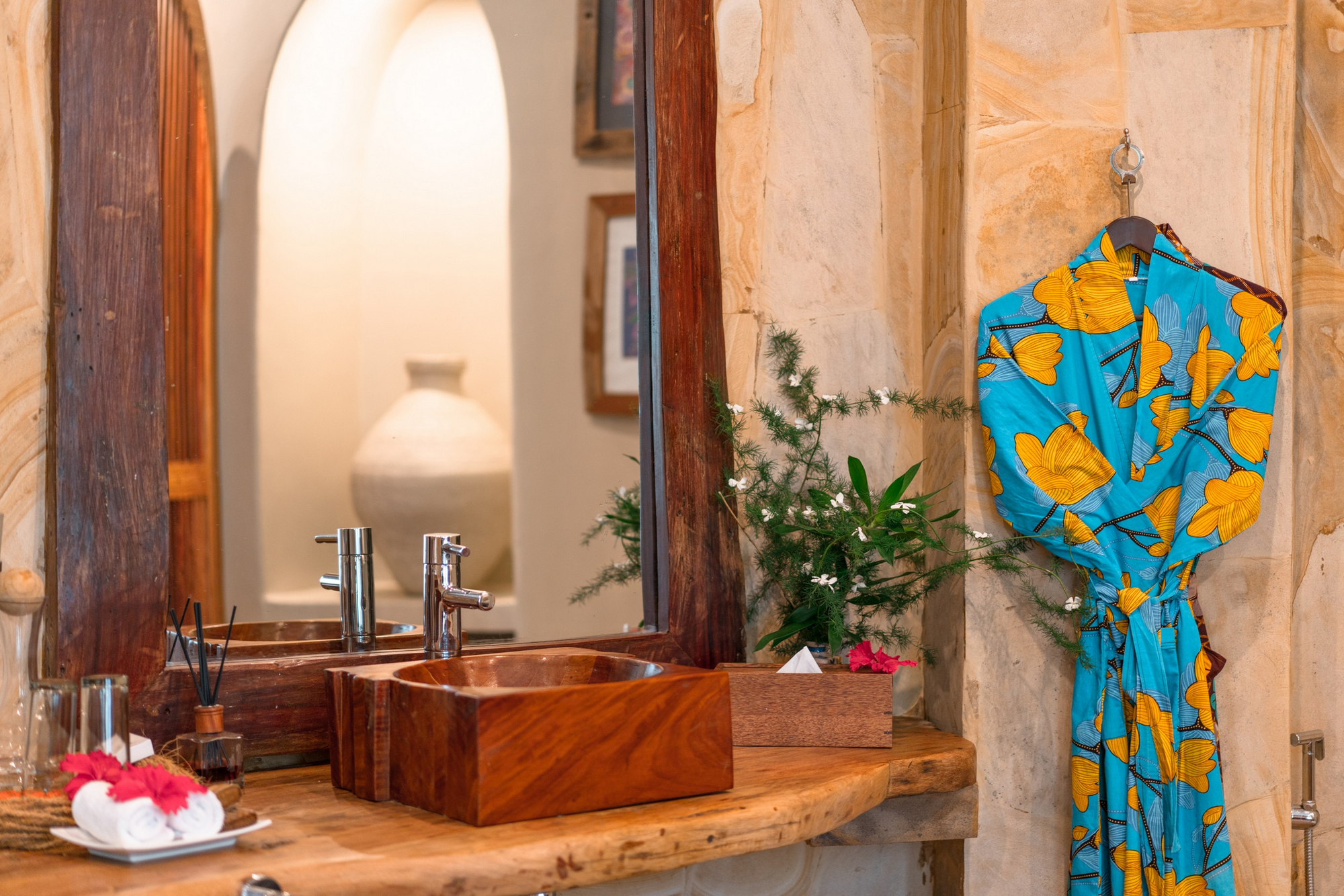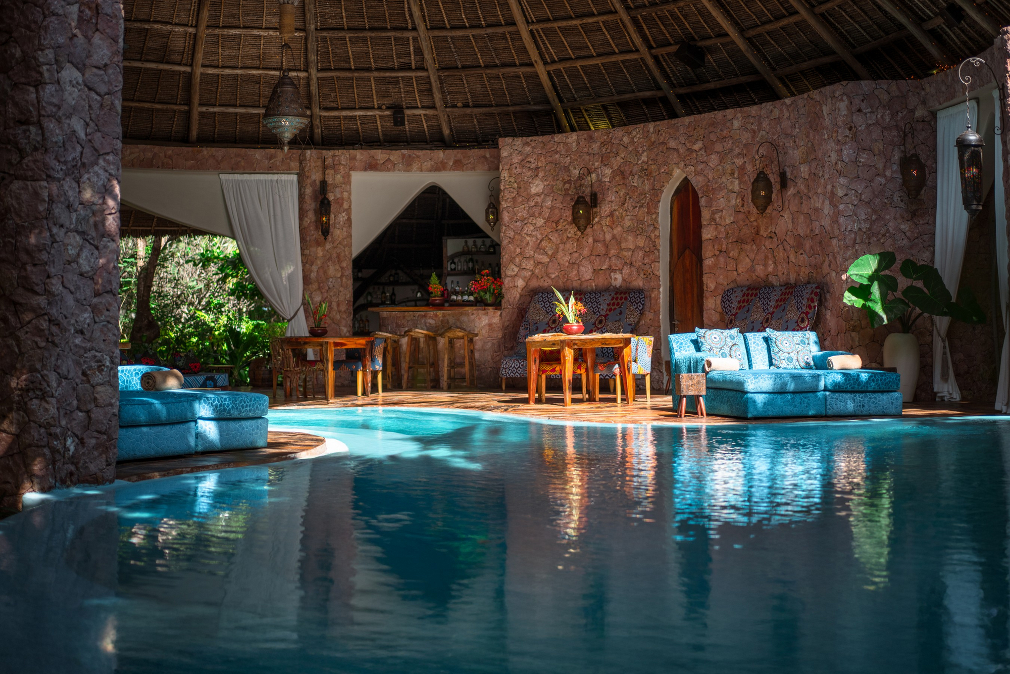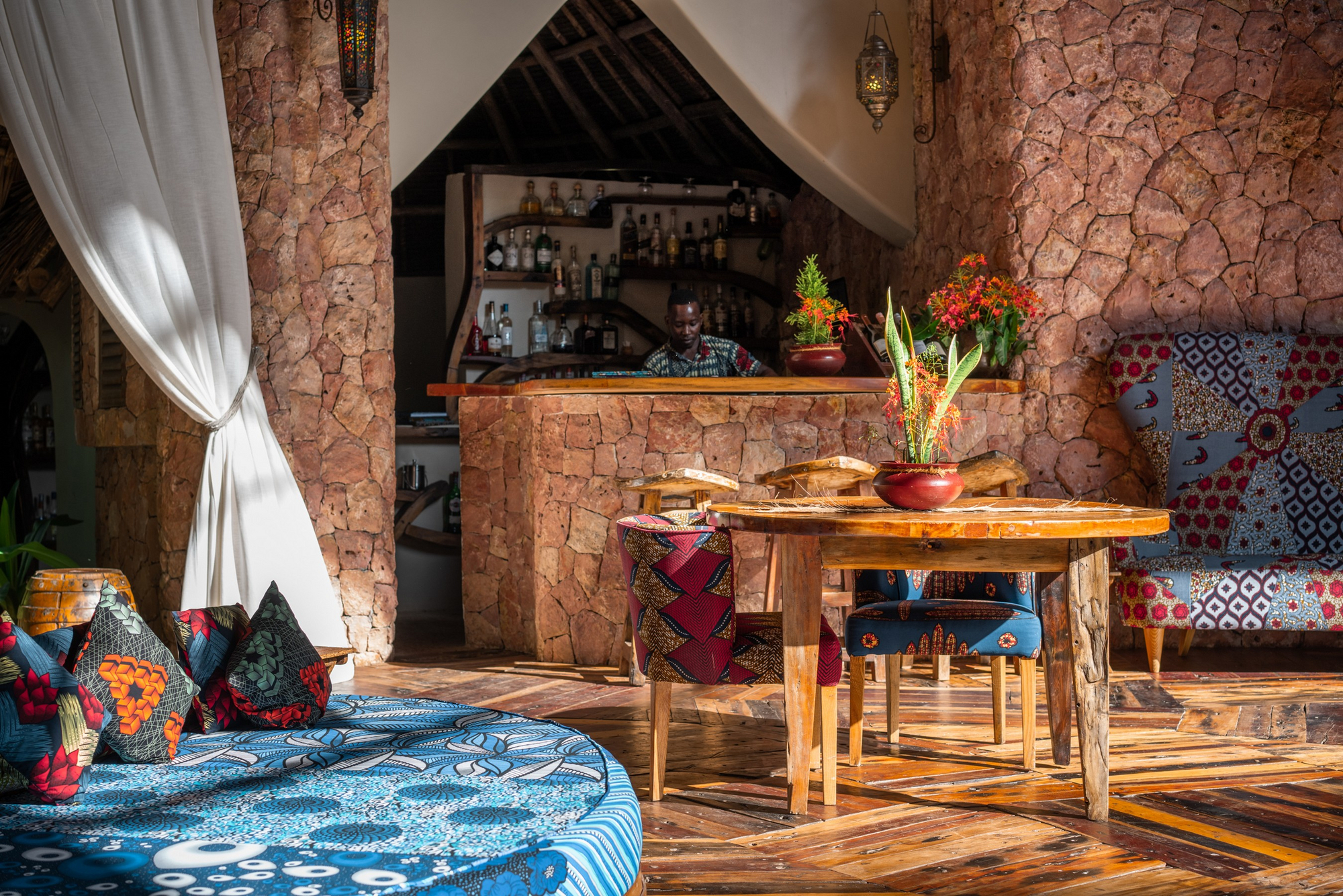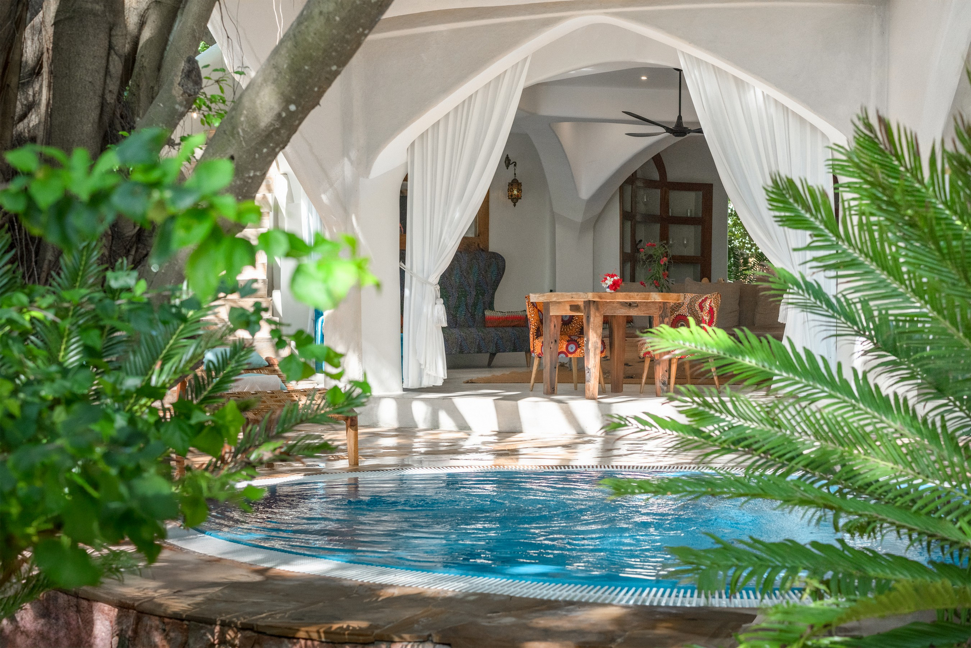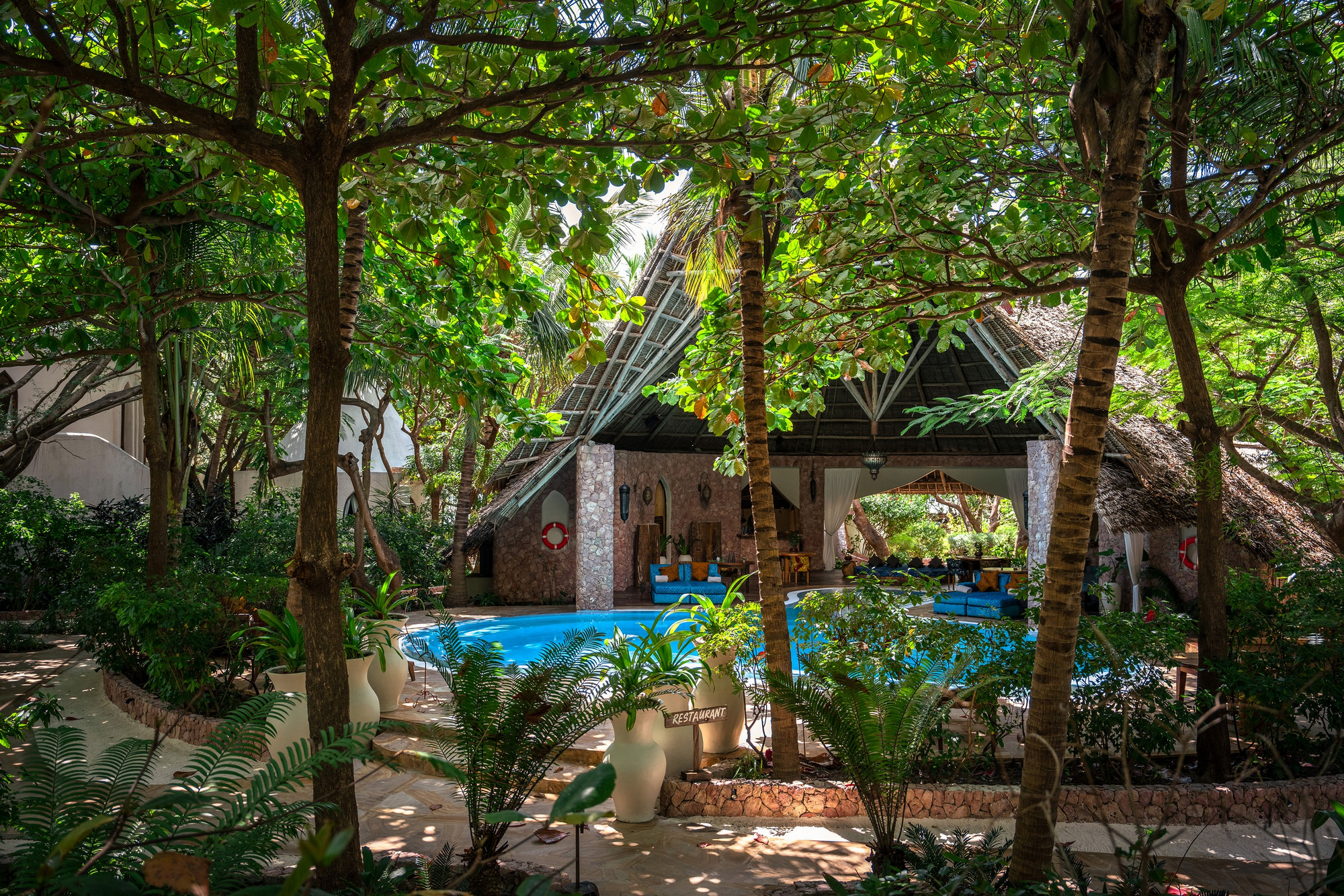 Das Restaurant serviert internationale und swahili-inspirierte Küche mit frischen Meeresfrüchten und lokalen Zutaten. Frühstück wird à la carte serviert; Mittag- und Abendessen sind flexibel gestaltbar. Private Dining in der Villa oder am Strand ist möglich. Getränke werden in der Lounge oder am Pool angeboten. Halb- oder Vollpension kann gebucht werden.
