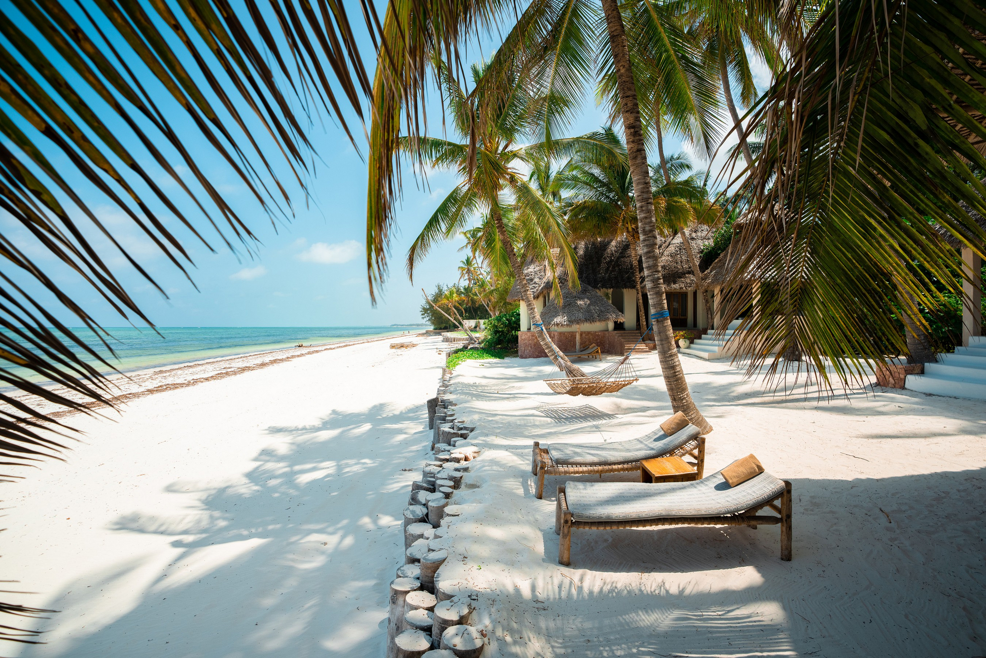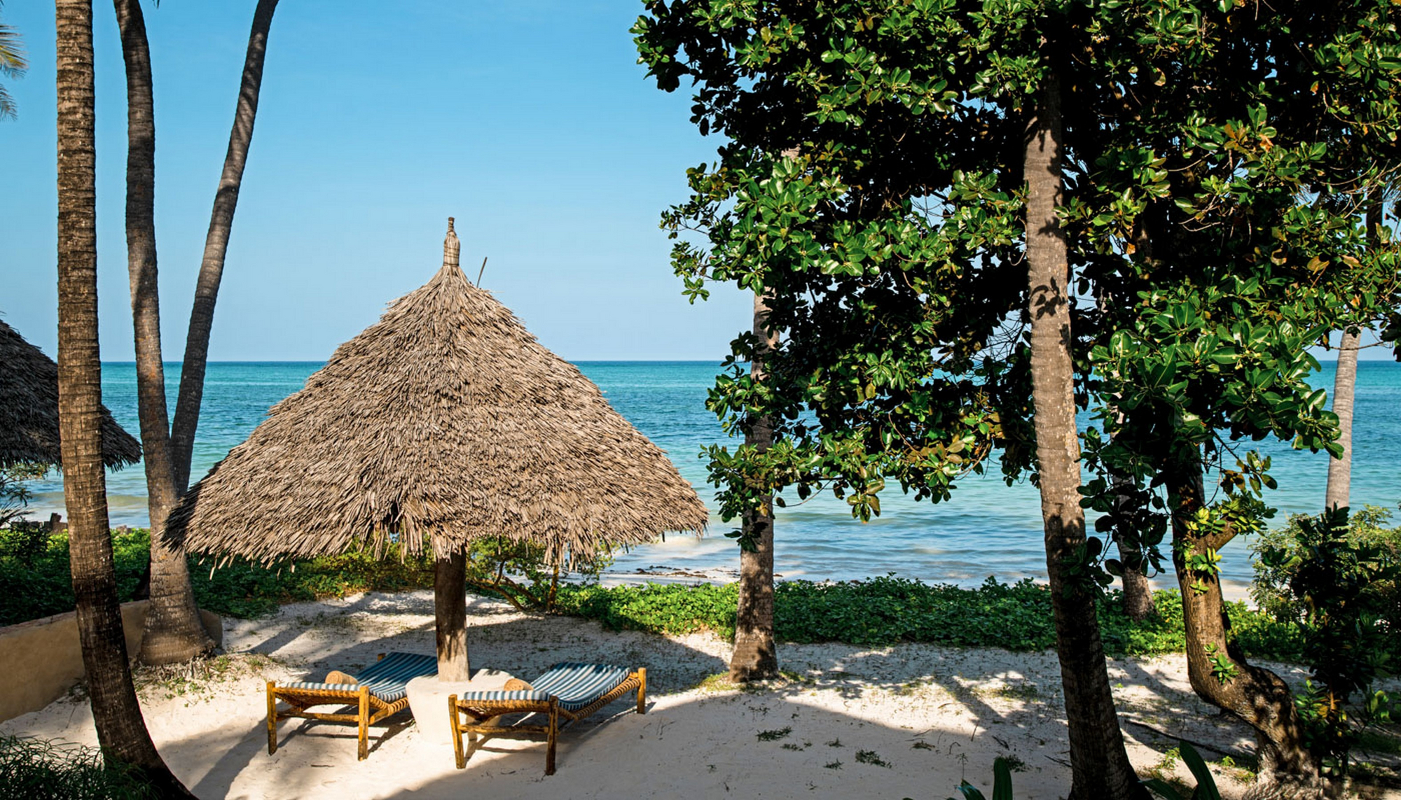 Tansania, Sansibar-Archipel, Insel Unguja, Südostküste bei Dongwe direkt am weißen Sandstrand des Indischen Ozeans.