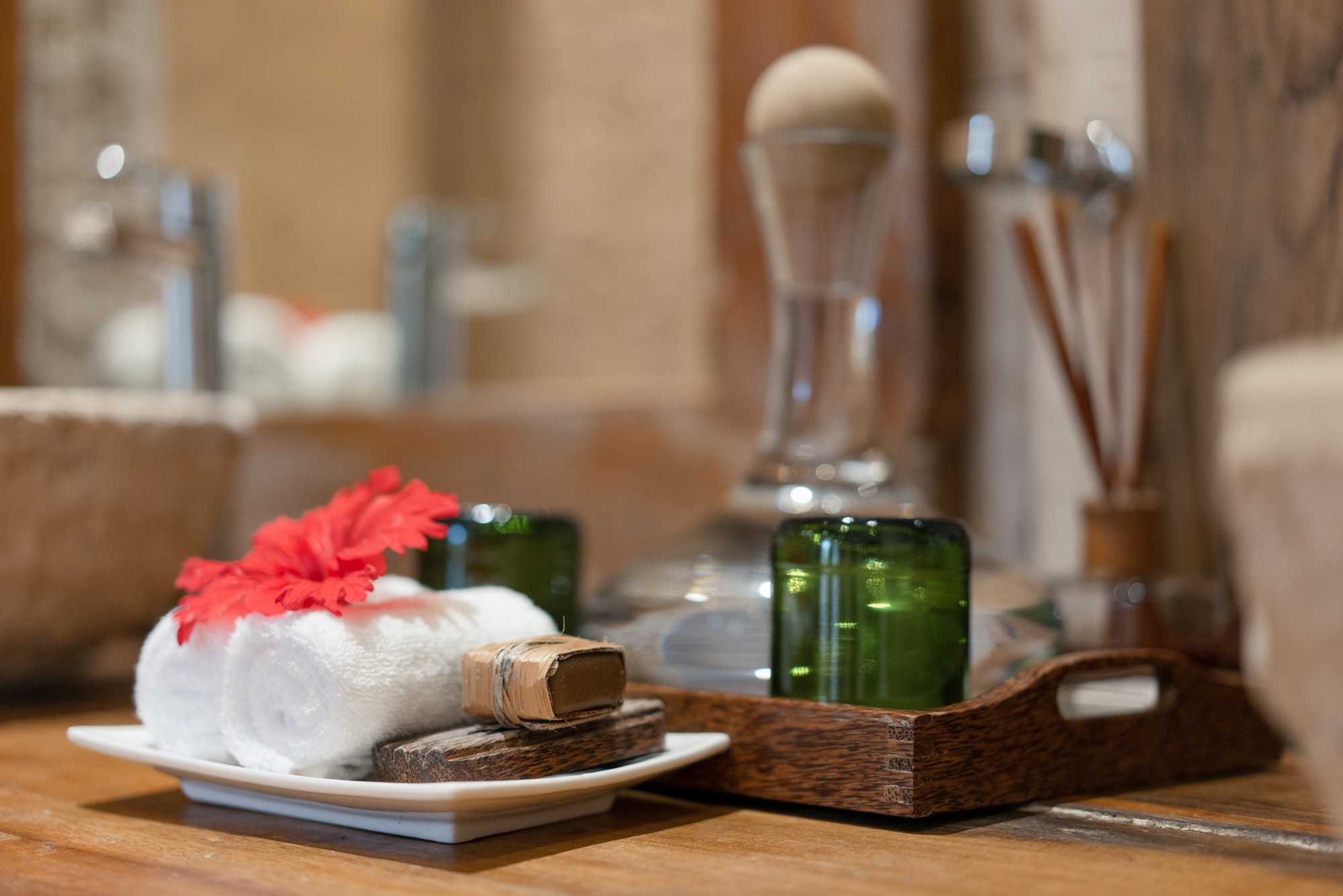Das Resort verfügt über ein Restaurant mit Meerblick, Lounge- und Barbereich, Infinity-Pool, Spa-Behandlungsräume, Yoga-Plattform, tropische Gartenanlagen, direkten Strandzugang, Concierge-Service, 24-Stunden-Rezeption, Bibliothek sowie WLAN im gesamten Resort. Wege aus Sand und Naturstein verbinden die Villen mit dem zentralen Bereich.