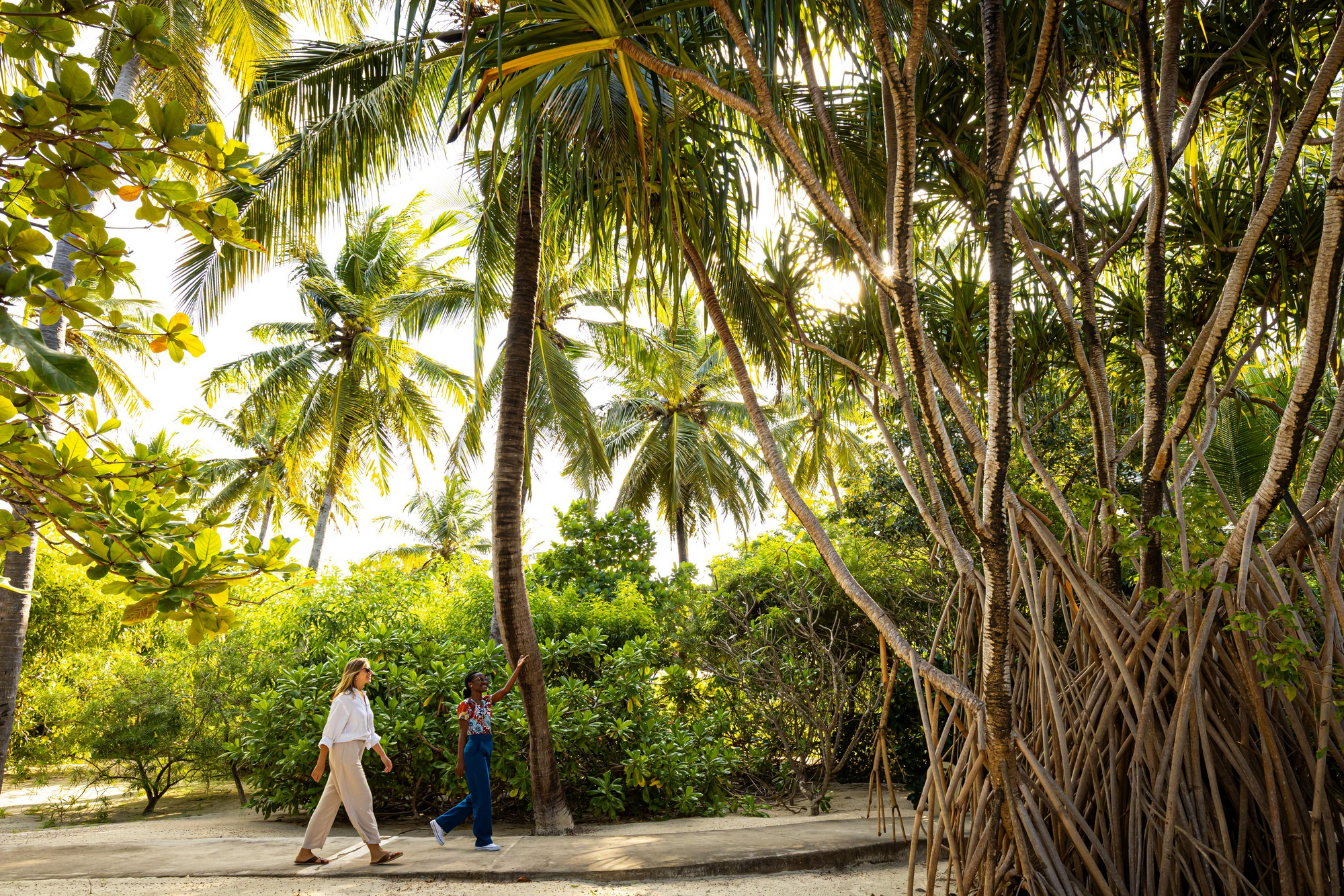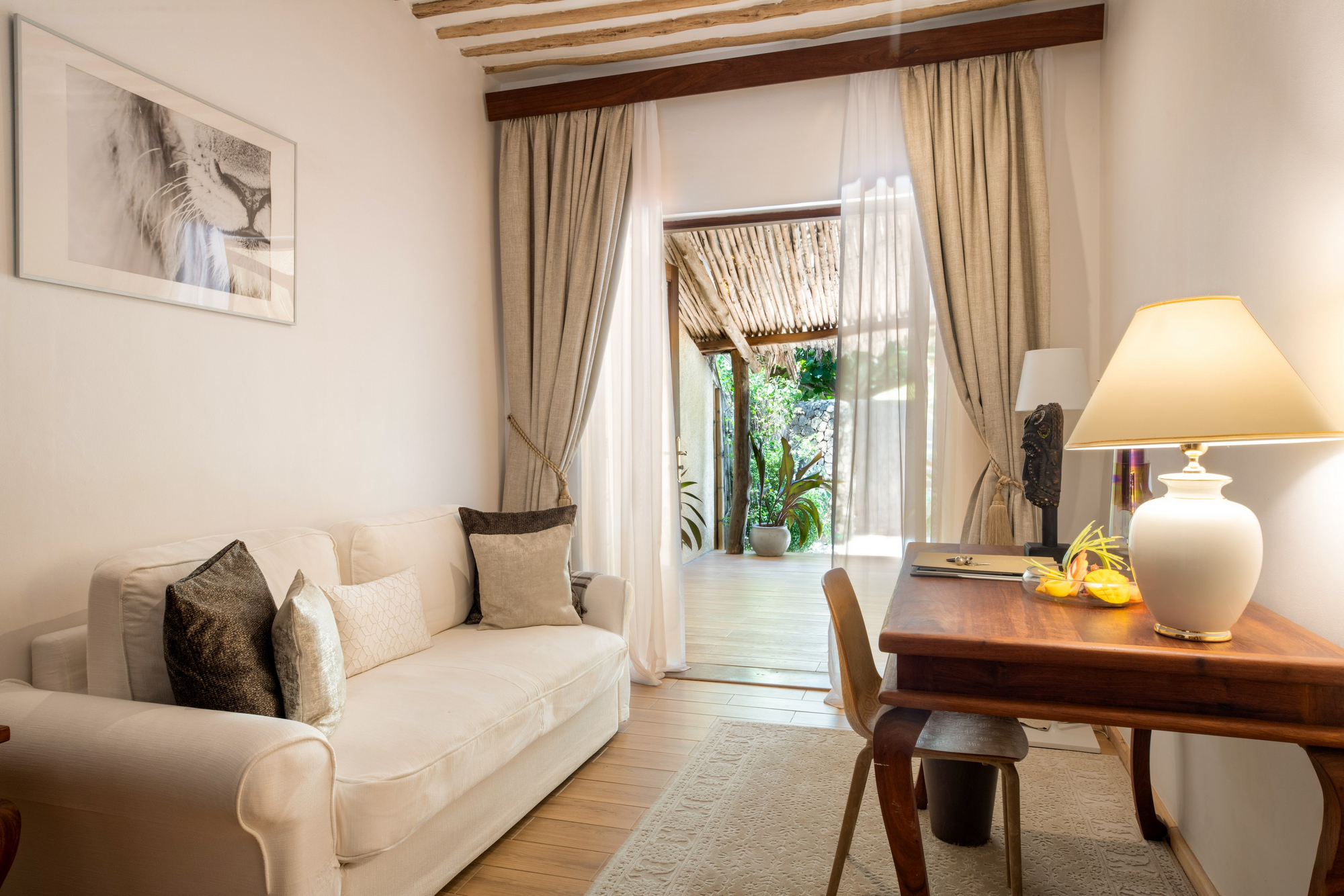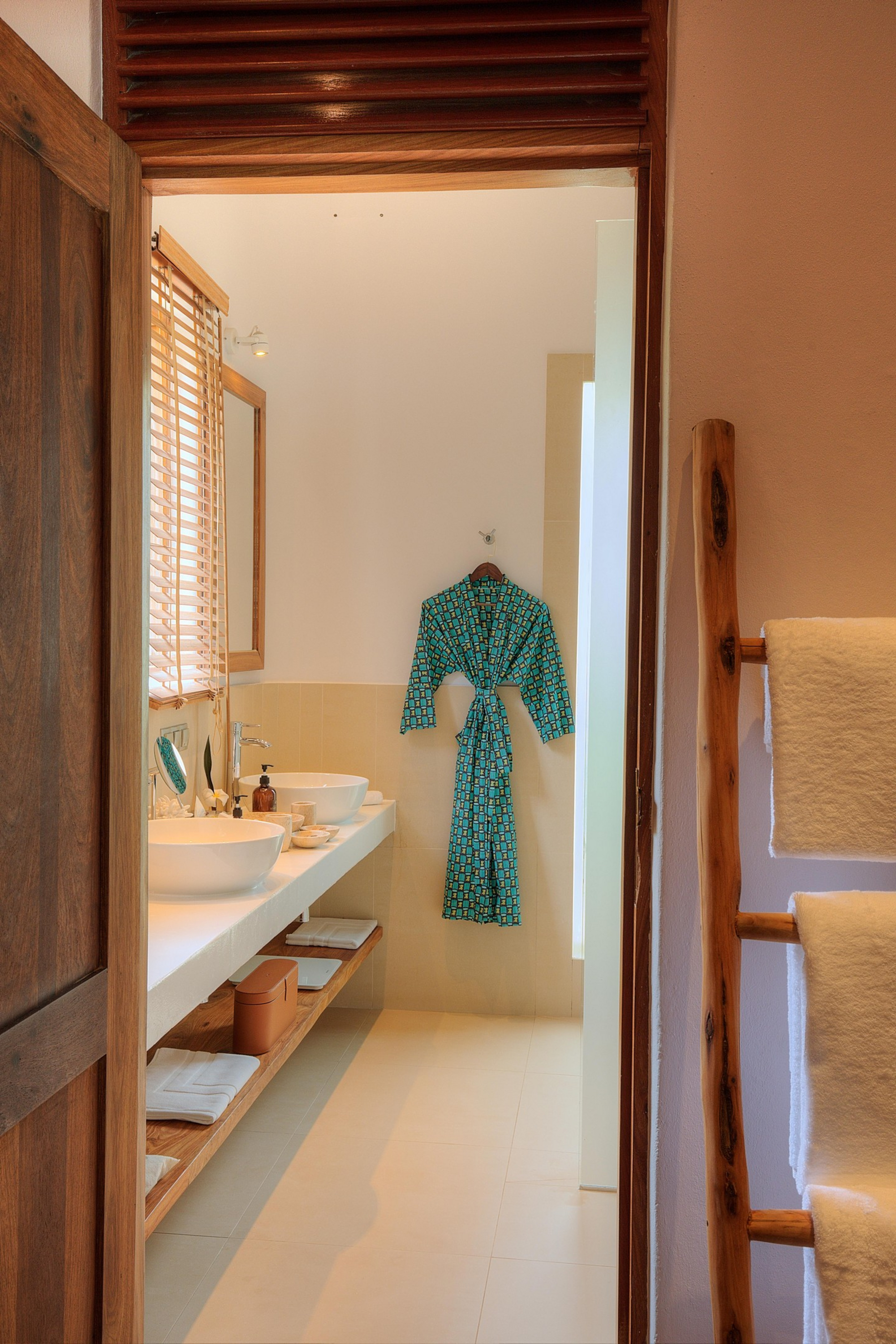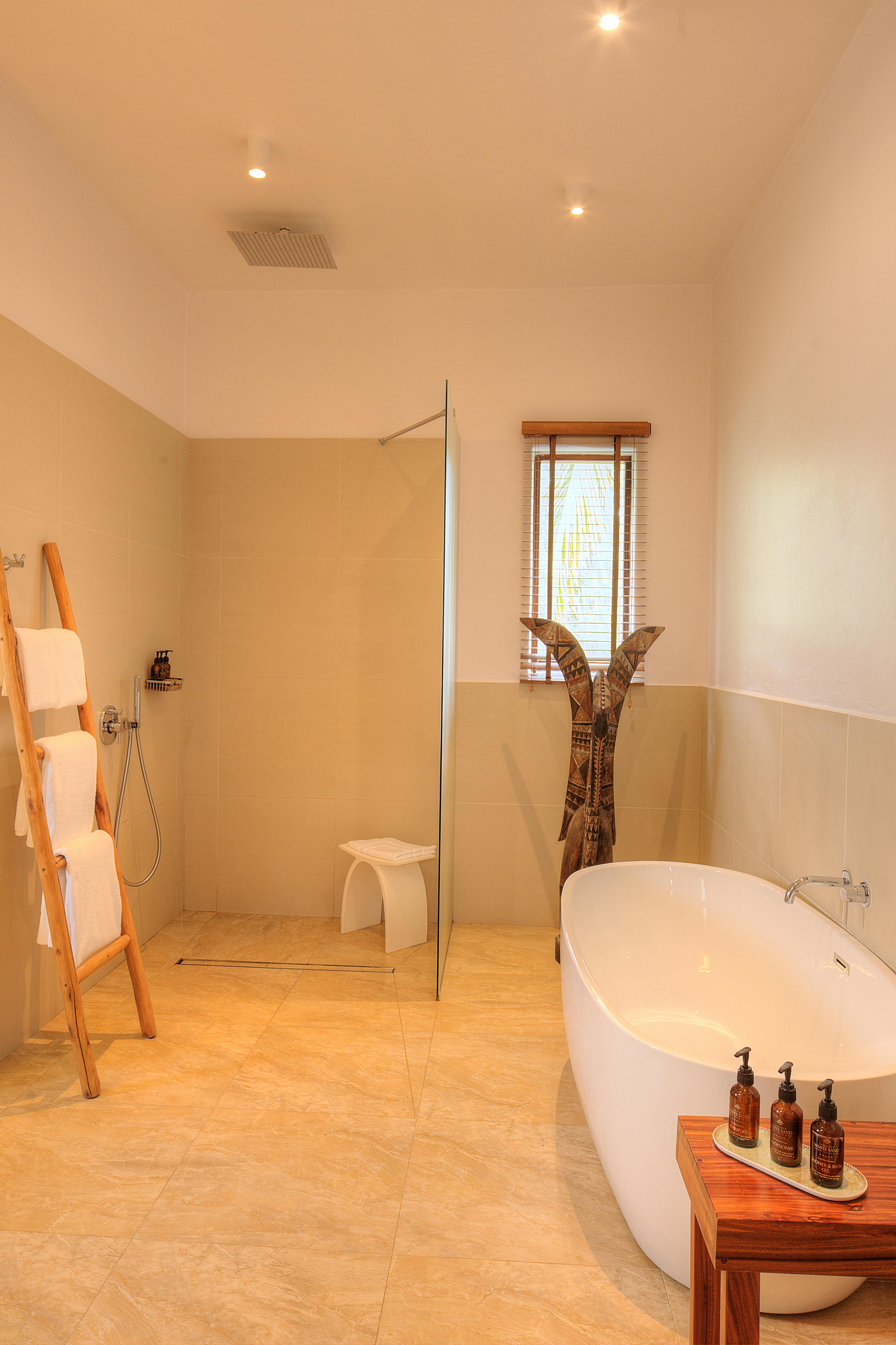 Die Anlage ist als weitläufiges Garten- und Strandresort konzipiert, in dem sich die öffentlichen Bereiche bewusst luftig und offen anfühlen. Kulinarisch gibt es zwei Restaurants sowie mehrere Bars, darunter eine Beach-Option und eine Rooftop-Champagnerbar für späte Nachmittage mit Blick über Palmen, Gärten und Richtung Ozean. Der Stil wirkt modern-tropisch und zurückhaltend elegant: helle, sandige Farbtöne, viel Naturmaterial, Textilien in ruhigen Beige- und Weißnuancen und Akzente, die das Meereslicht aufnehmen.