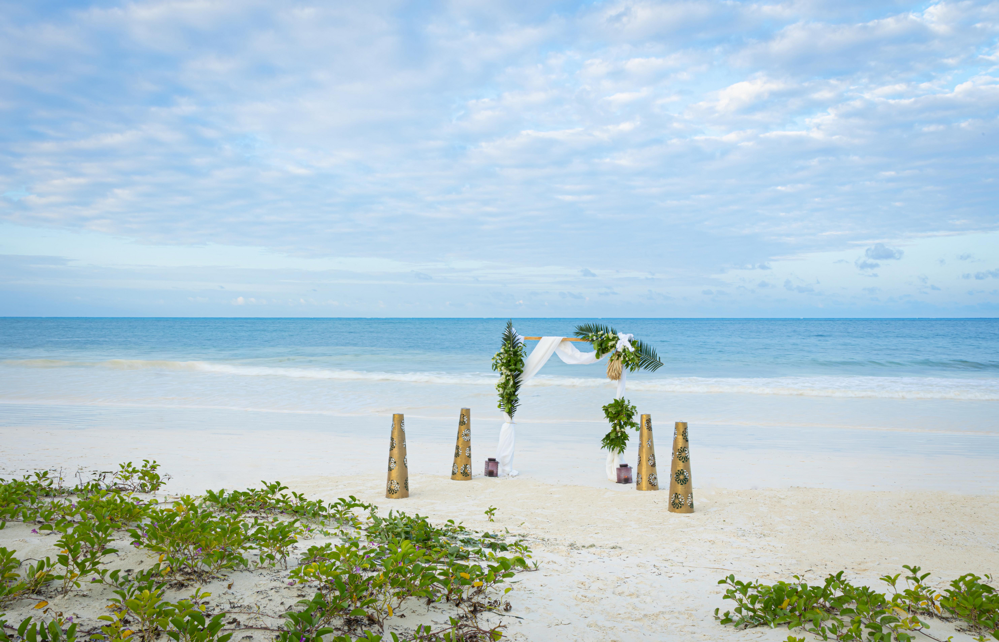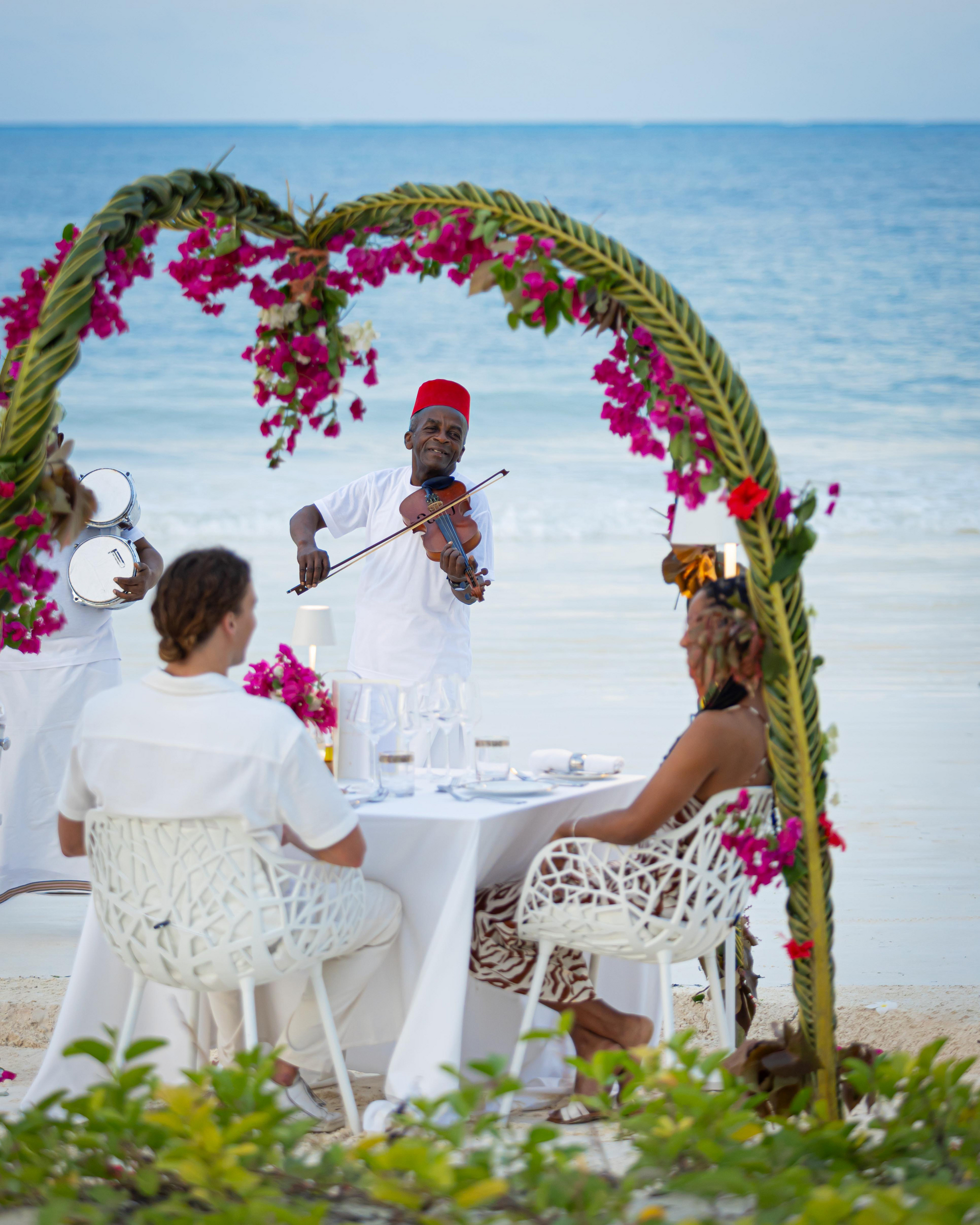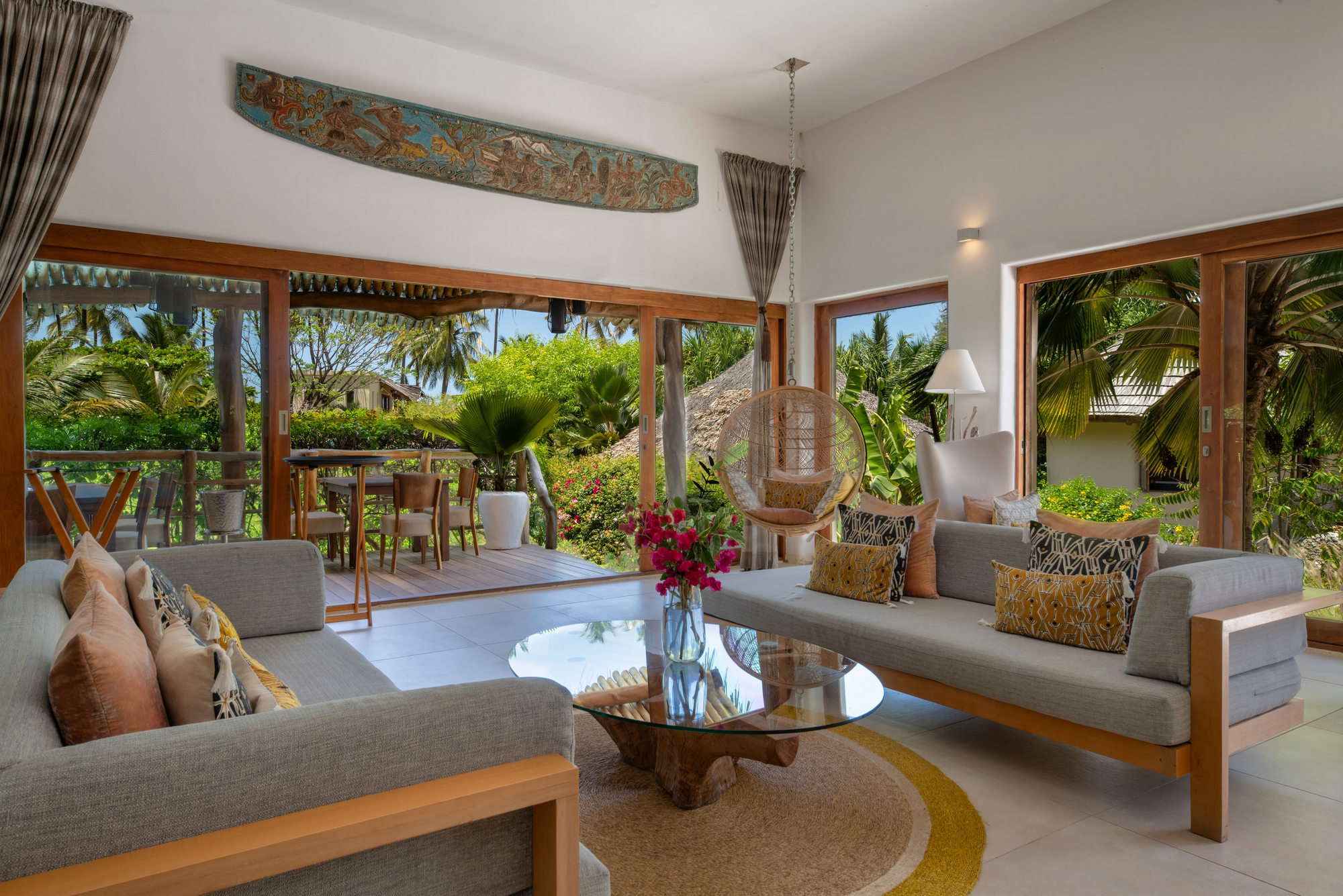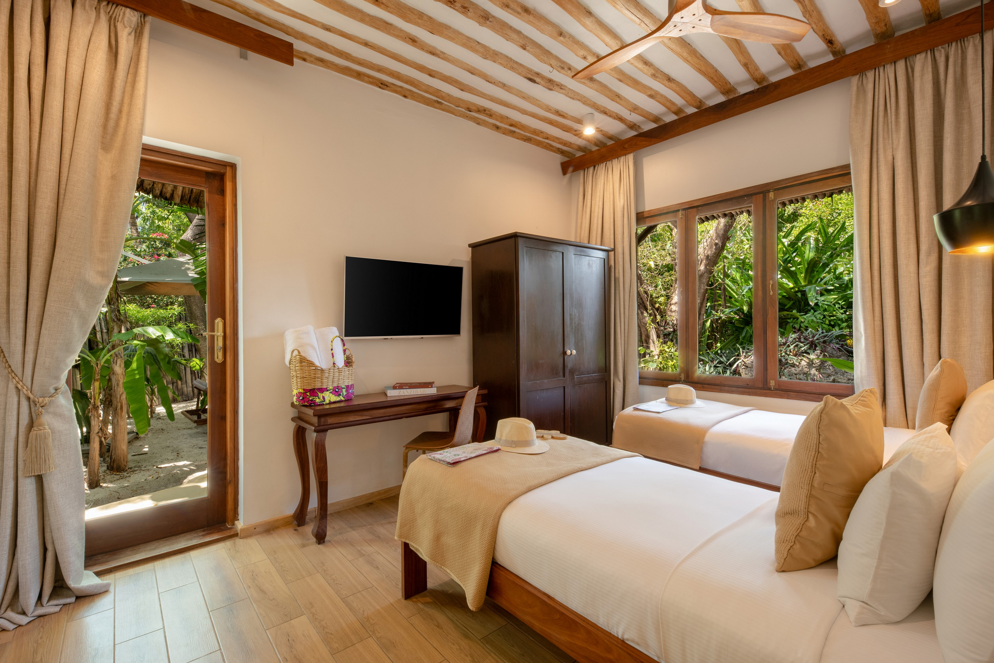 Die Anlage ist als weitläufiges Garten- und Strandresort konzipiert, in dem sich die öffentlichen Bereiche bewusst luftig und offen anfühlen. Kulinarisch gibt es zwei Restaurants sowie mehrere Bars, darunter eine Beach-Option und eine Rooftop-Champagnerbar für späte Nachmittage mit Blick über Palmen, Gärten und Richtung Ozean. Der Stil wirkt modern-tropisch und zurückhaltend elegant: helle, sandige Farbtöne, viel Naturmaterial, Textilien in ruhigen Beige- und Weißnuancen und Akzente, die das Meereslicht aufnehmen.