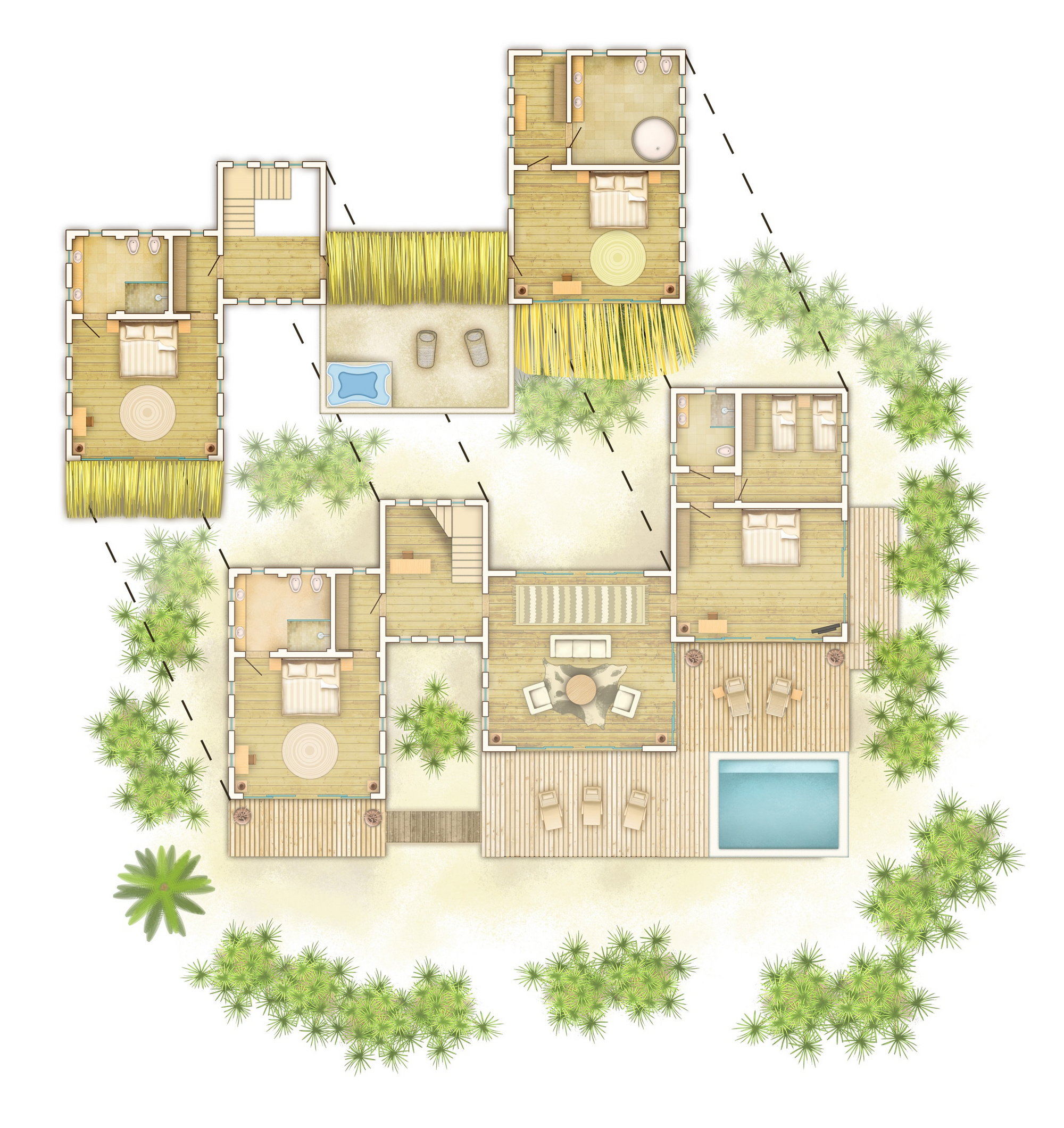 Garden Villa 3 x with Pool / Garden Villa 4 x with Hot Tub: Villen im Gartenbereich mit starkem Fokus auf Abgeschiedenheit und Ruhe, je nach Kategorie mit privatem Pool oder Hot Tub. Für Gäste, die Privatsphäre und Villenkomfort möchten, aber nicht zwingend direkte Beachfront benötigen. Cinnamon Rooms und Cinnamon Family Room